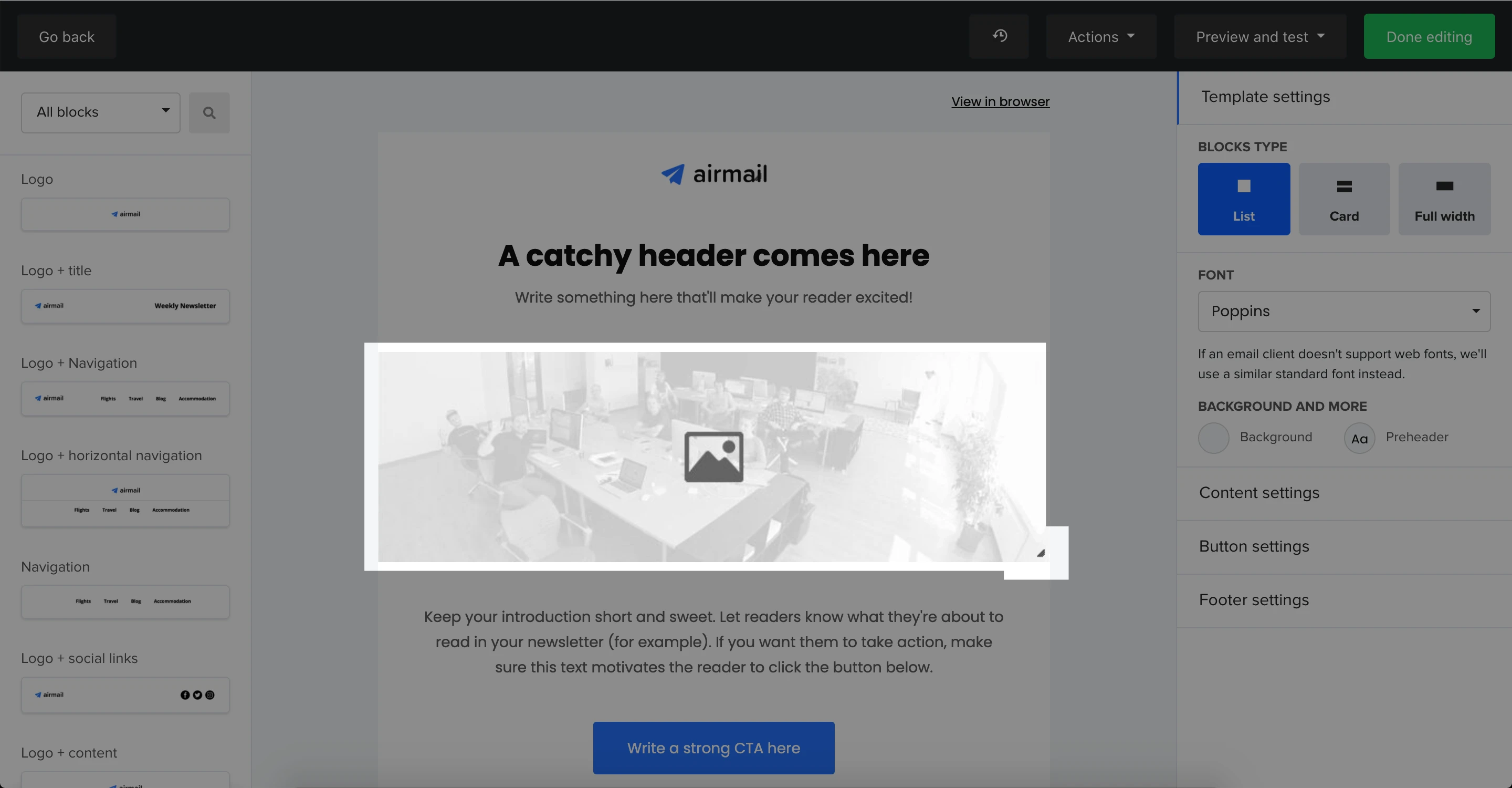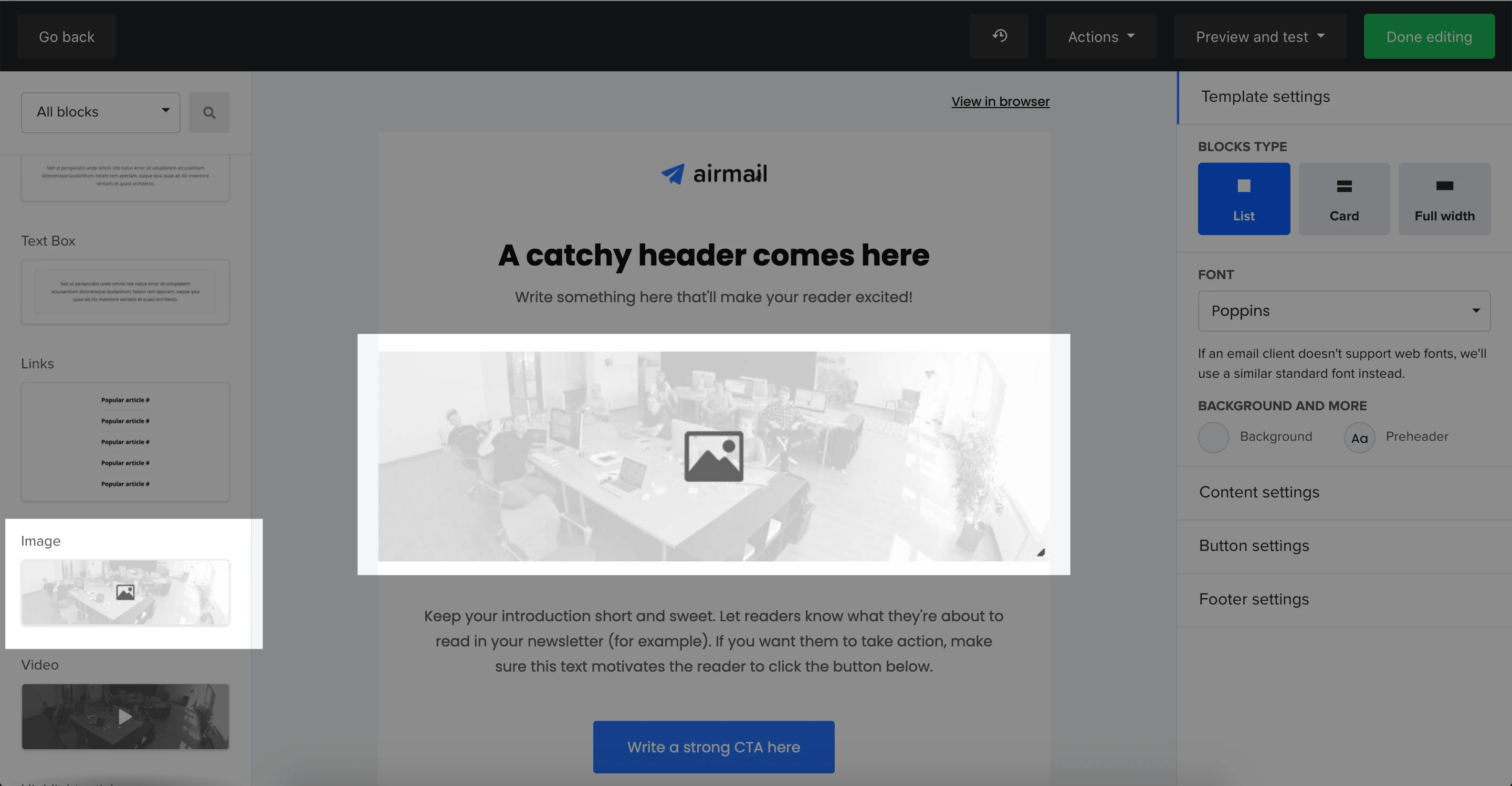 To add an image directly to your newsletter, first, drag the image block of your choice into your newsletter template from the left-hand sidebar.