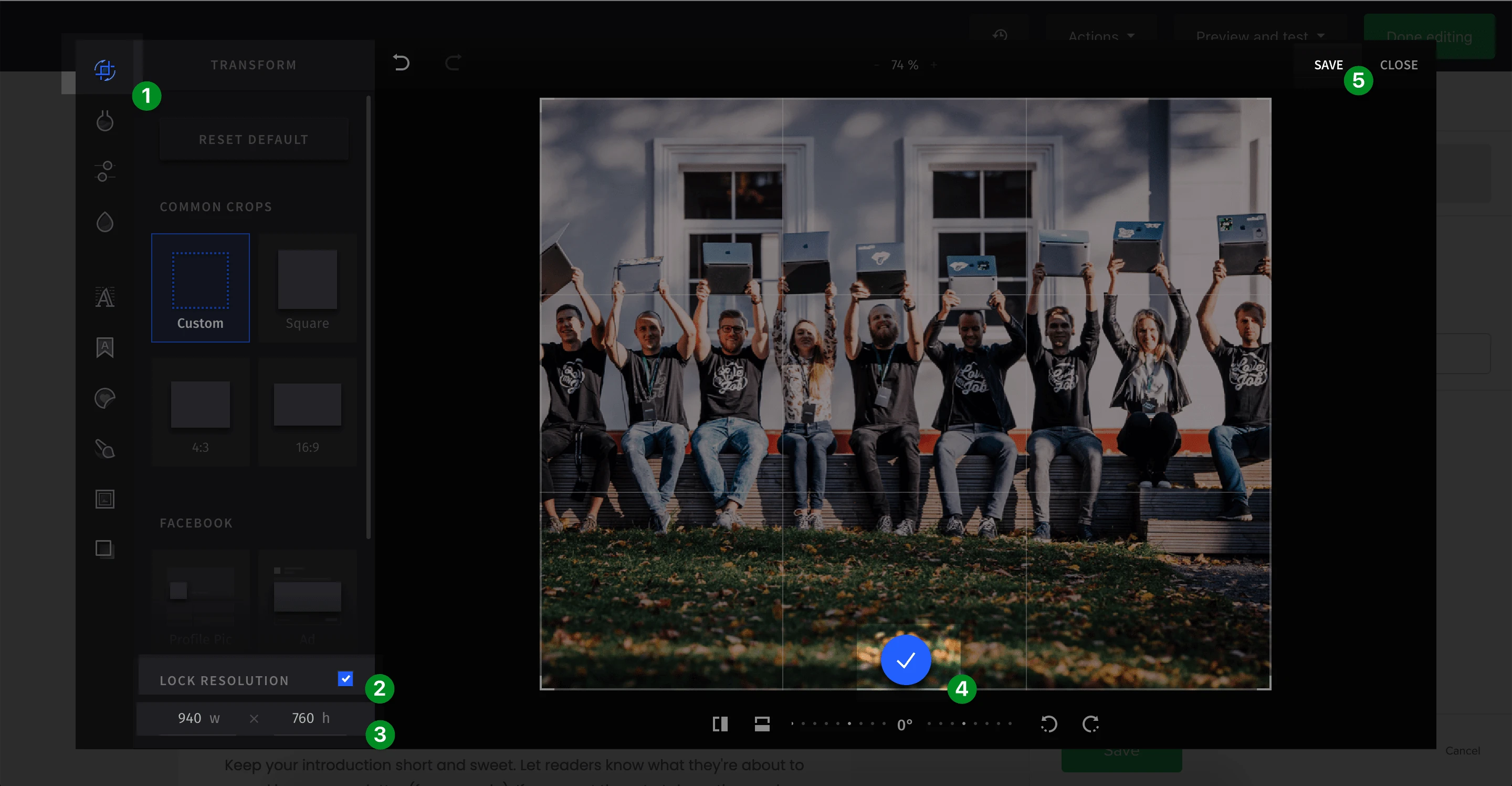 Background images for each block have the option to be edited using our image editor. To open the image editor, select the image block containing the background image you want to edit. Then, in the sidebar, click Edit image.