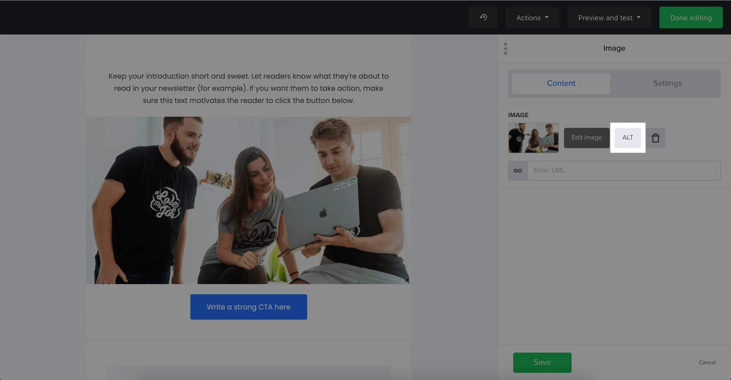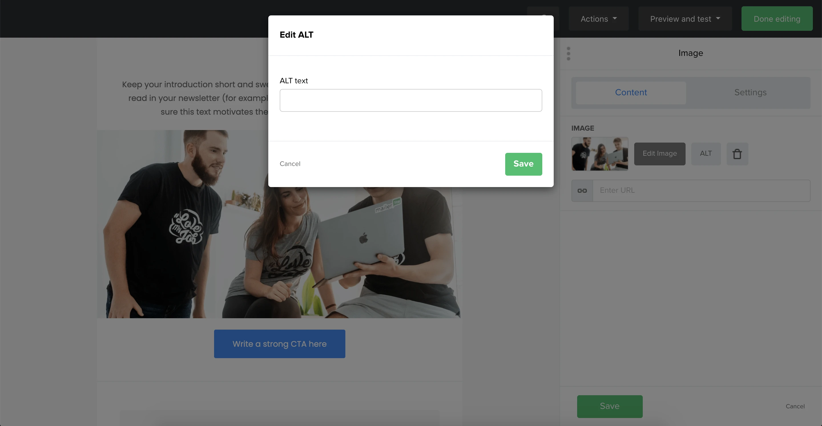 In the Drag & drop editor and Rich text editor, you can see that there's an icon for entering the ALT value, which is an alternative text displayed if the image file cannot be loaded. Click the ALT icon to edit the alternative text.