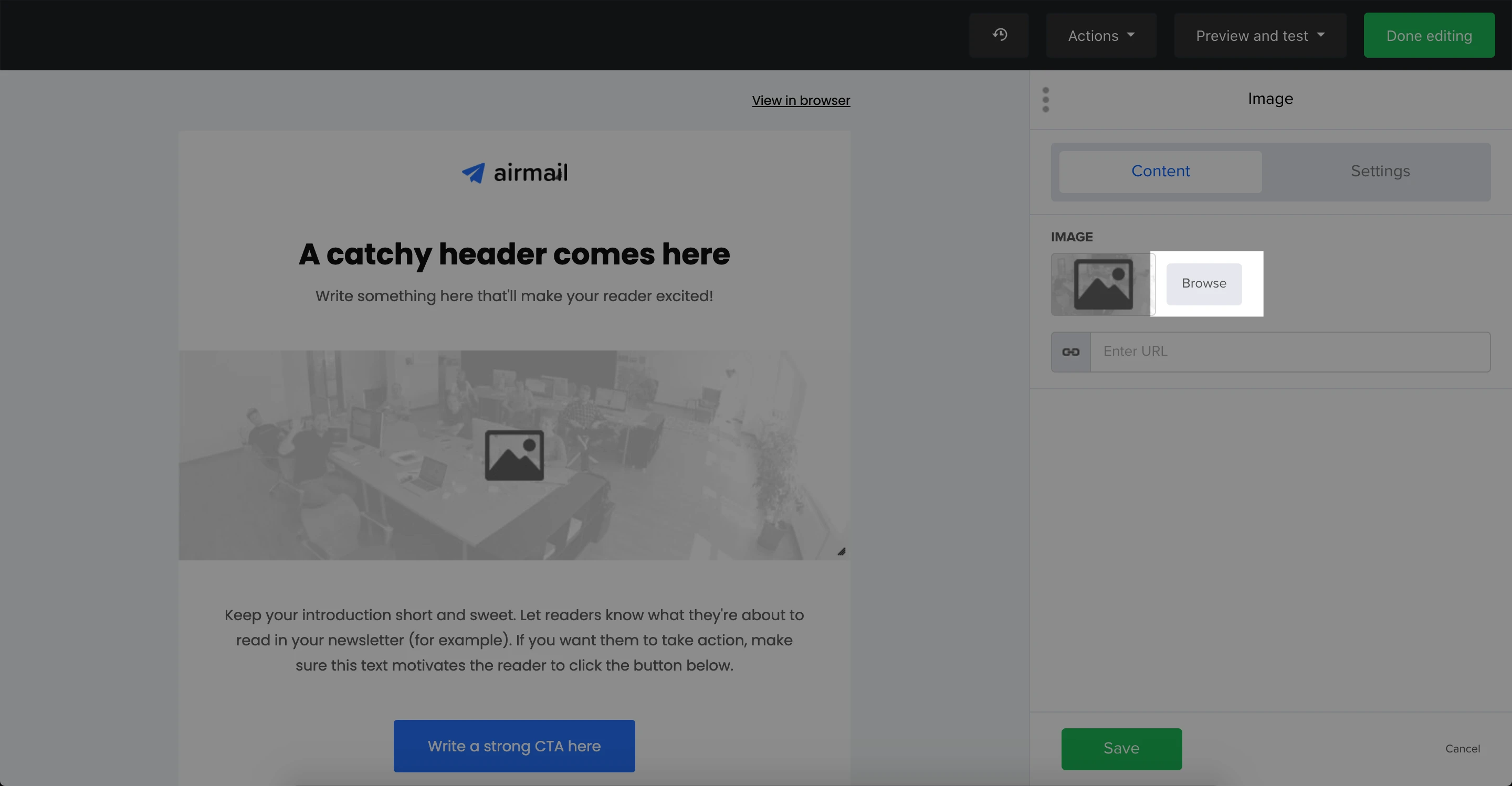 This will add an image block to the body of your newsletter. Click the image block and click Browse in the right-hand sidebar to open your file manager.