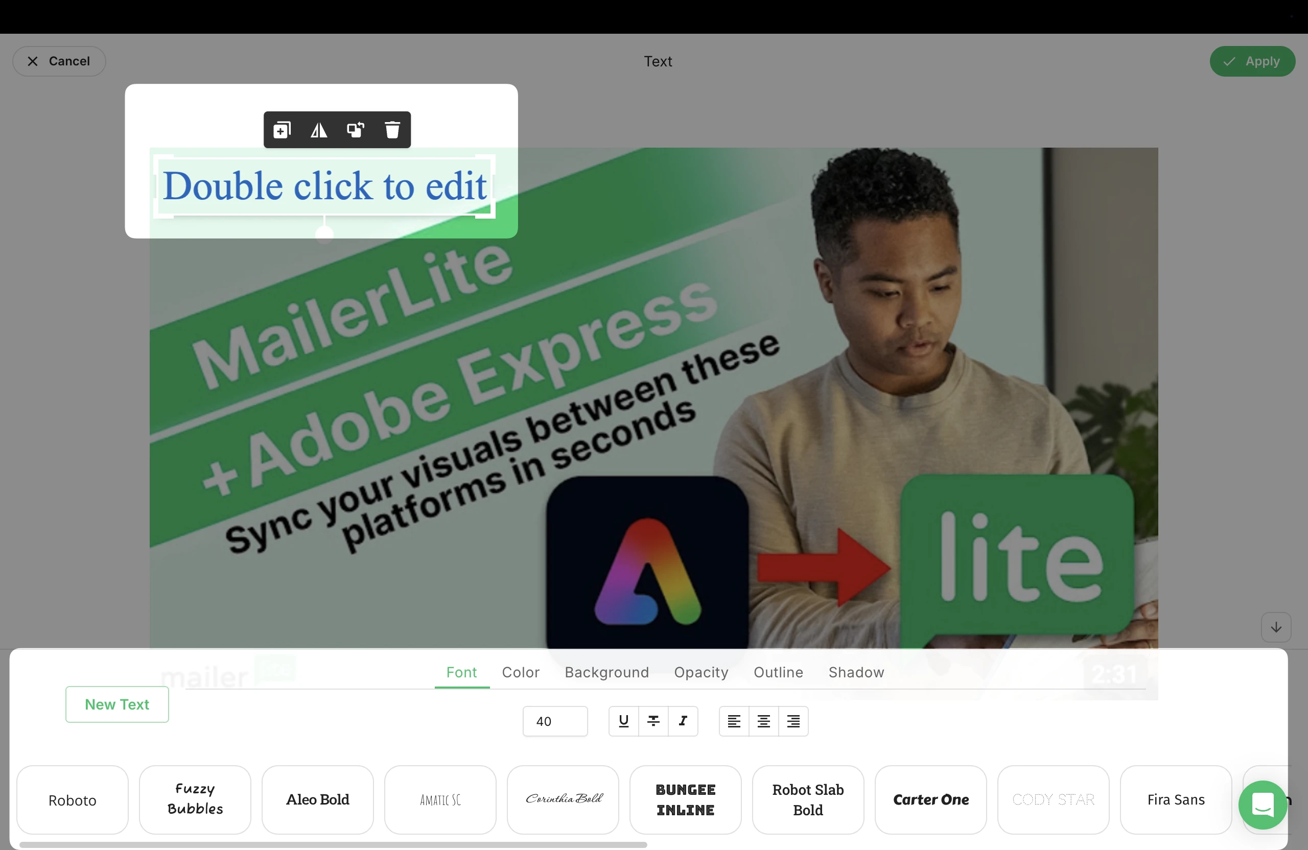 • Text: Add text with customizable fonts, sizes, colors, backgrounds, borders, shadows, and more. You can also upload custom fonts to match your brand.