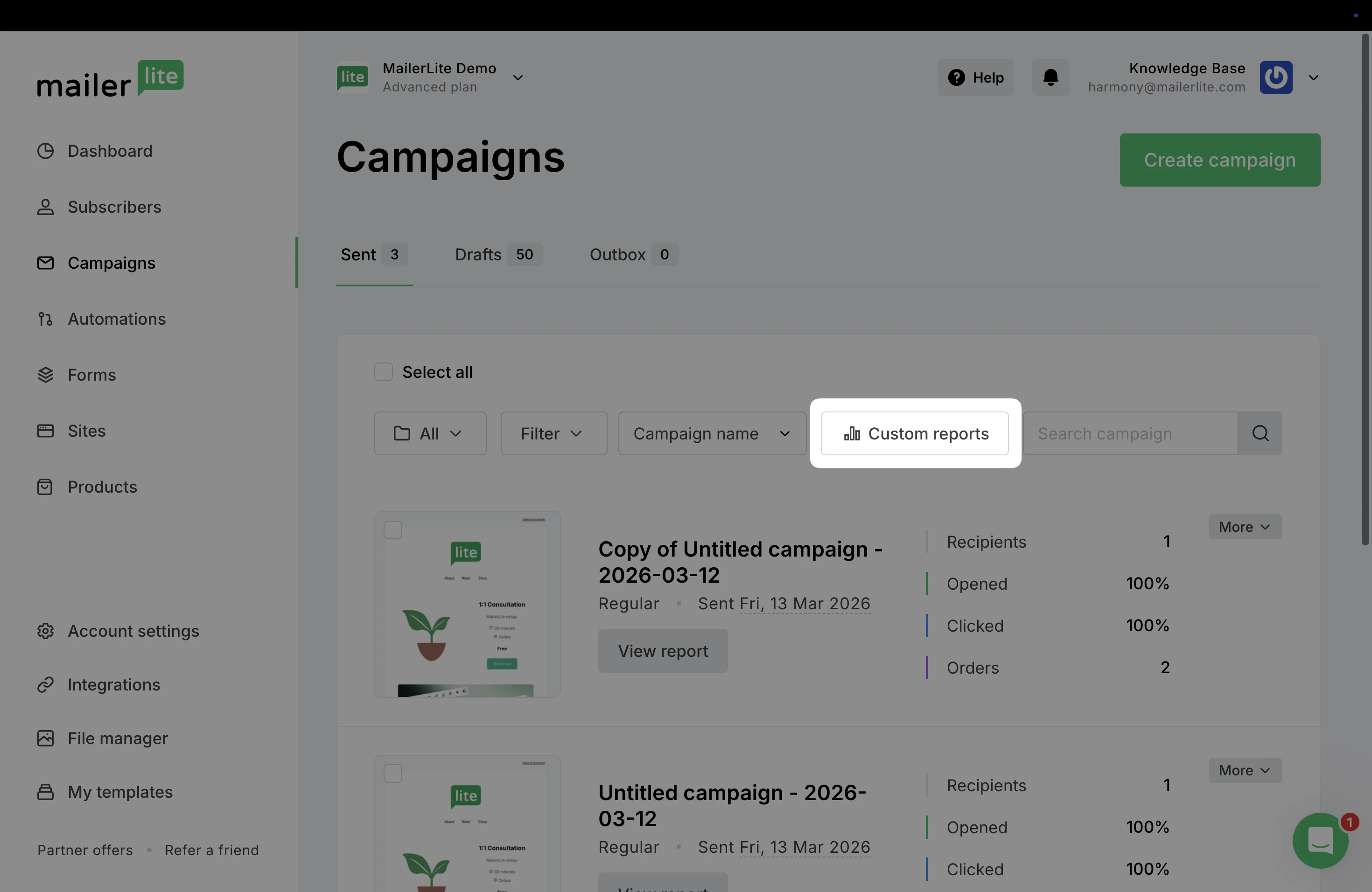 From the Campaigns tab, click Custom reports.