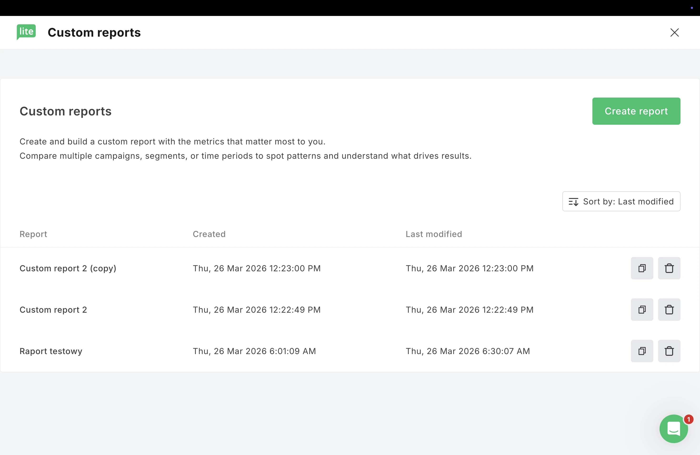 2. Past reports will be shown in the list. To create a new report, click Create report.