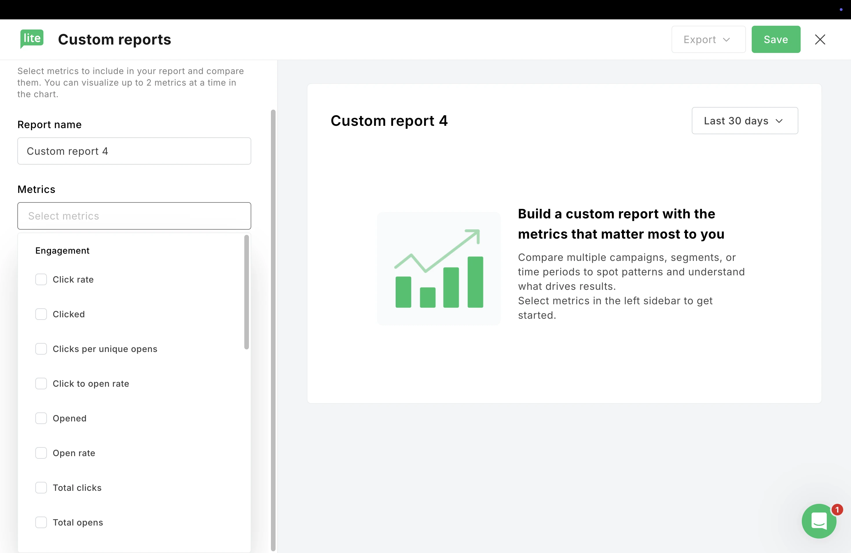 Categories like Engagement show metrics such as Open Rate, Click Rate, or Total Clicks.Â