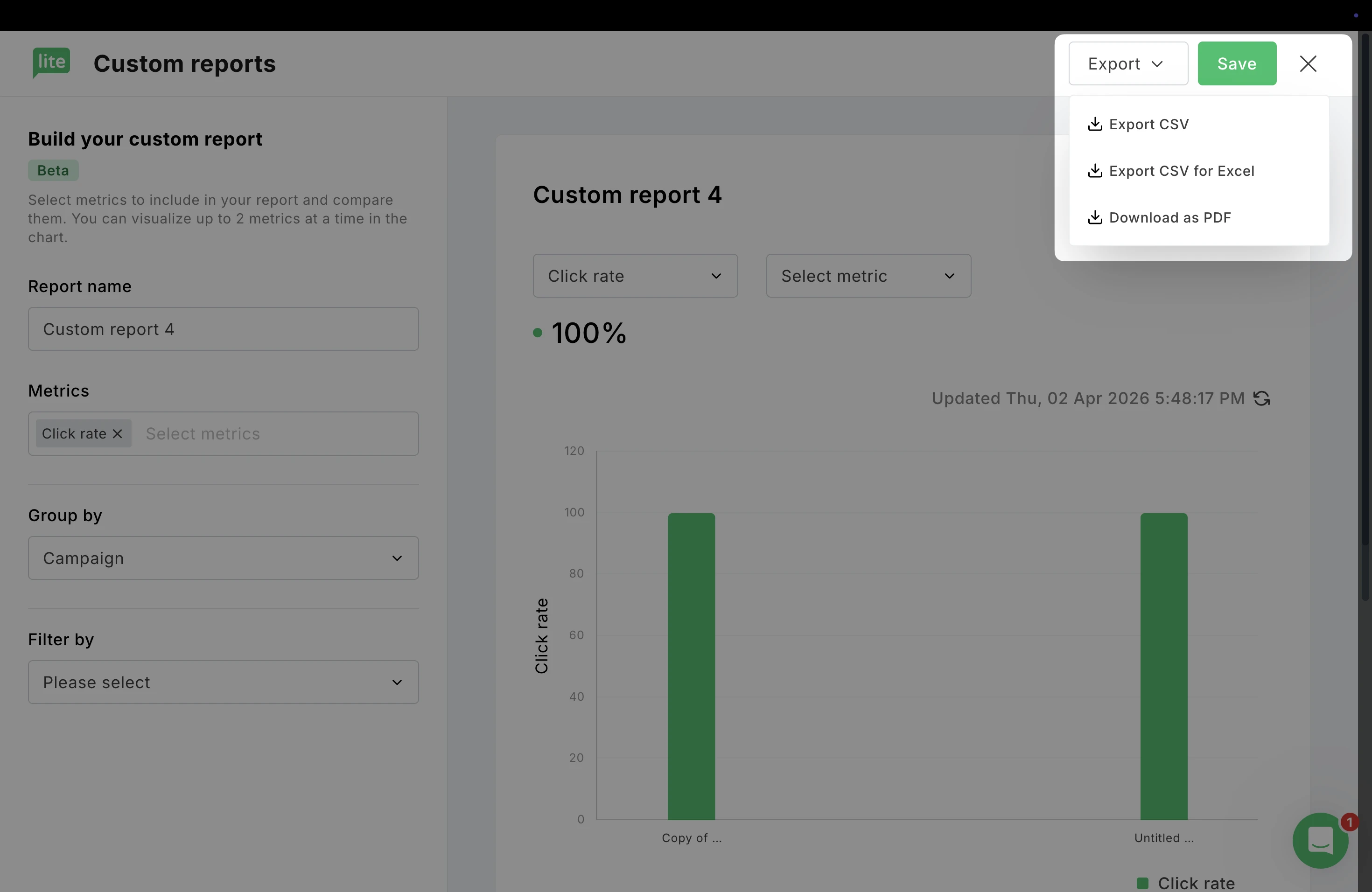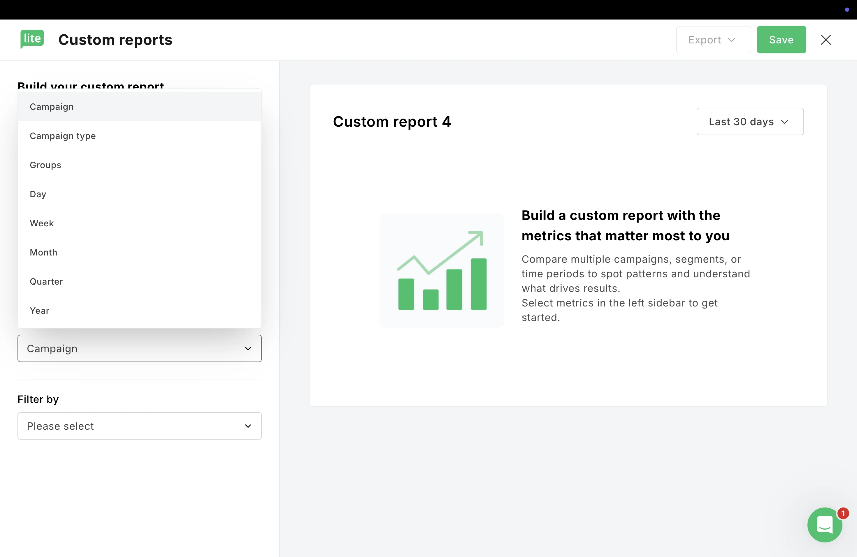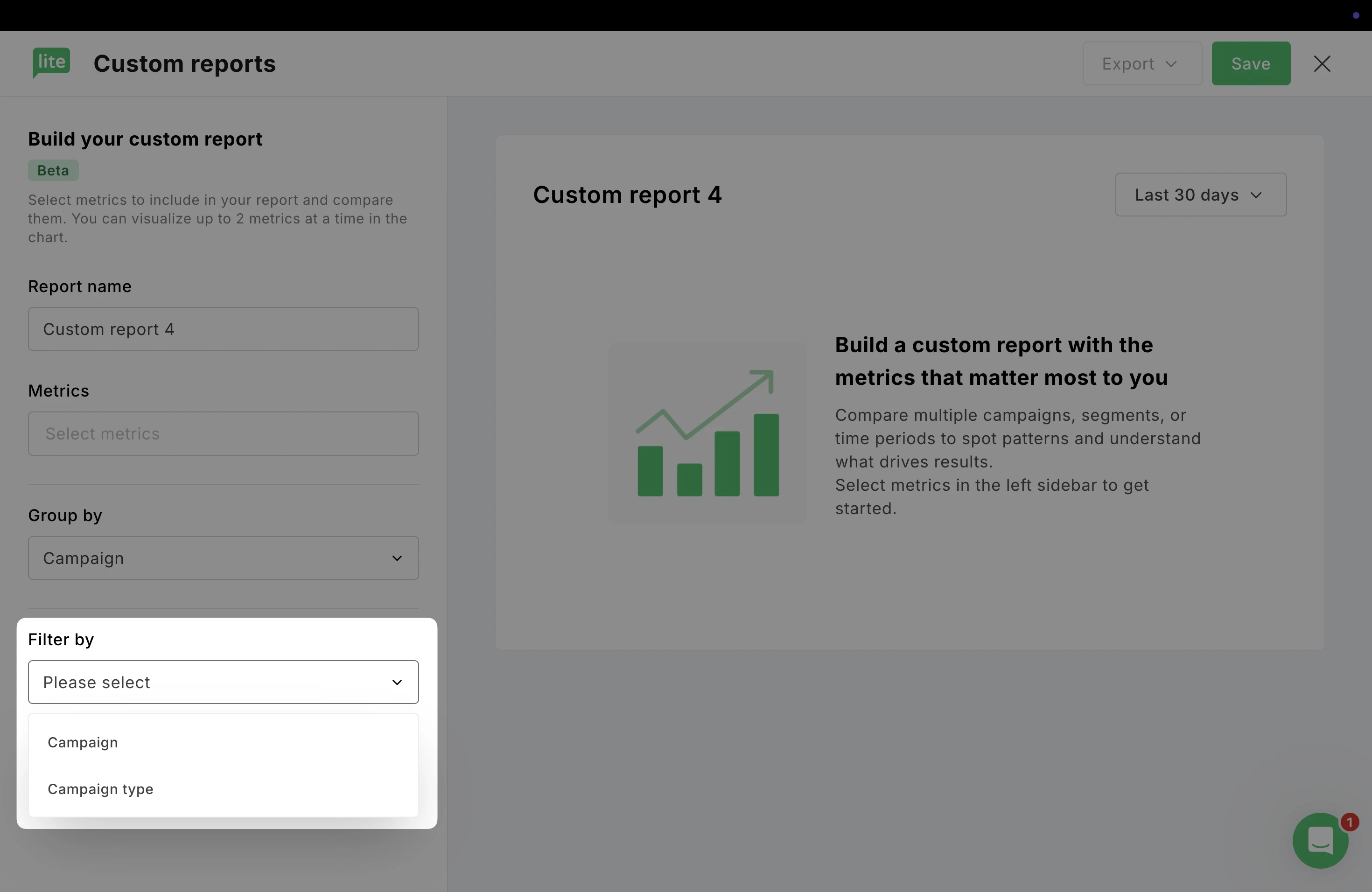 Below the grouping options, you’ll see Filter by. This allows you to narrow your data to specific campaigns or segments so you can focus only on what’s relevant to your analysis.