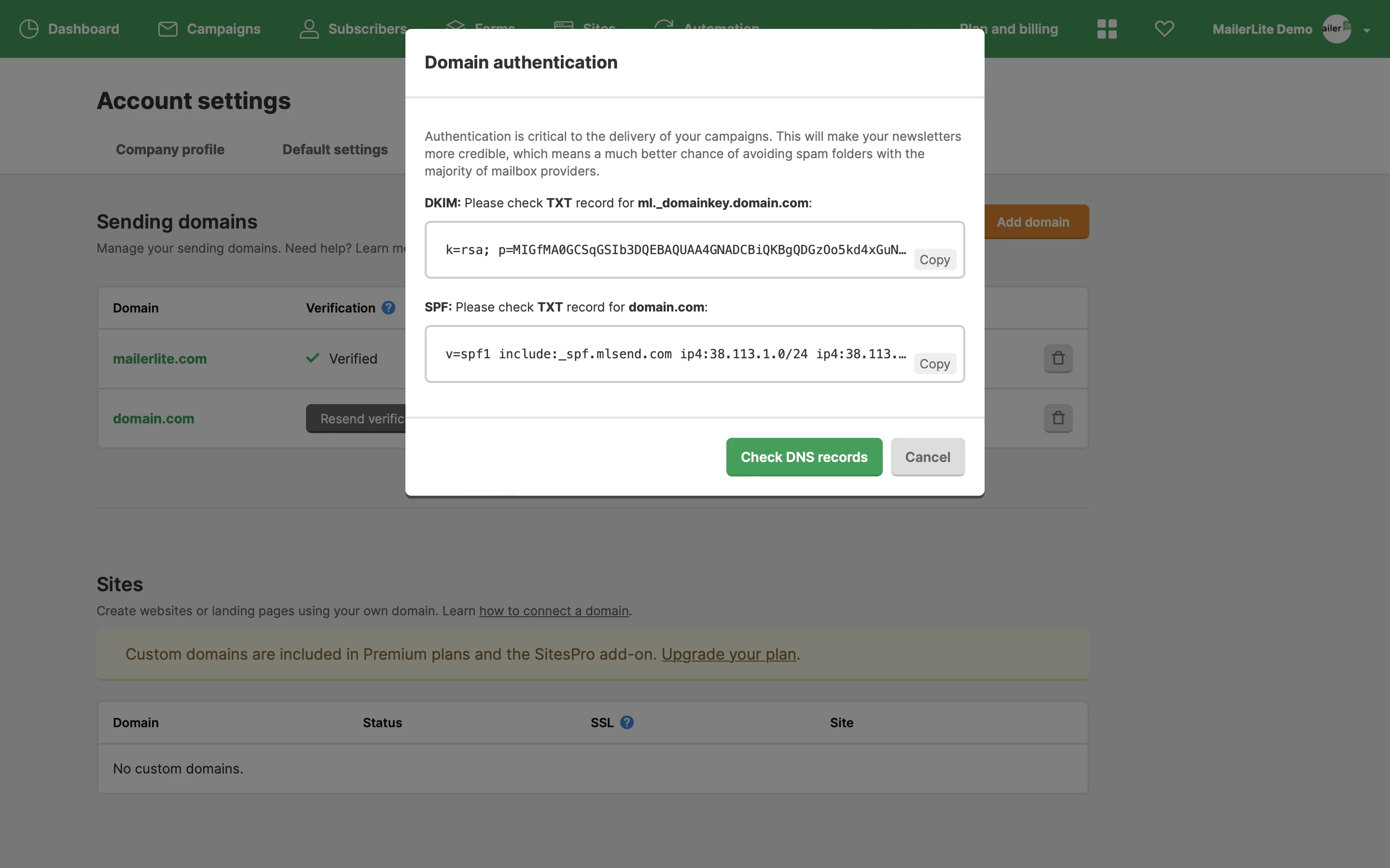 Head back to the authentication window in your MailerLite account and click on the green Check DNS records button. Once both records are approved, your new domain will be displayed as Authenticated ✅.
