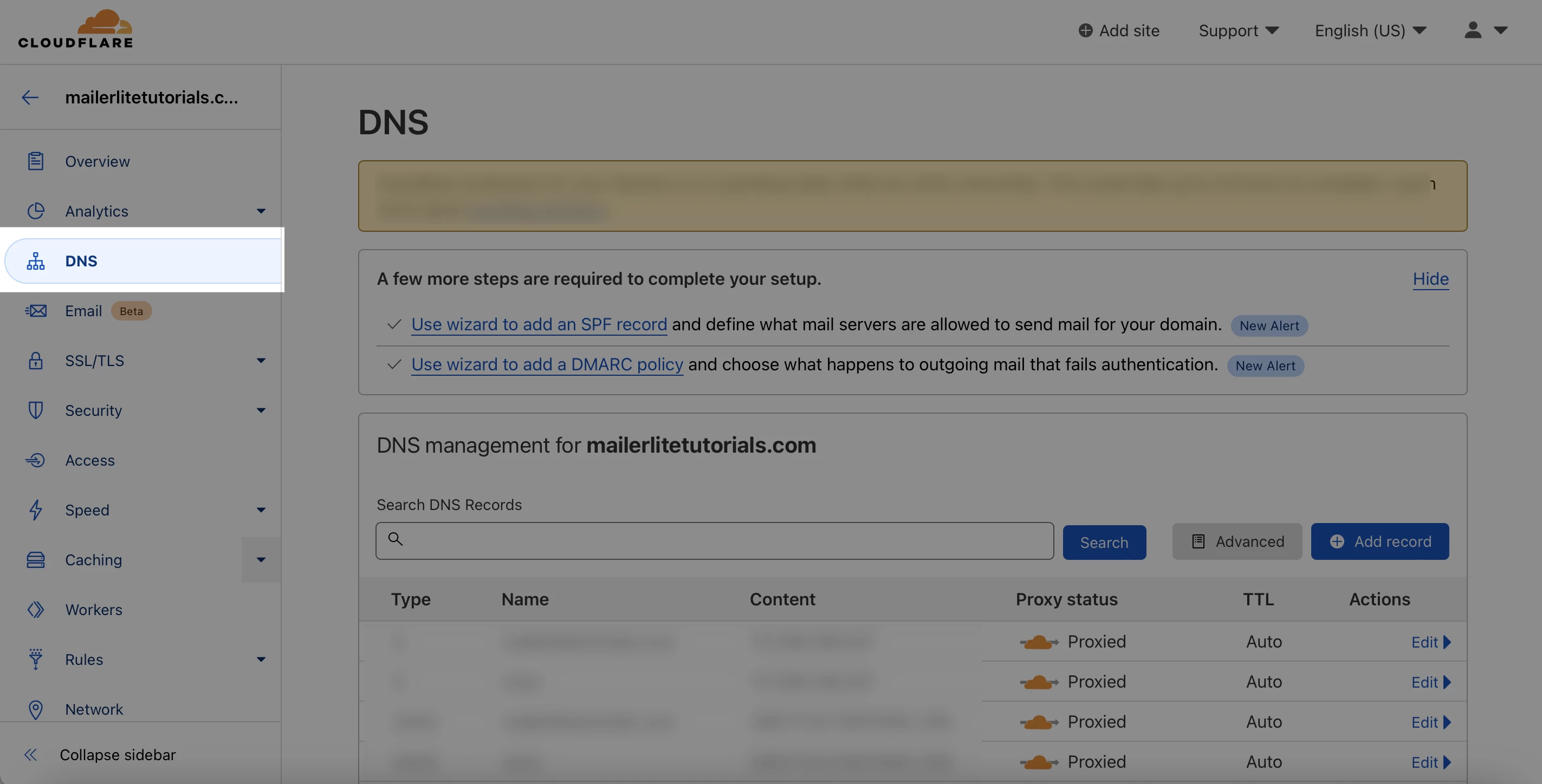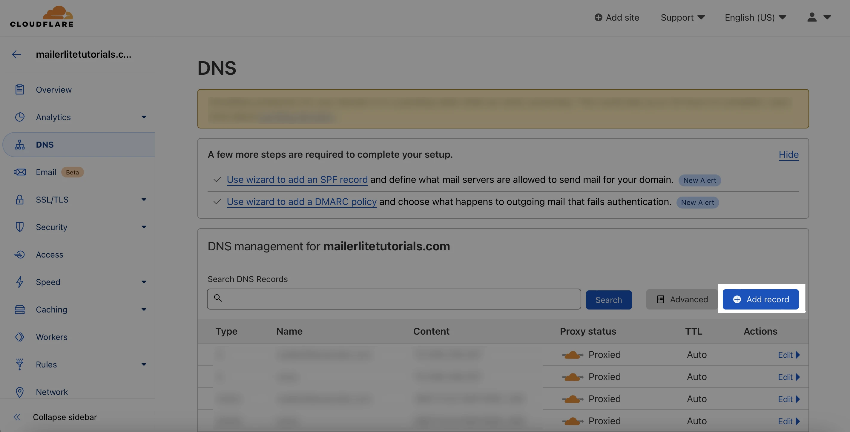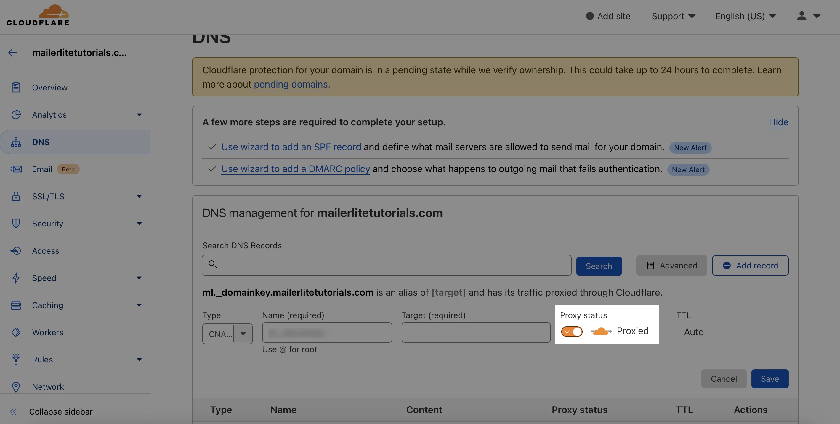 Toggle the Proxy status OFF. Make sure that MailerLite records are set to “DNS only” and NOT “proxied” as they will only be accepted by MailerLite if they are set to DNS only.