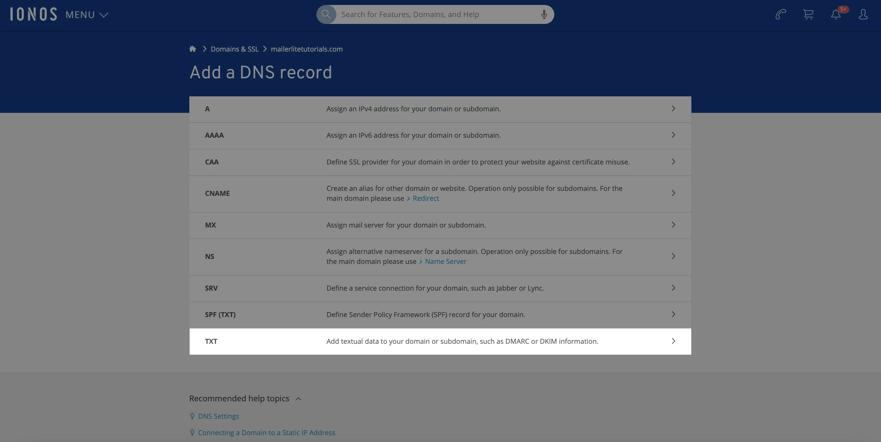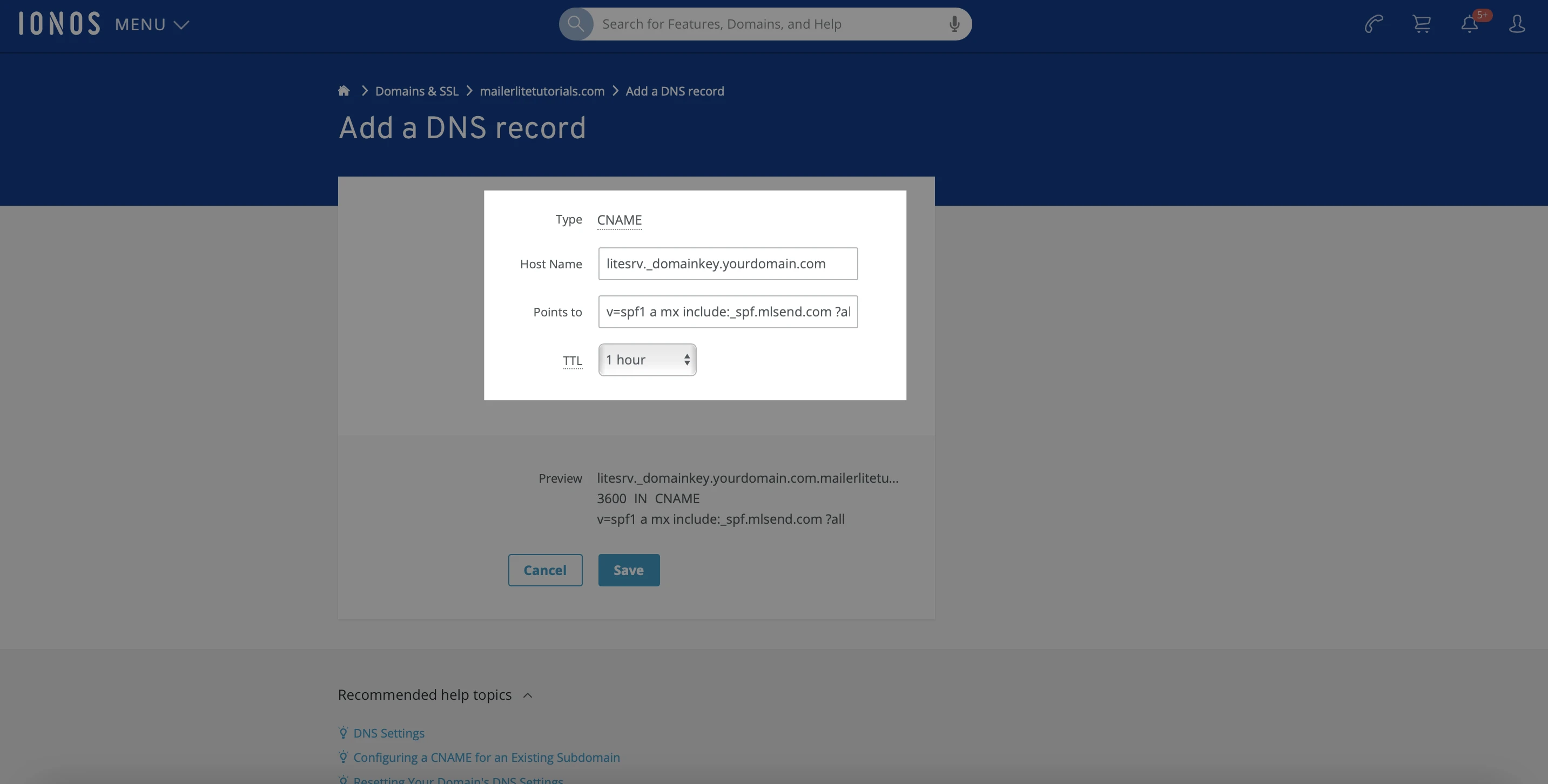 3. In the Host Name section, enter the value that is above the record value. It will look like litesrv._domainkey.yourdomain.com - however the exact value can be found in your MailerLite account under Account Settings > Domains > Authenticate or by simply clicking here.