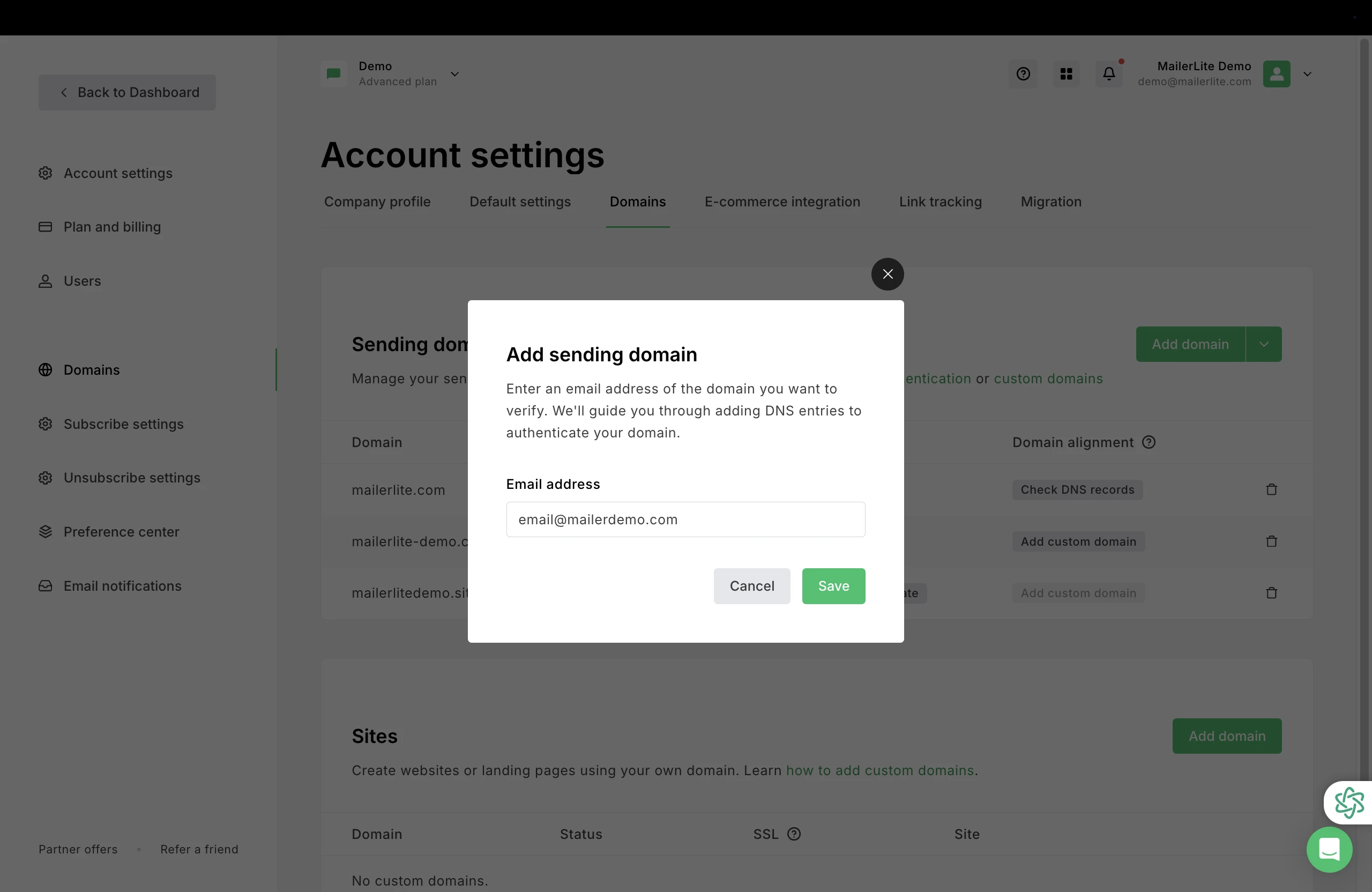 Enter an email address that includes your paid domain, which will be used to send campaigns. Click Save.