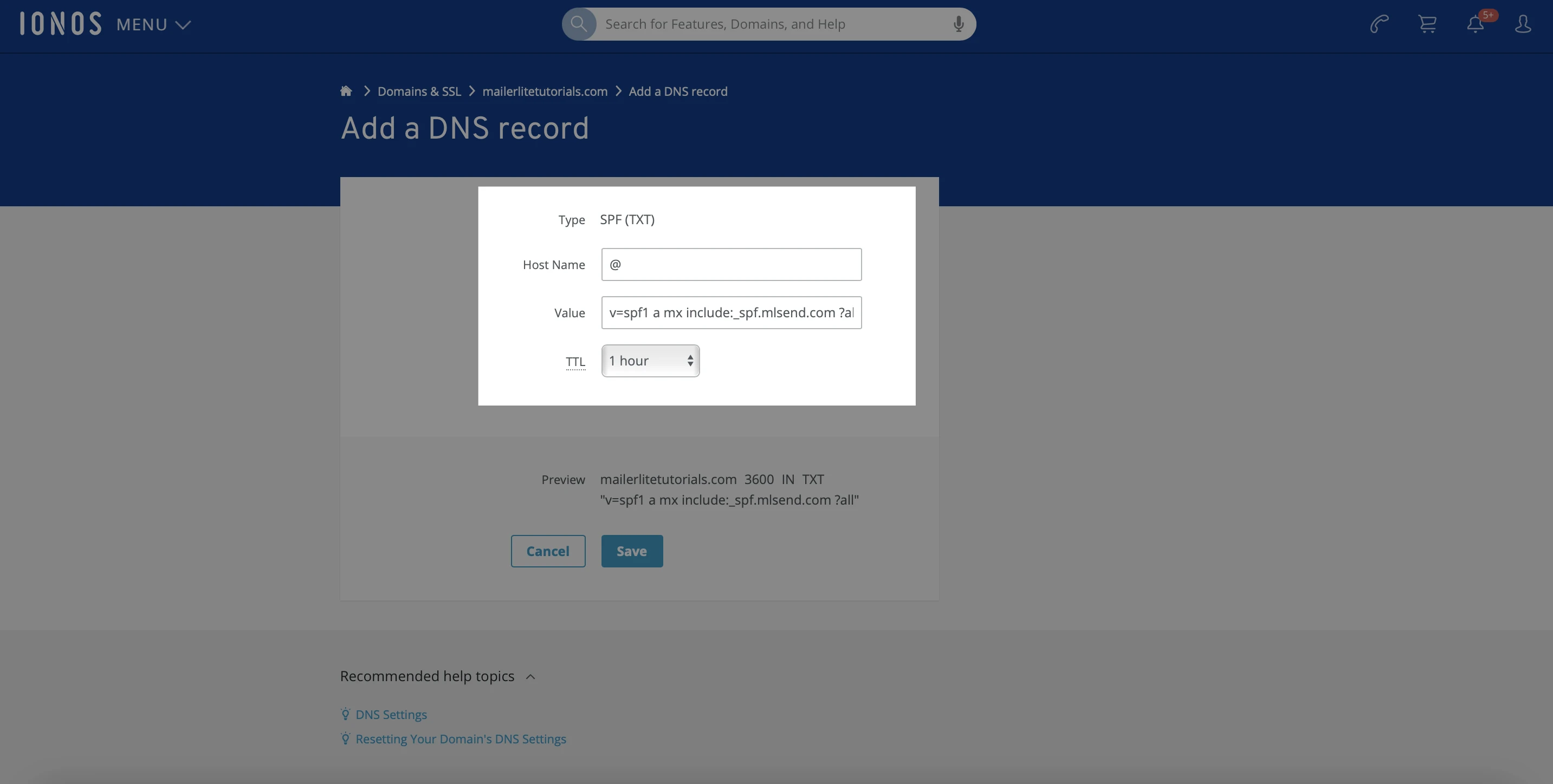 4. In the Value field, paste the SPF value that is shown in your MailerLite account.