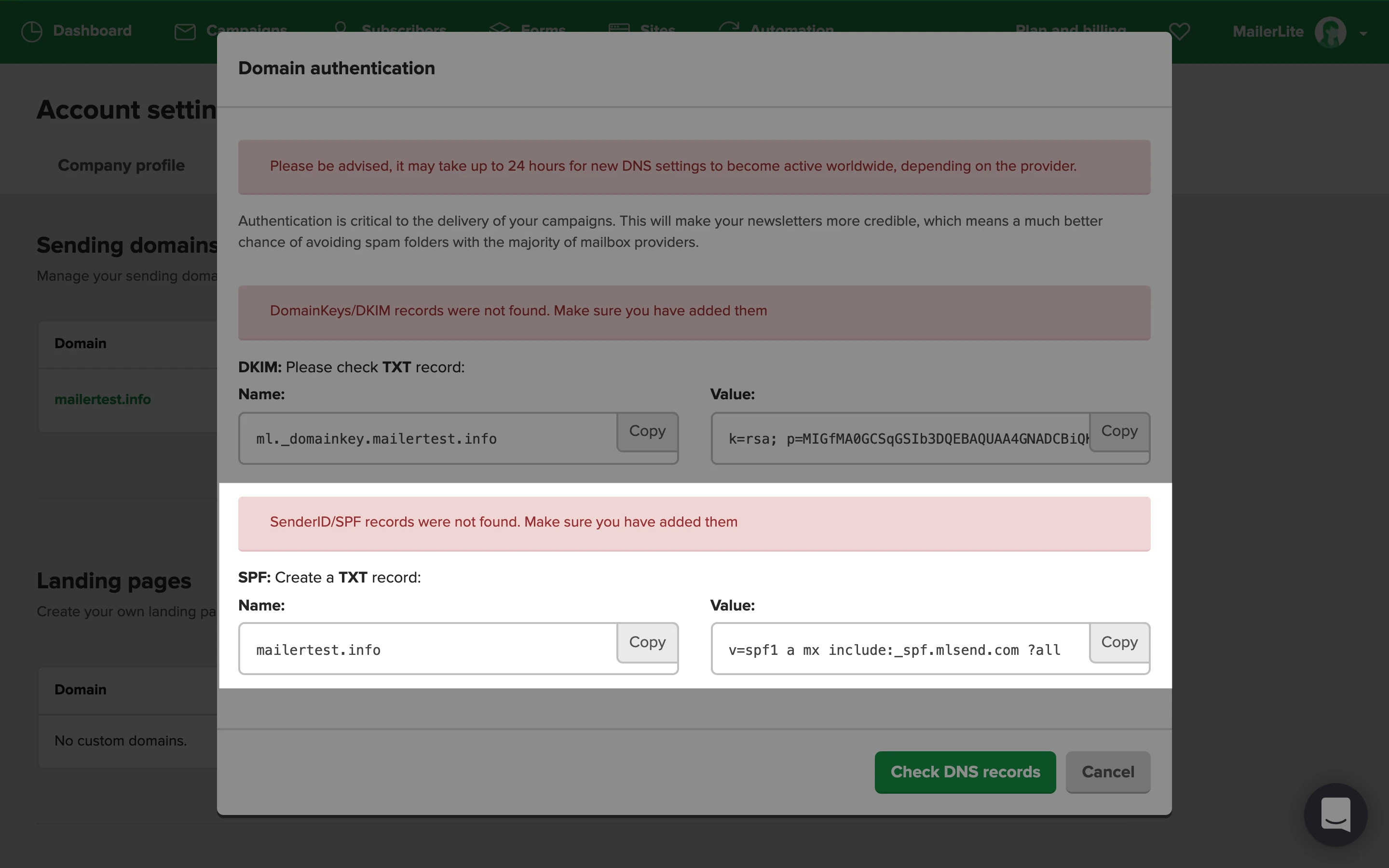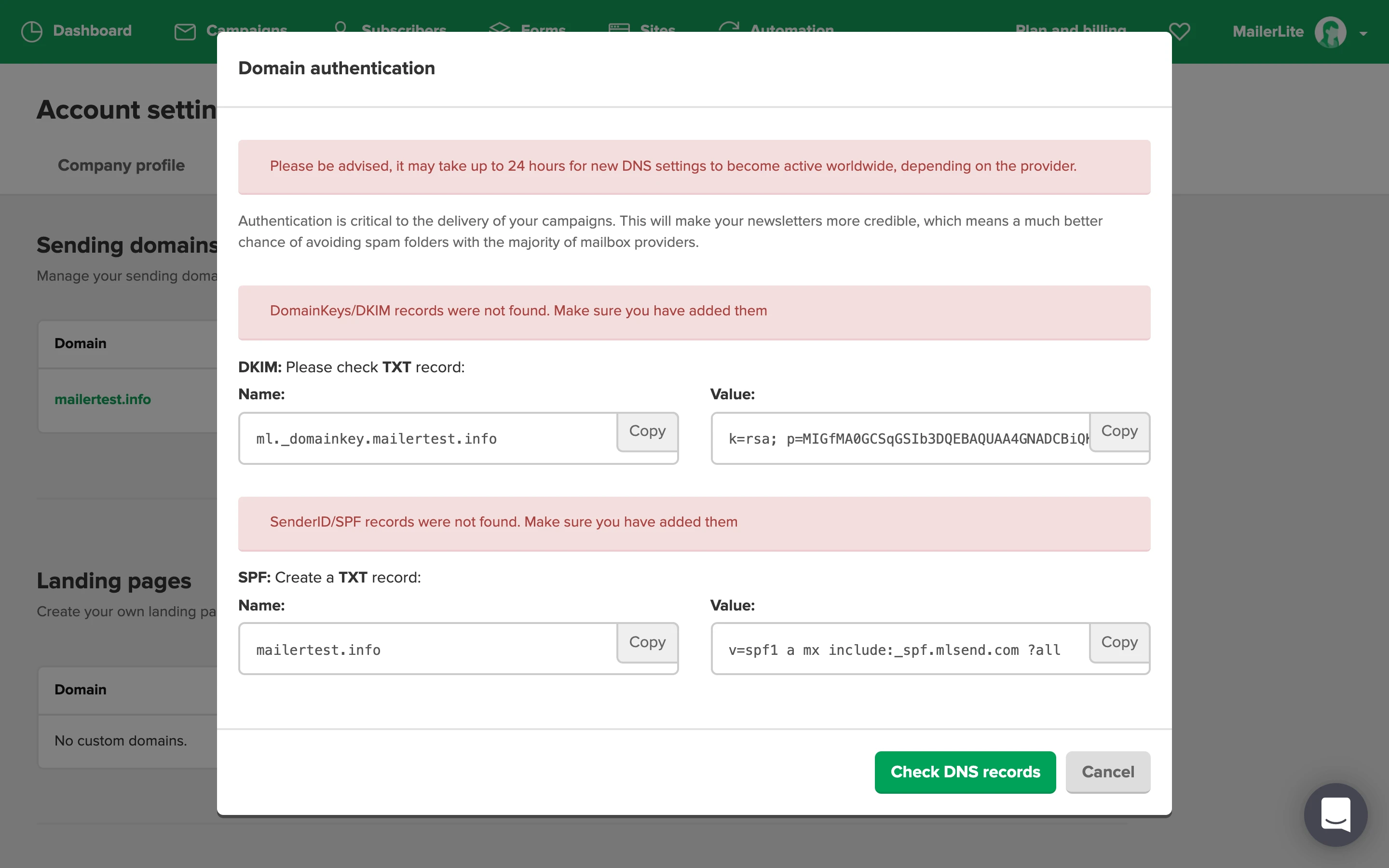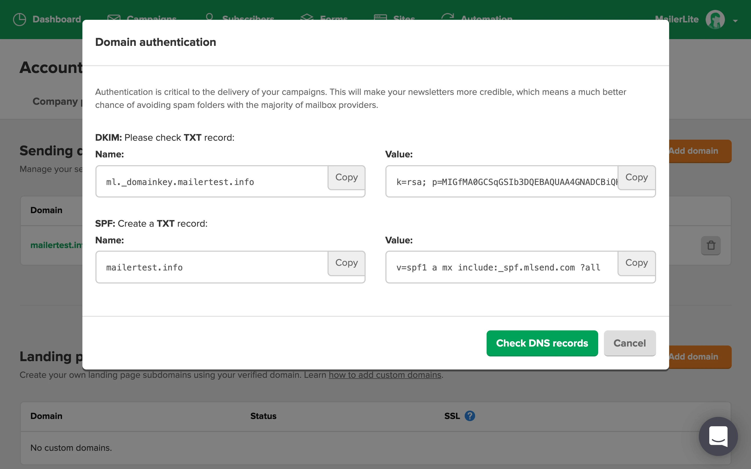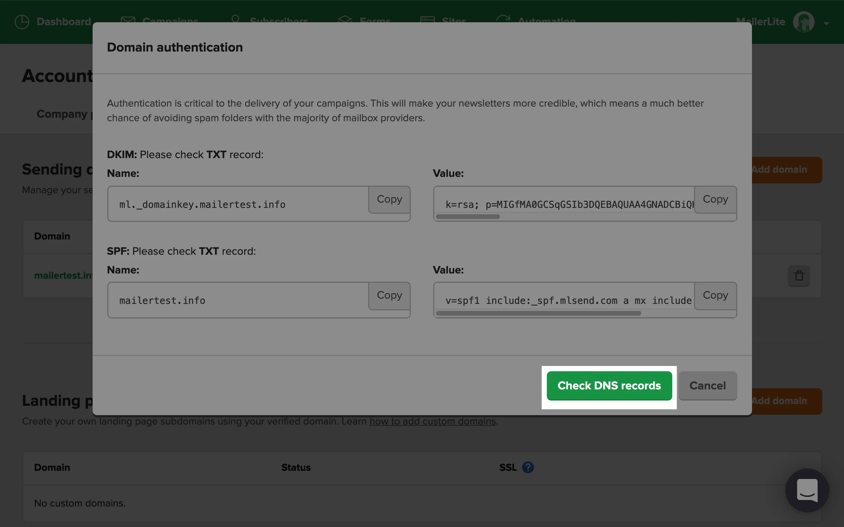 litesrv._domainkeyonly. Do not add the name of your domain since this is already automatically included in the record.In the Value field box, paste the DKIM Value text that is given to you in your MailerLite account.
