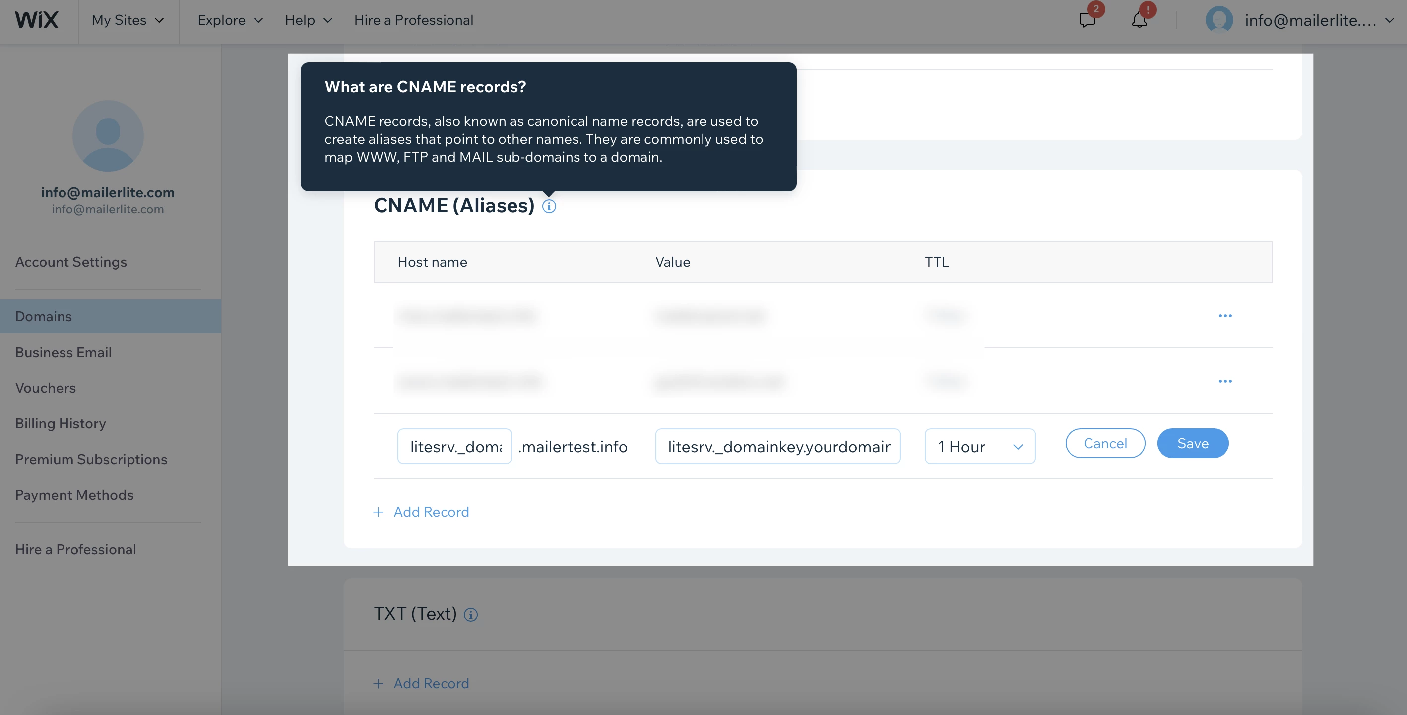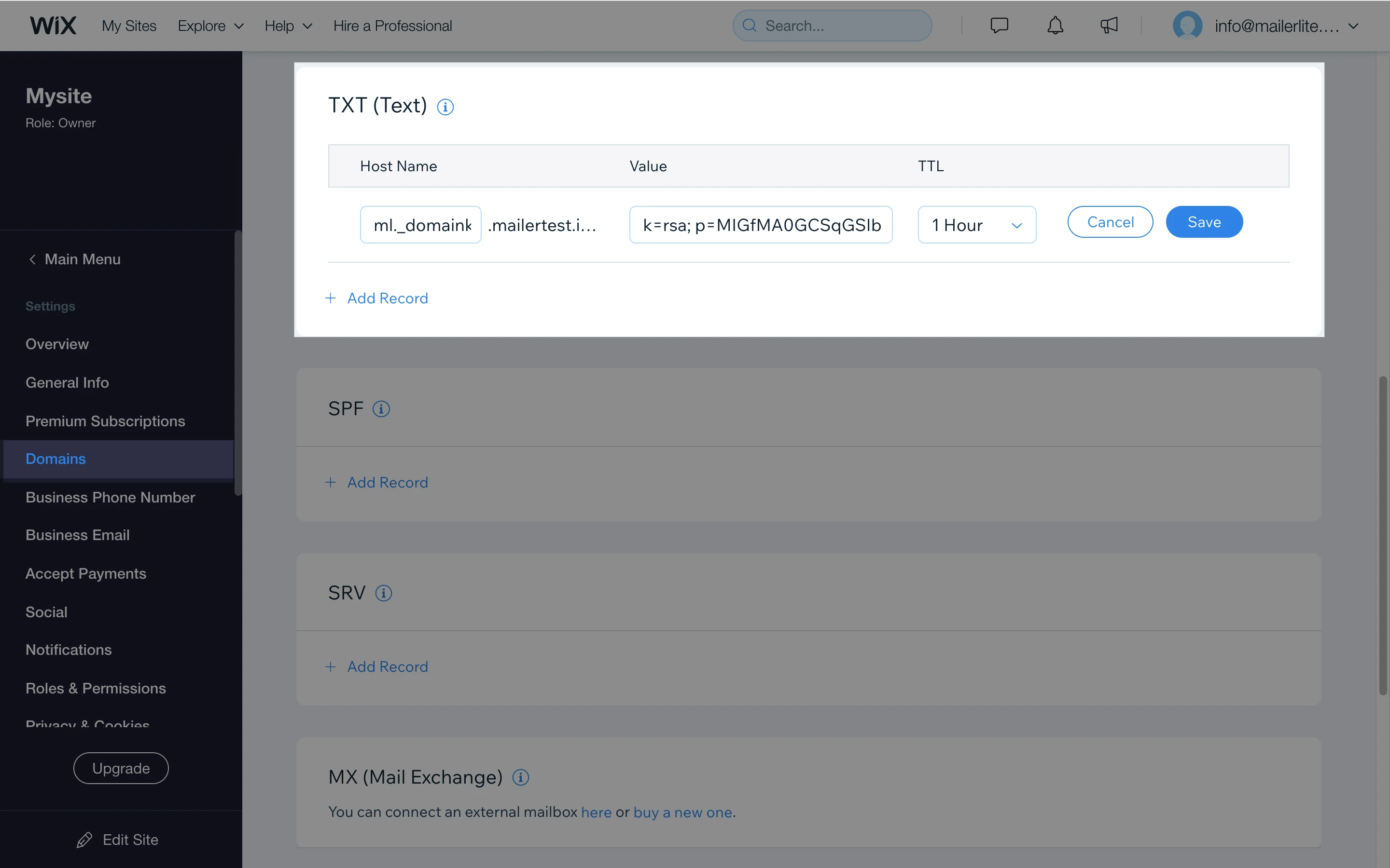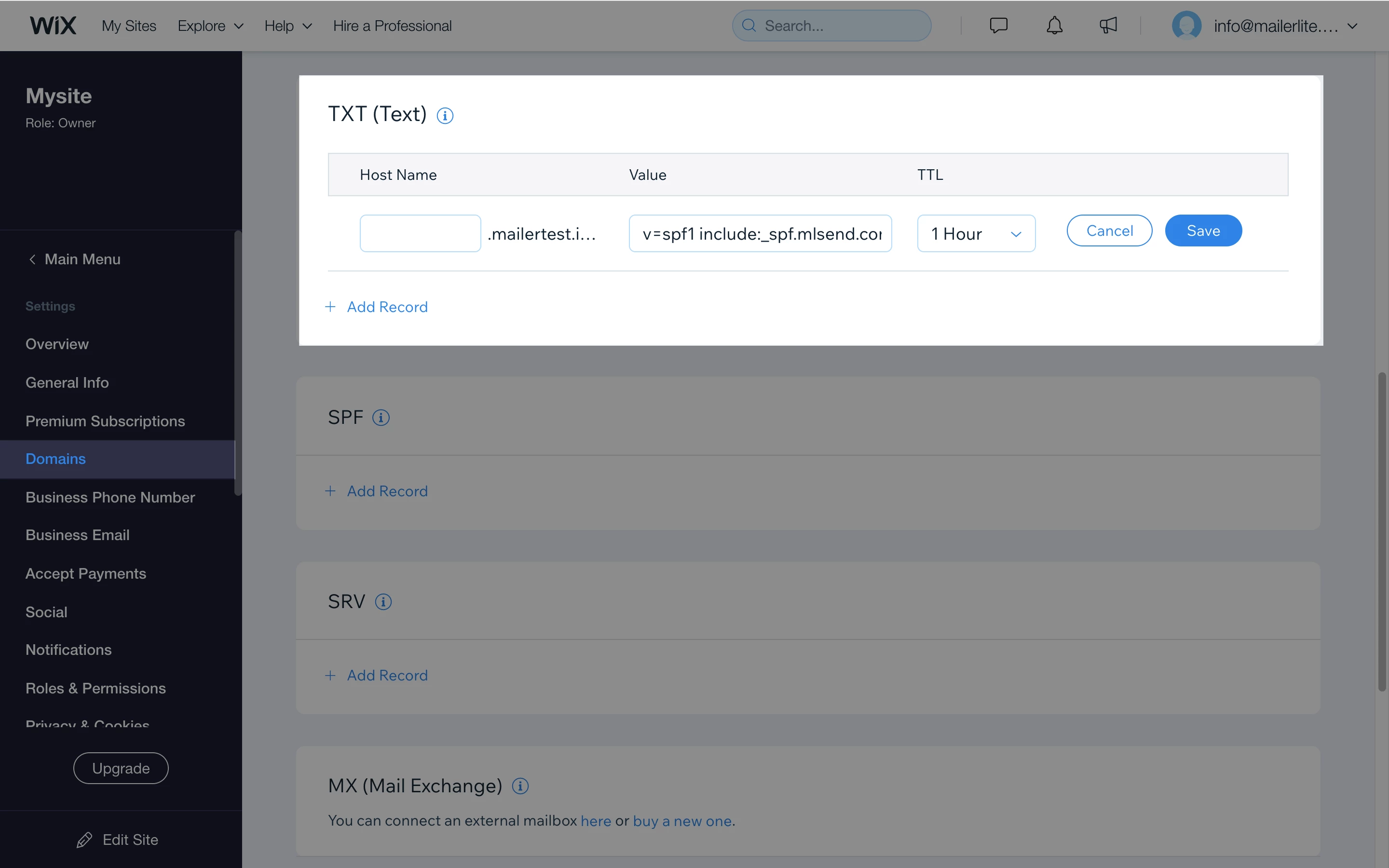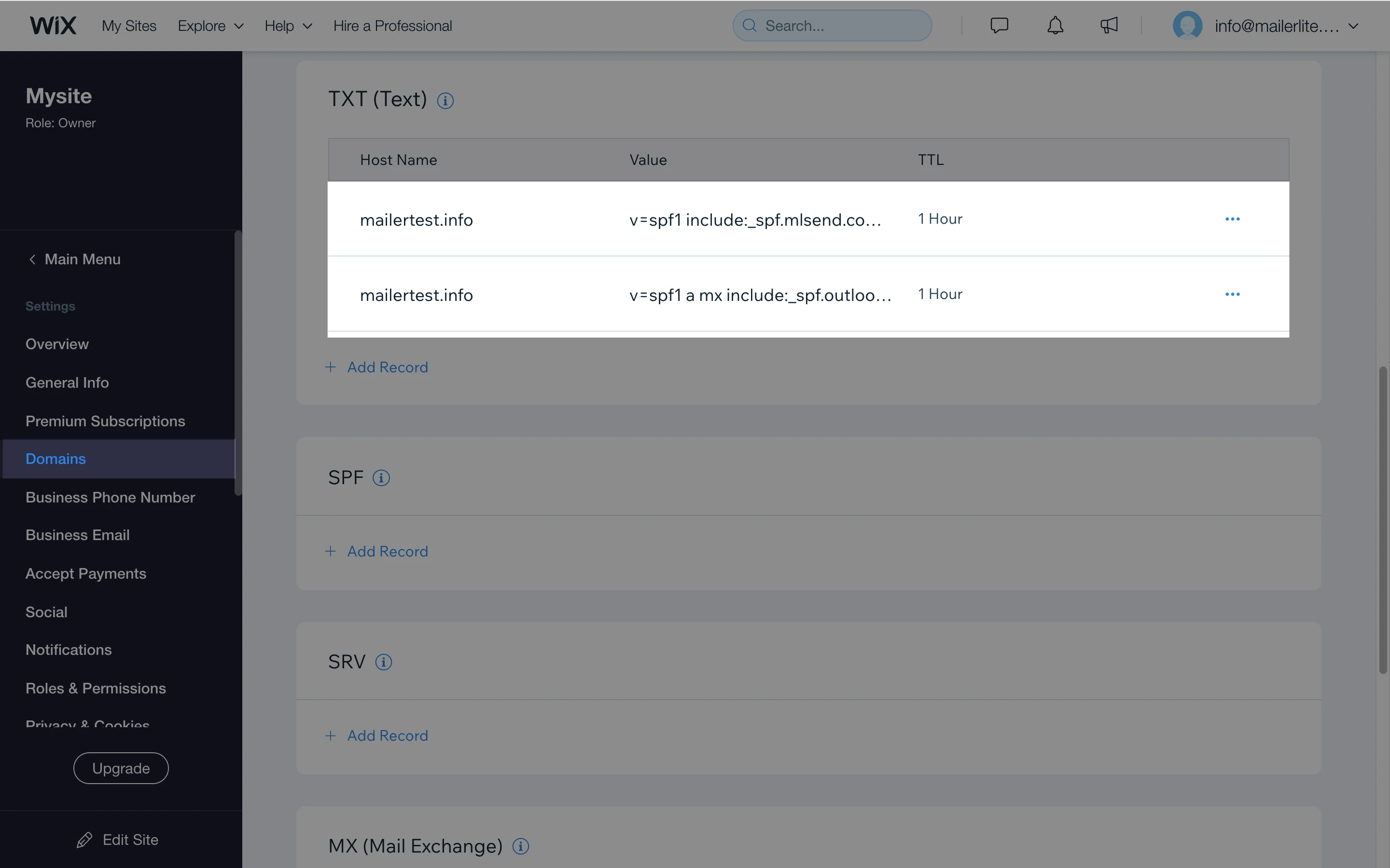 Note: Do not add the SPF record in the SPF section of the DNS page on Wix, otherwise our server won’t be able to recognize the SPF record.
