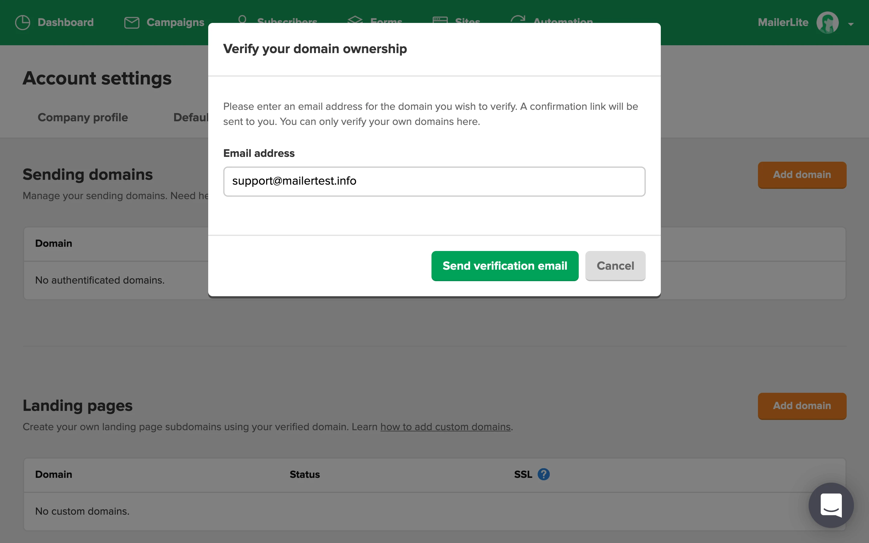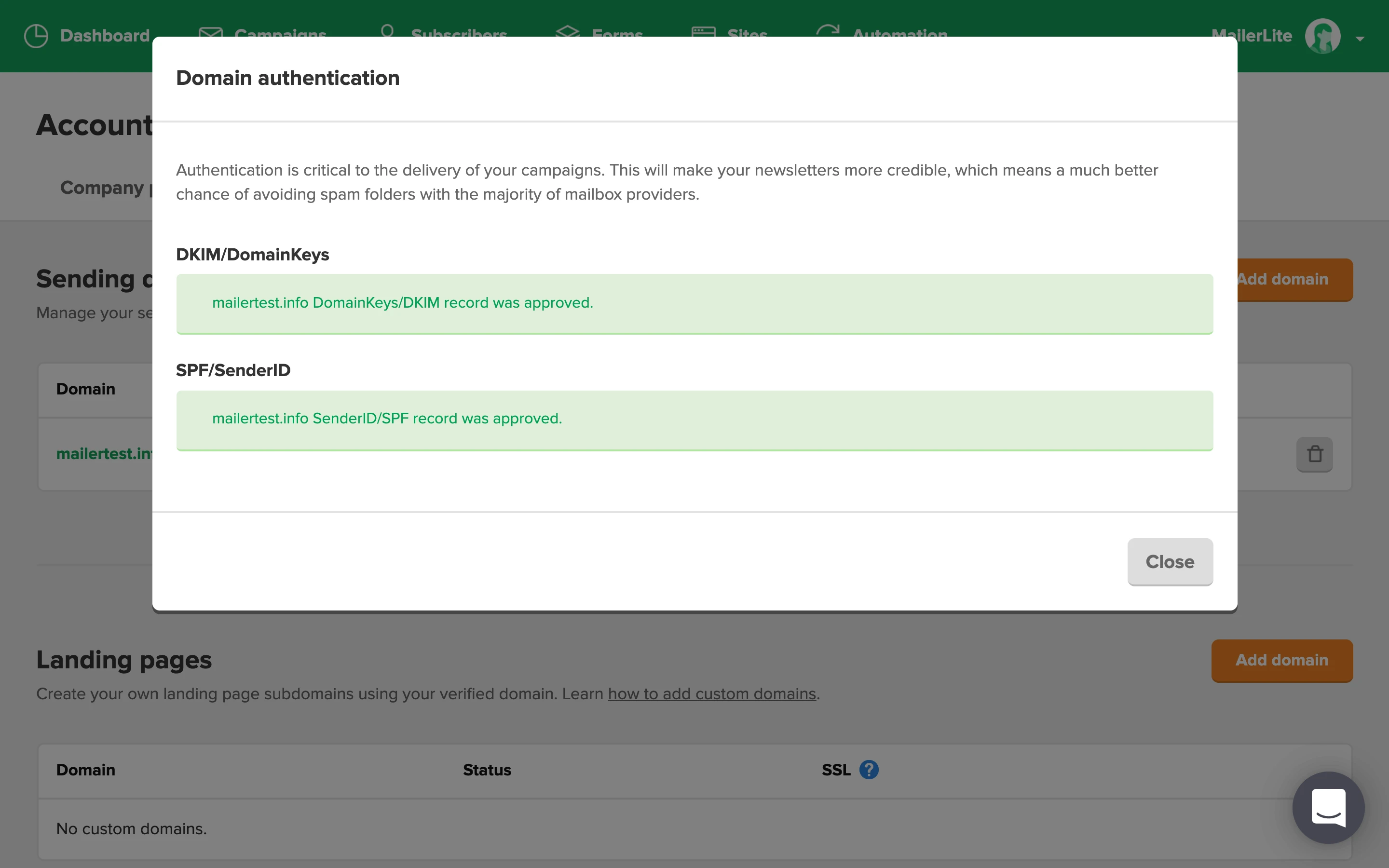 Head back to your MailerLite Domains page and click on the green Check DNS records button on the domain authentication window. Once both records are approved, your new domain will be displayed as Authenticated ✅.