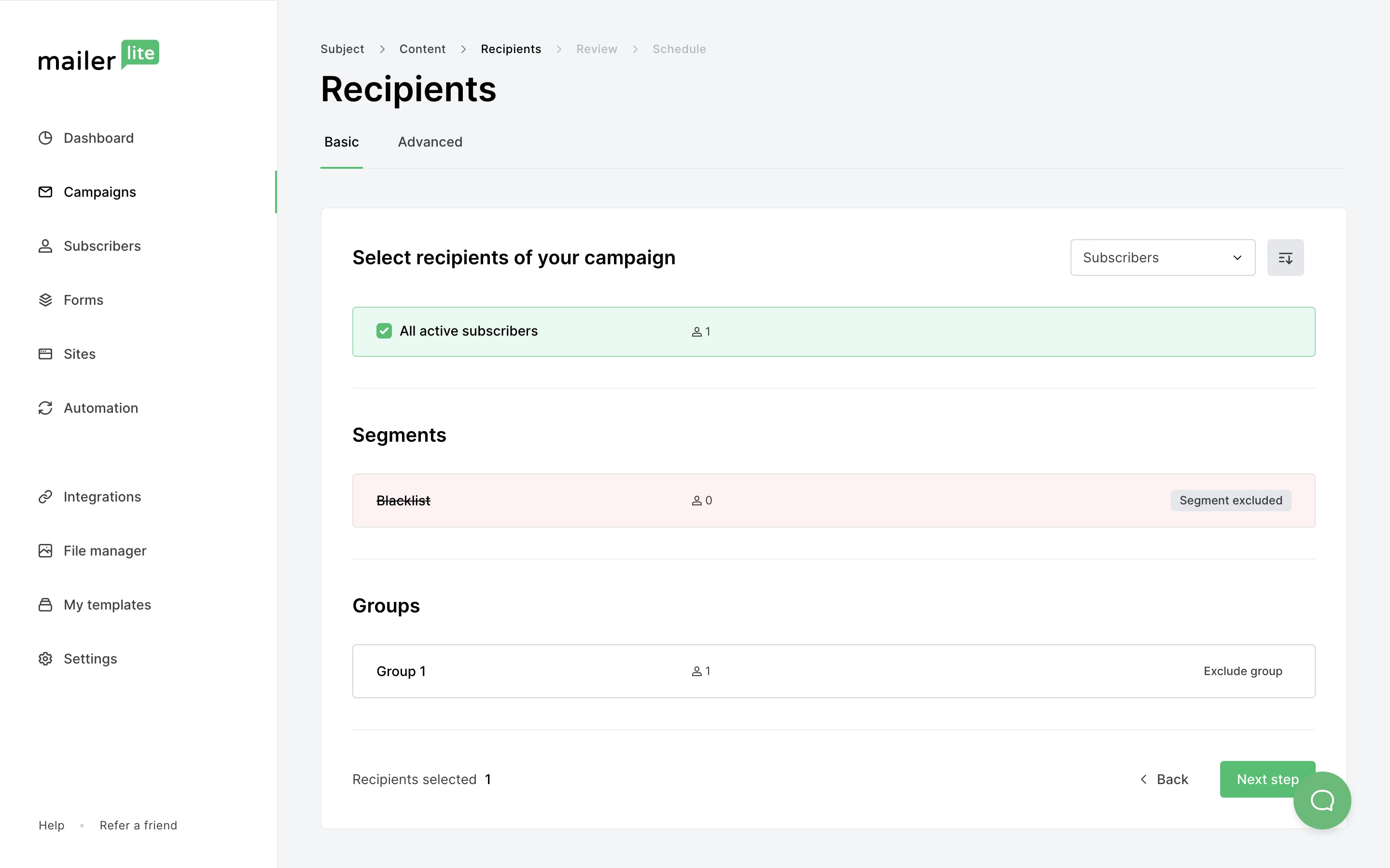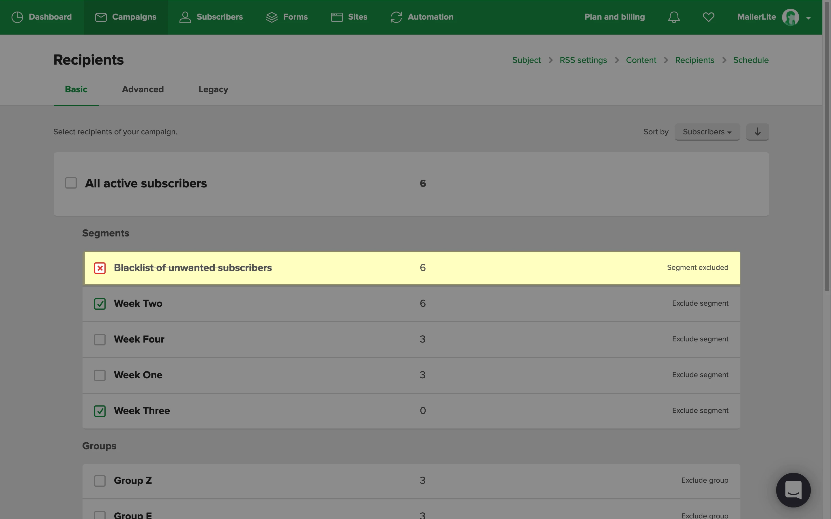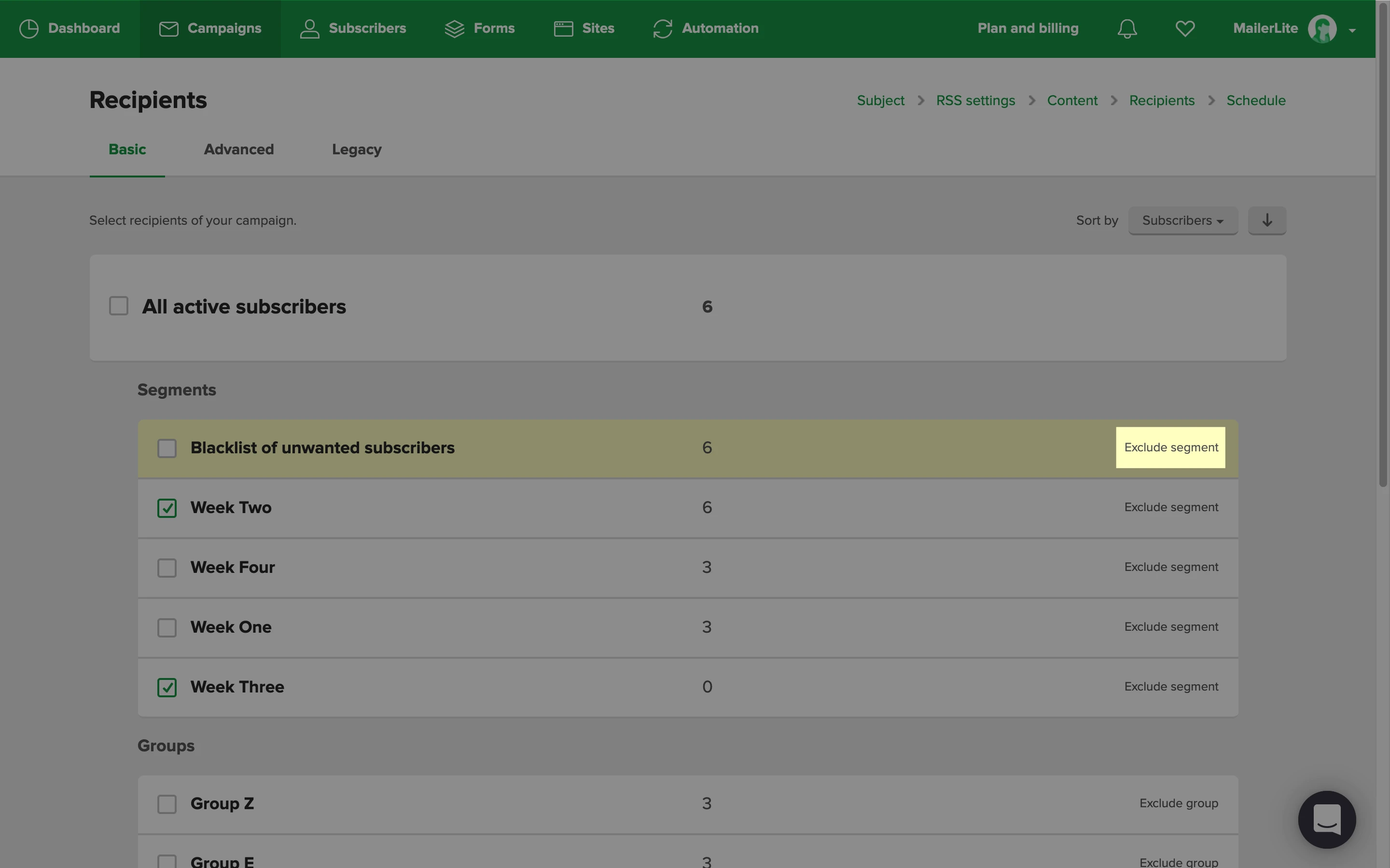 To exclude the subscribers in this blacklist from receiving any newsletters or automations, click on Exclude segment on the Recipients page of a campaign. The campaign will not be sent to those who are in this segment.