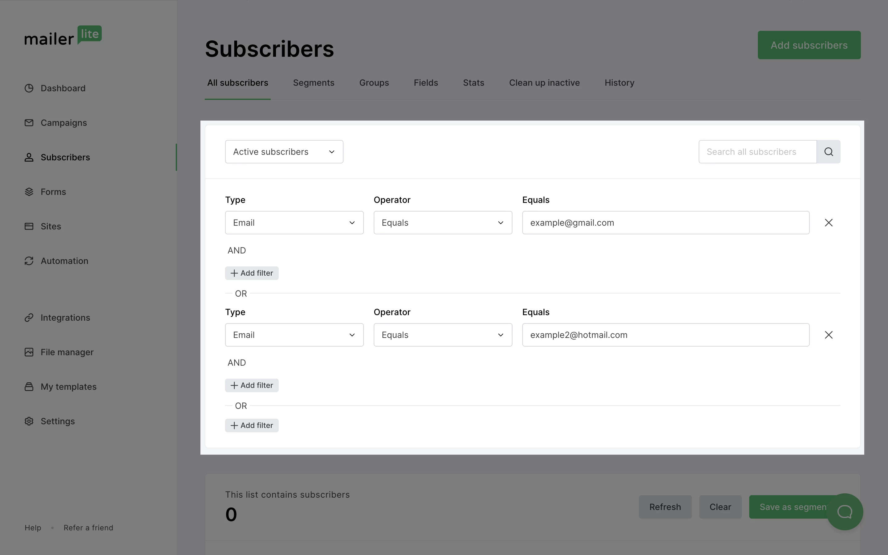 To add additional email addresses to the segment, select + Add filter under OR and repeat steps 2-4.