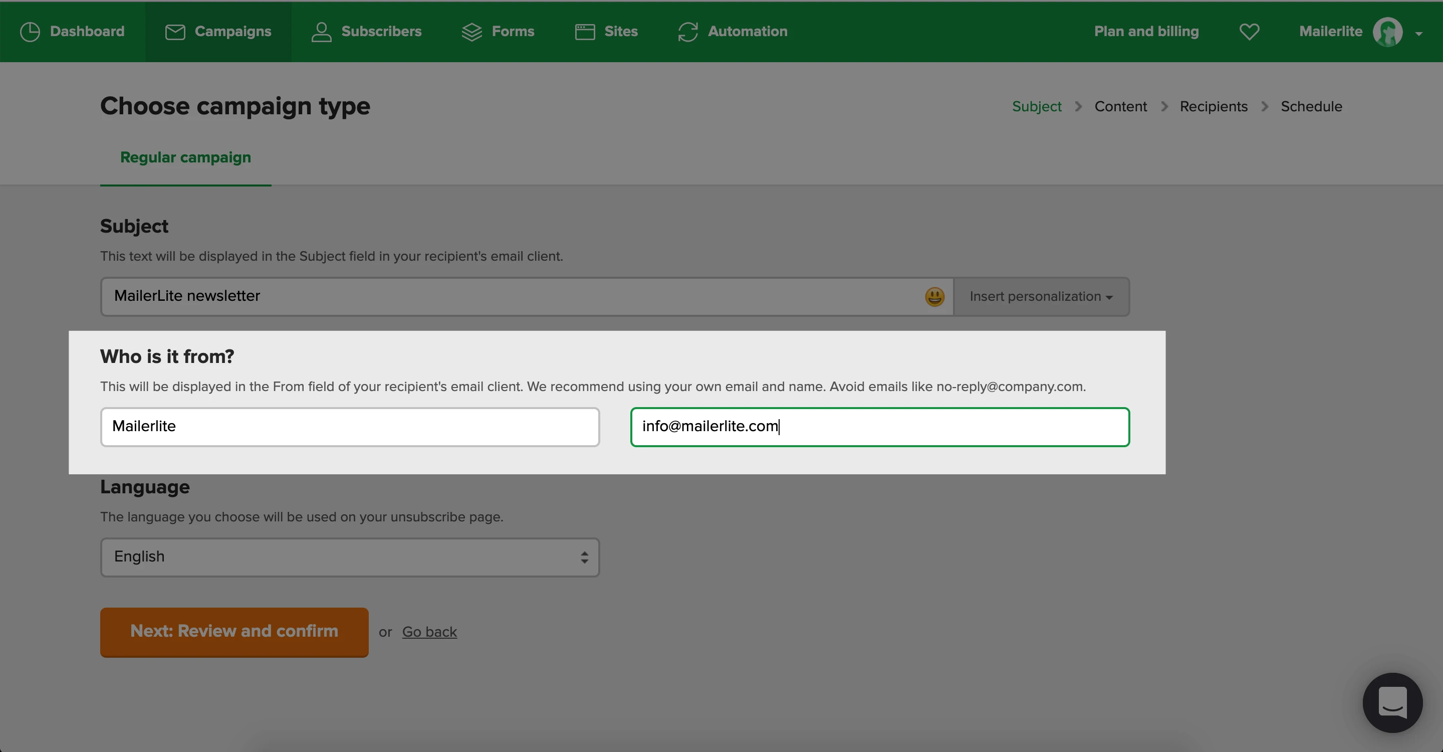 Under Who is it from? enter your desired name and sender address and click Next step.