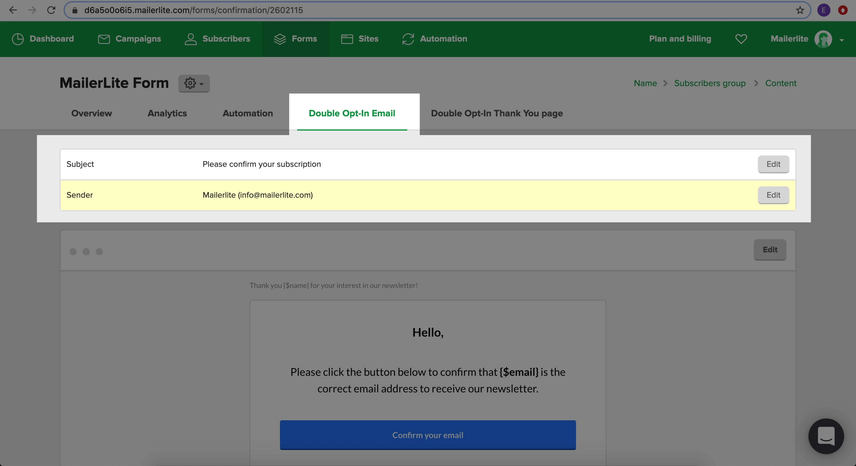Navigate to the Forms page (or the Sites page, if you wish to edit a landing page double opt-in email).