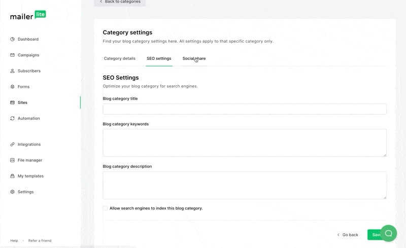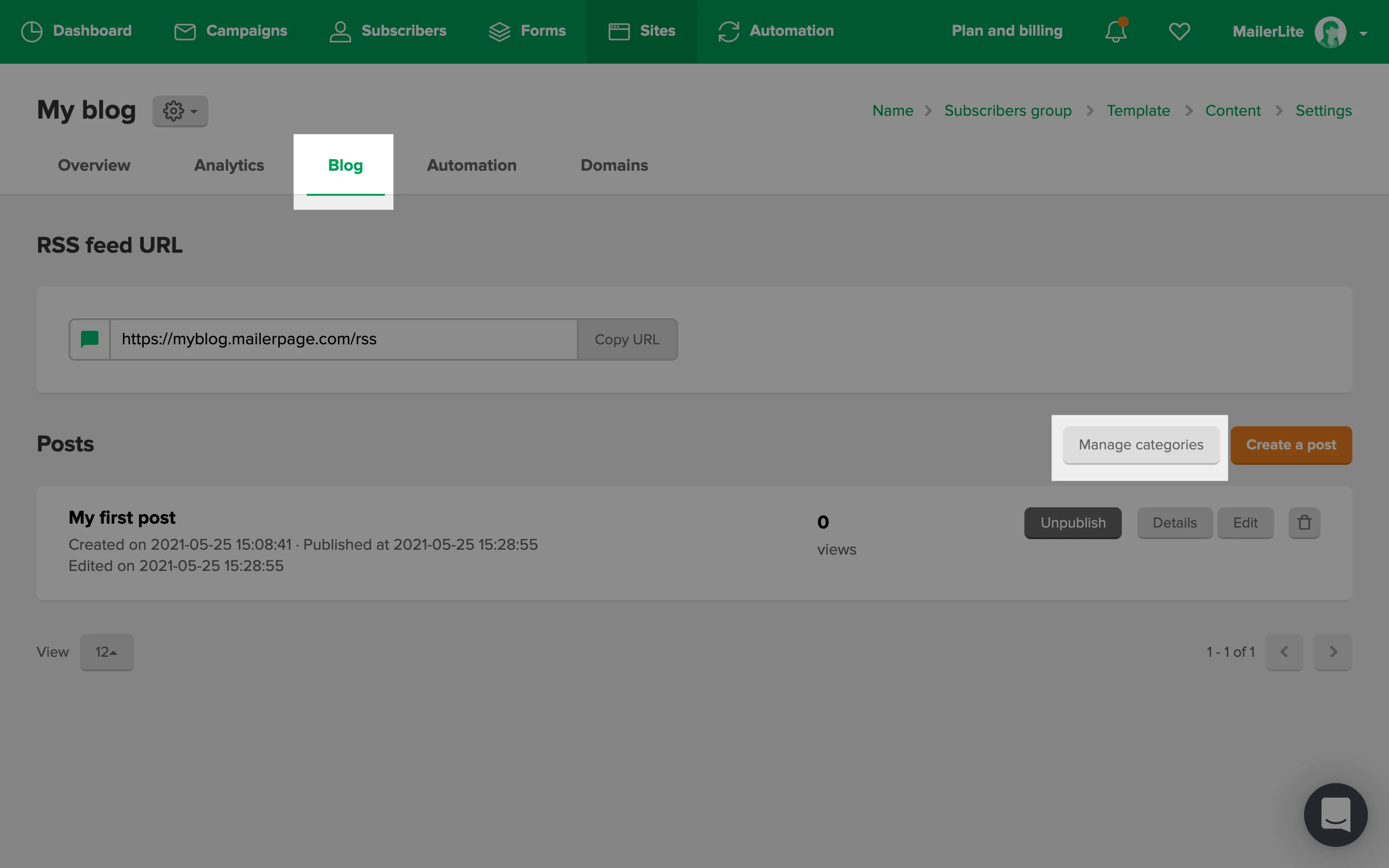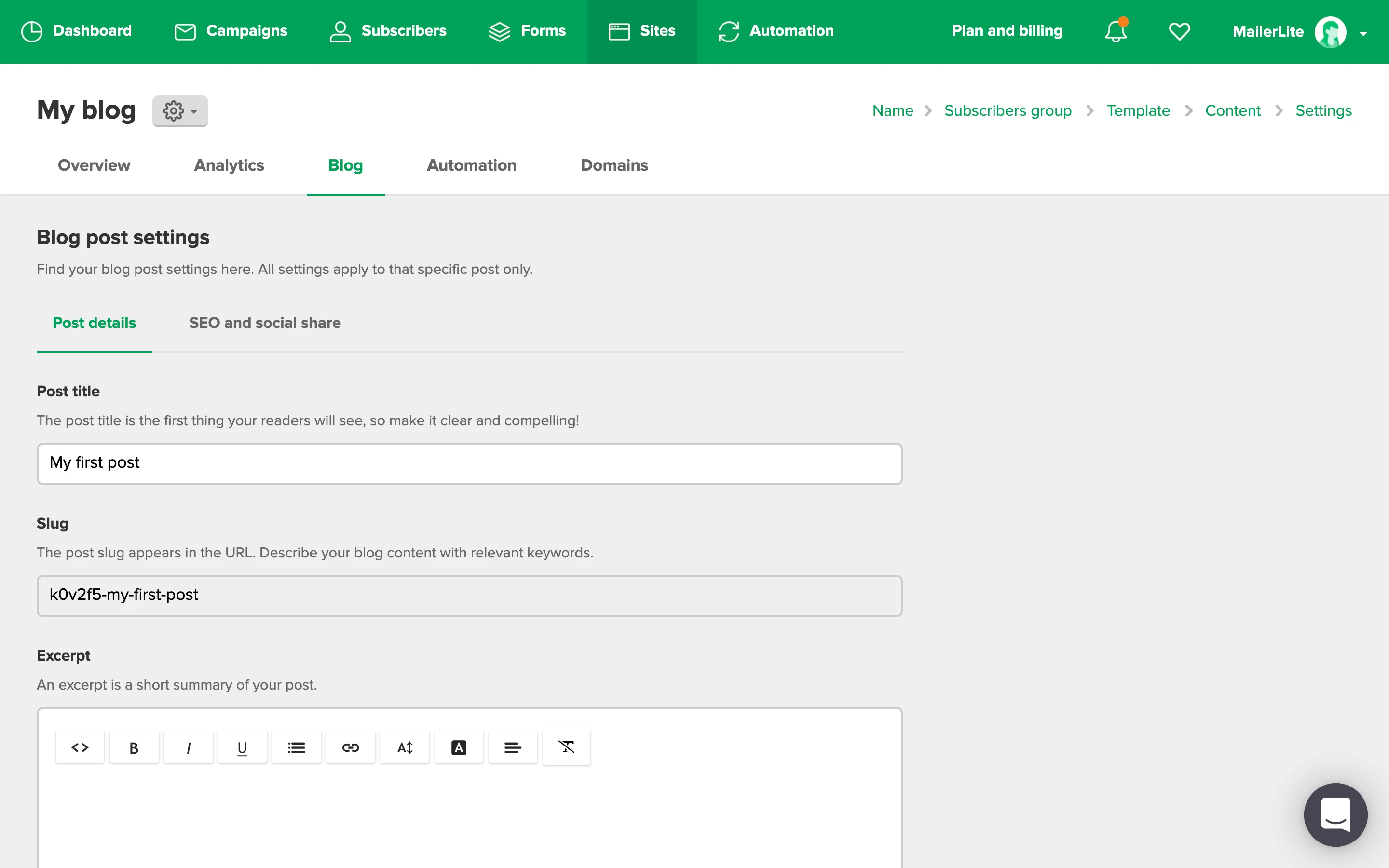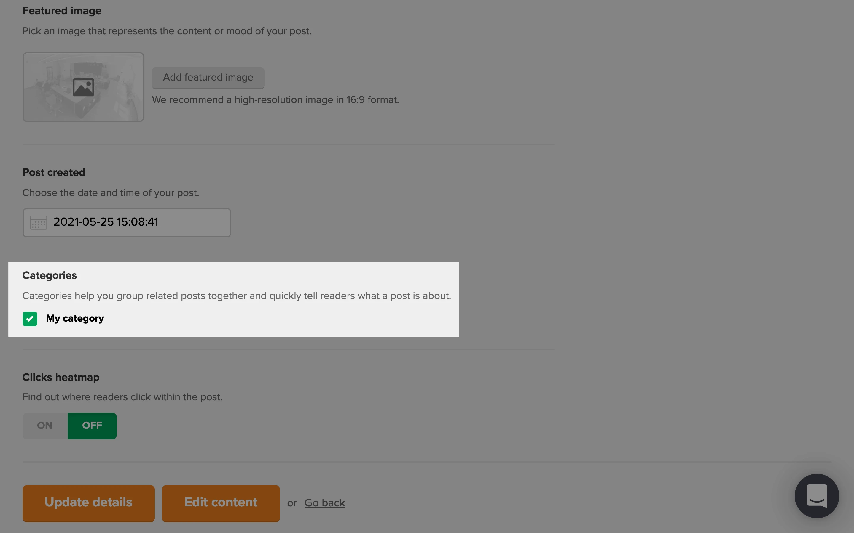 You can then edit the Post title, Excerpt, and Featured image of your blog post. If you have created categories, they will also appear here.