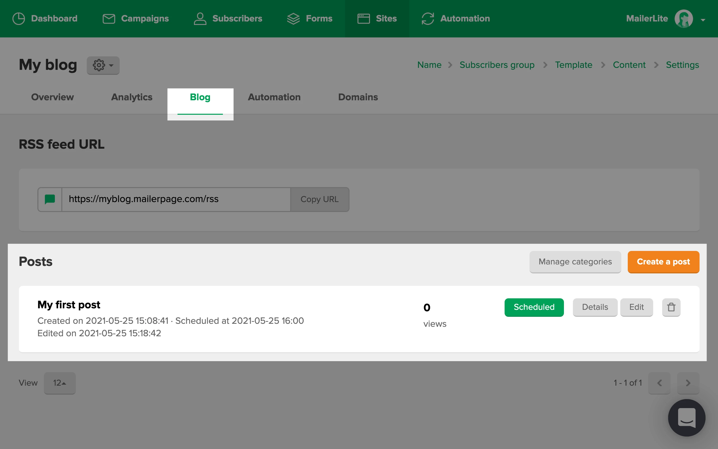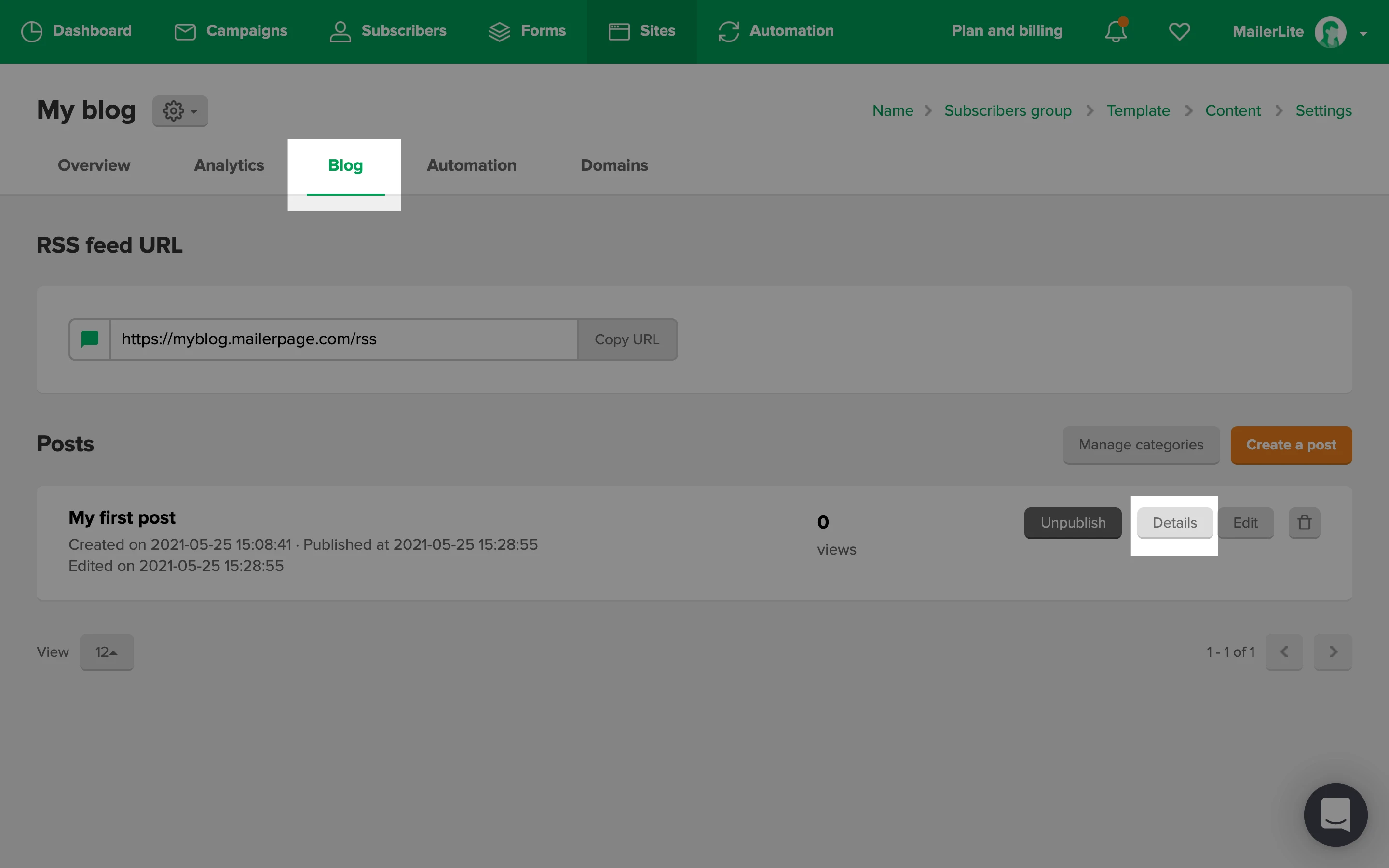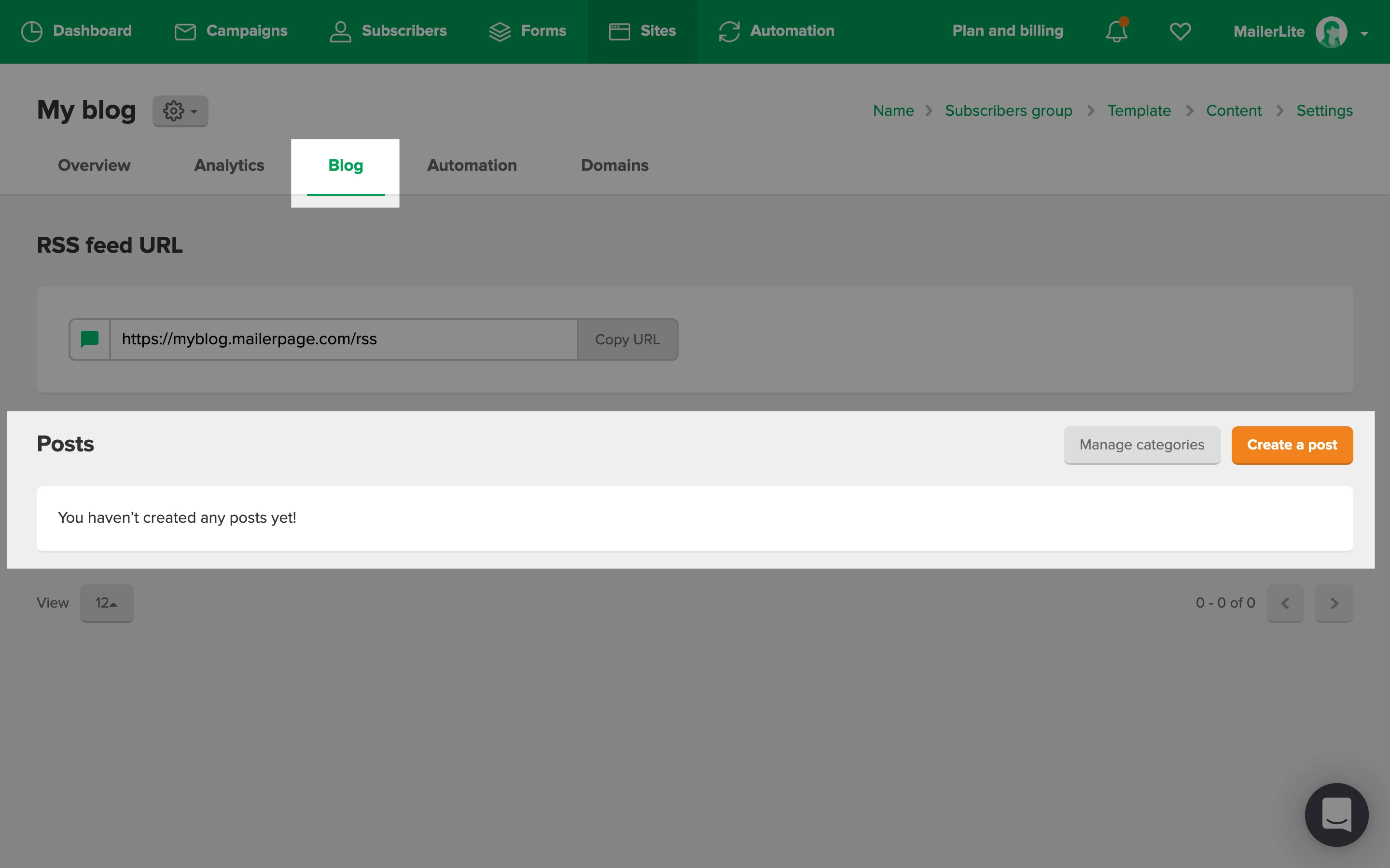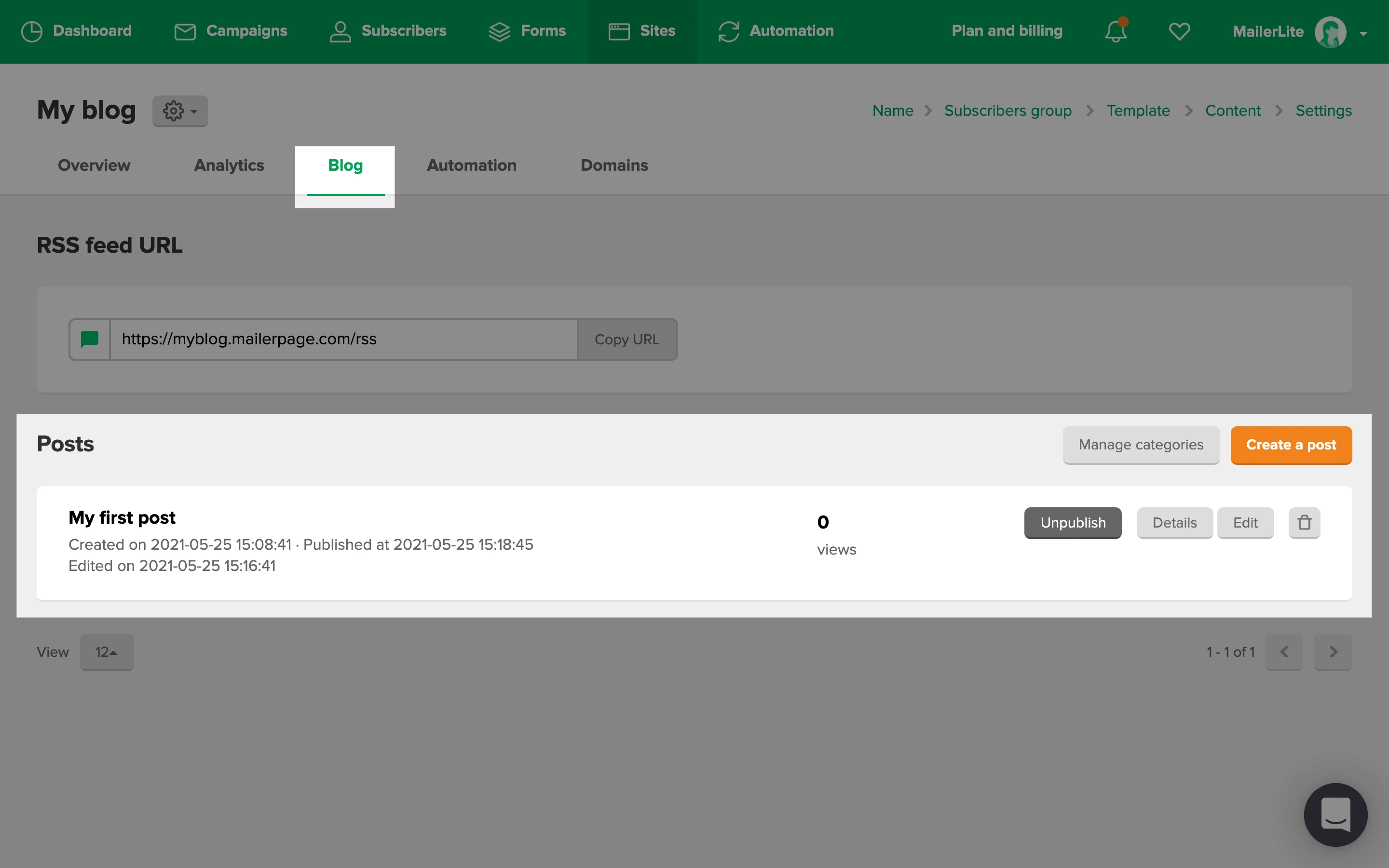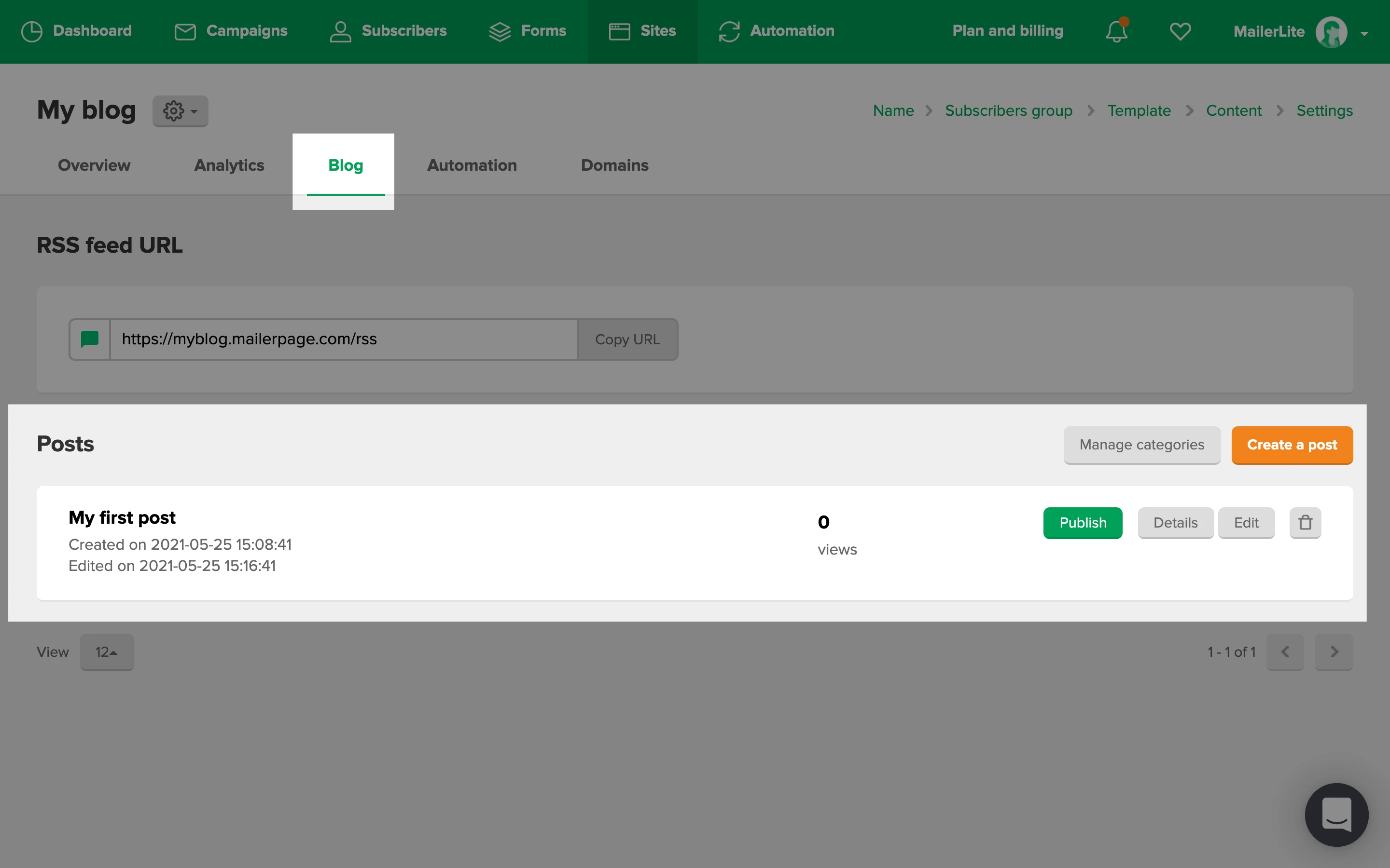 Blog posts can be found and created on your website's Overview page under the Blog tab.