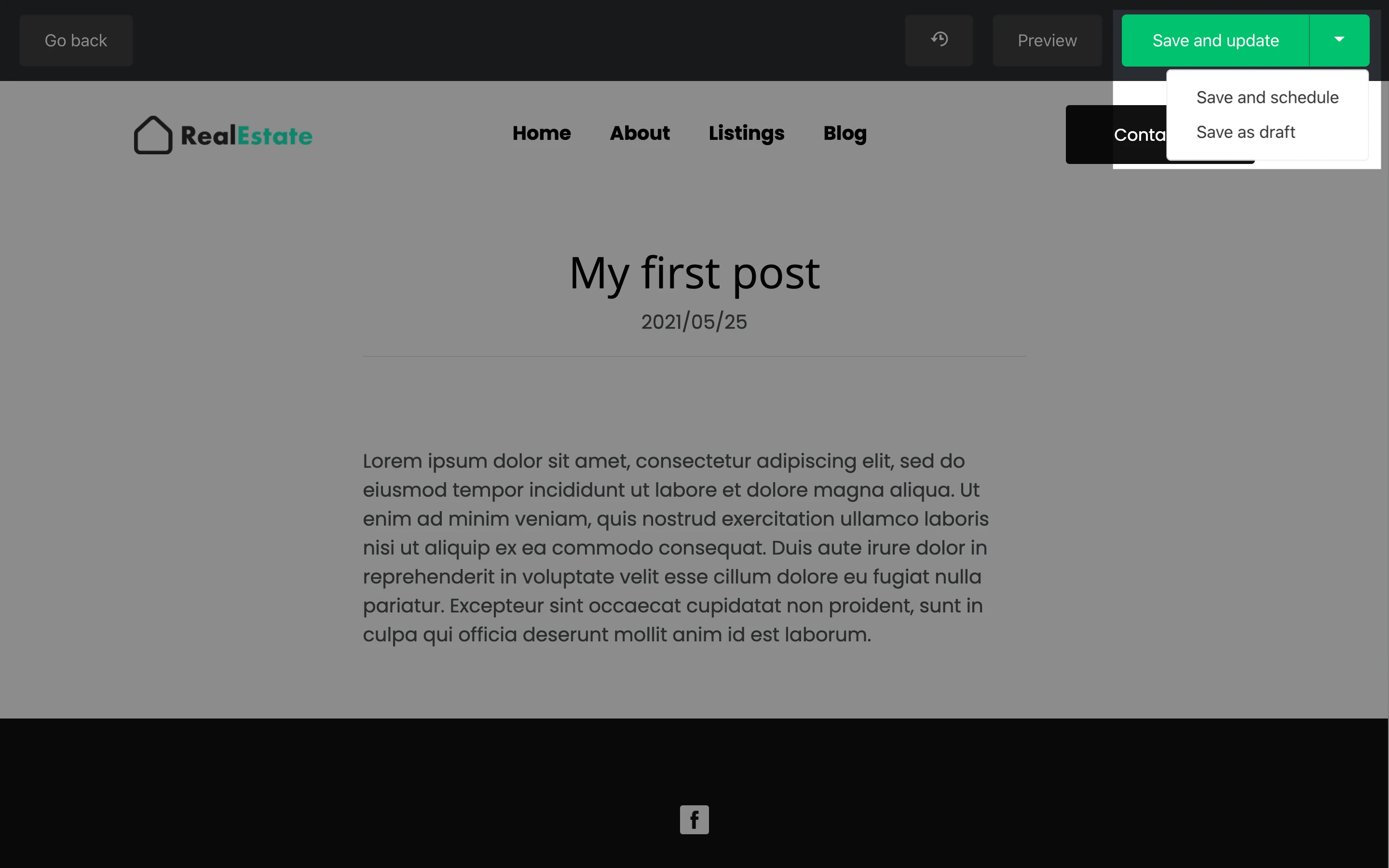 To publish your post, click Save and publish from within your blog post editor—or navigate to your Blog tab and click the Publish button on the post you wish to make public on your website.
