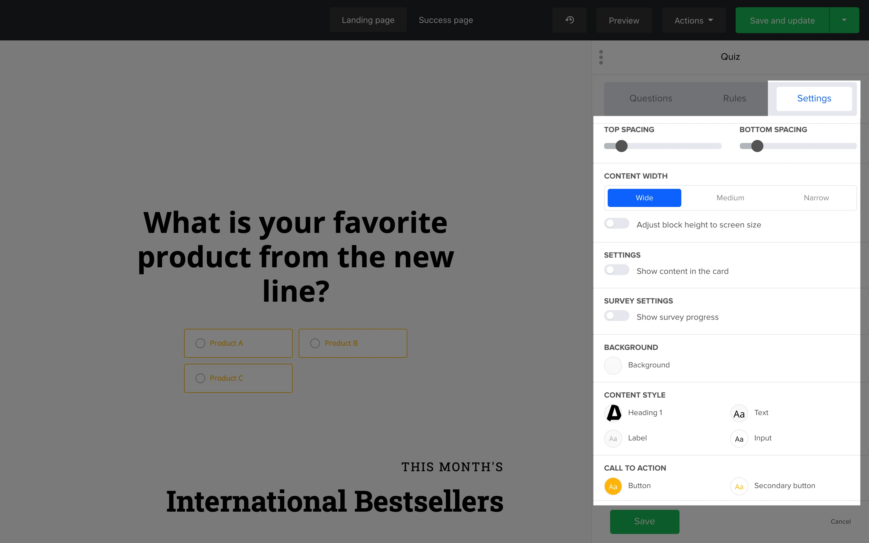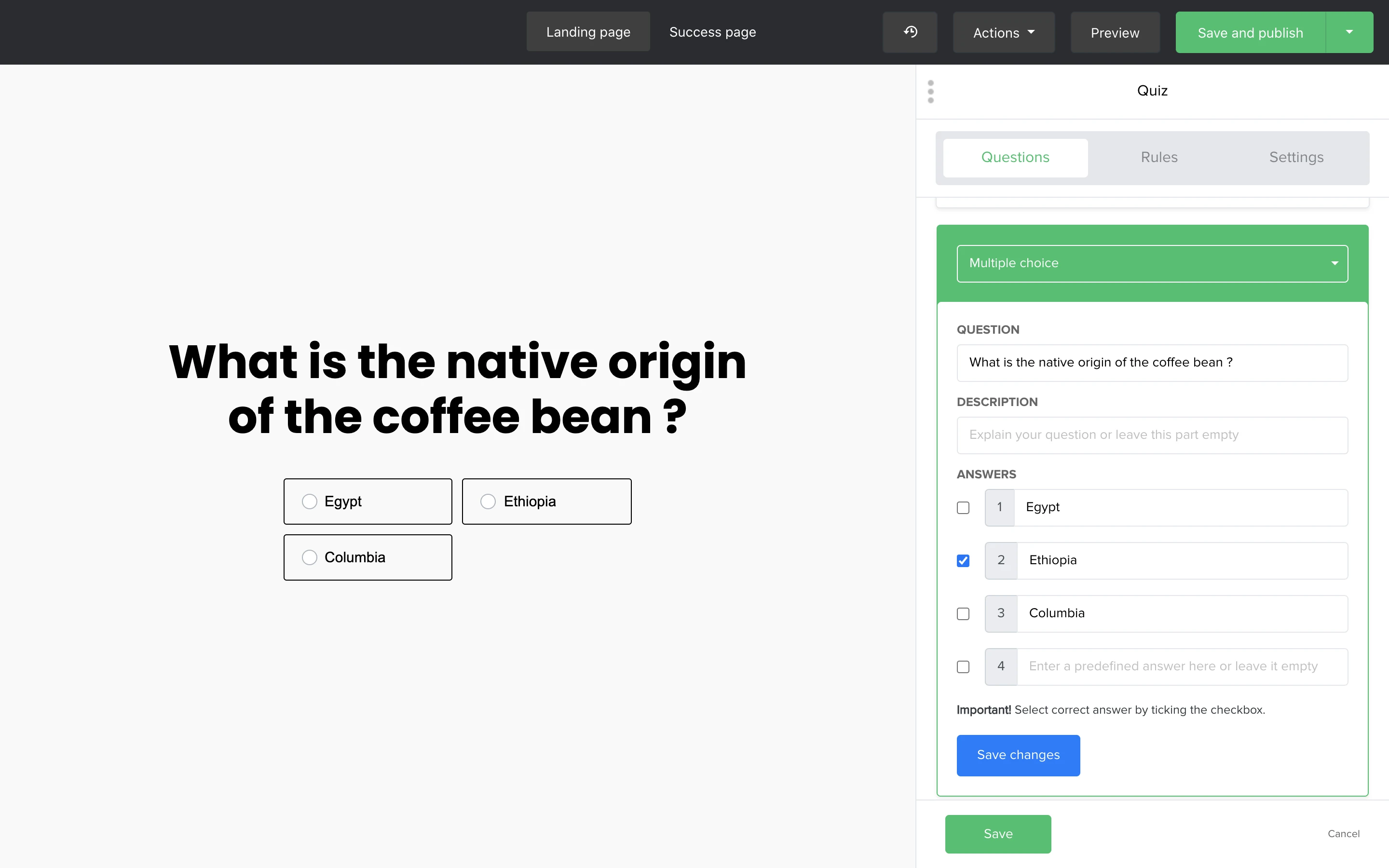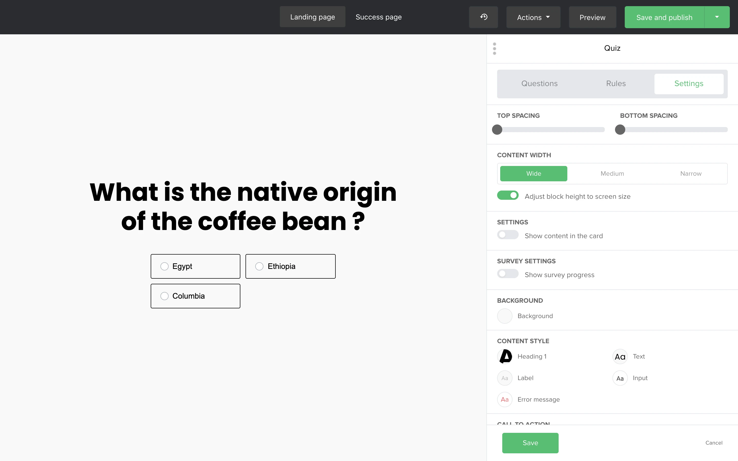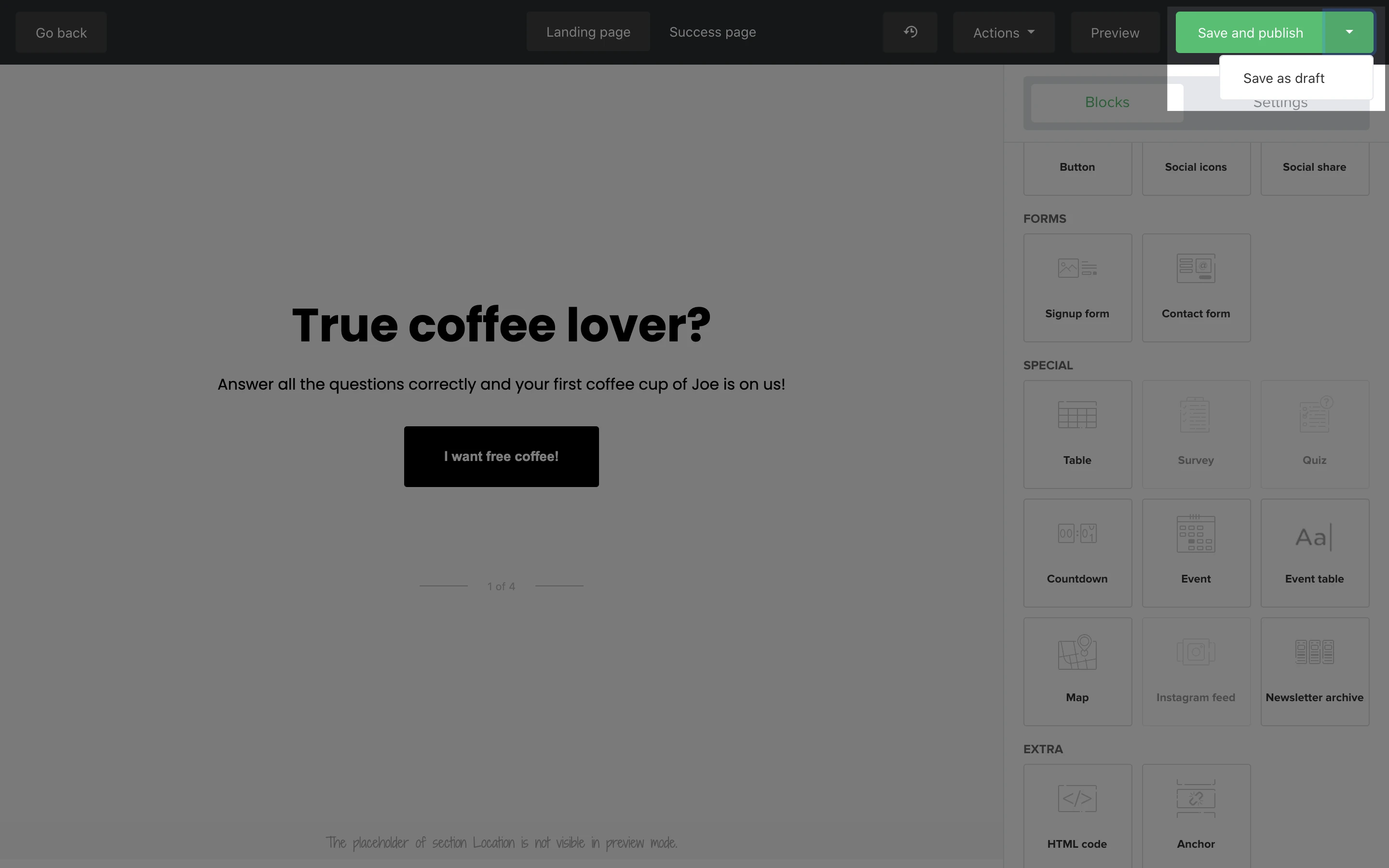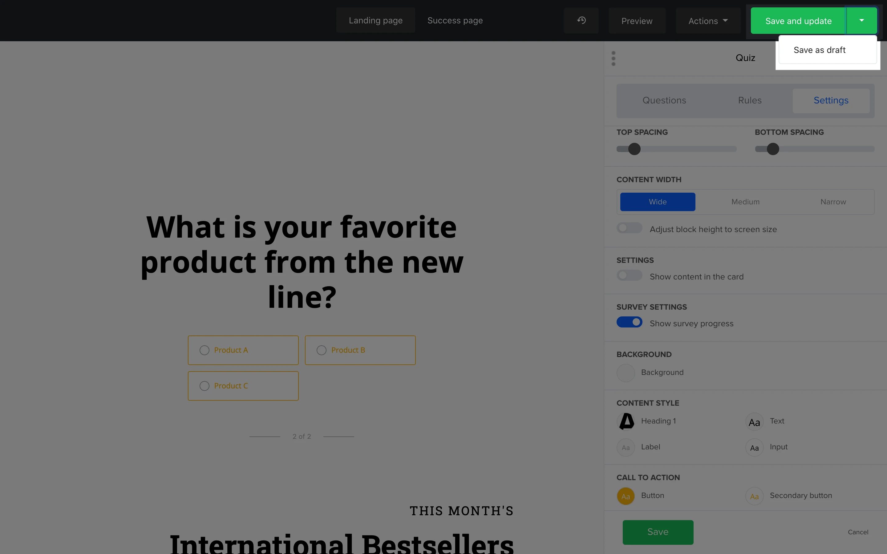 Once you’re satisfied with the design of your landing page and quiz, you can save and publish your landing page by clicking the Save and publish button. Alternatively, you can save your landing page as a draft.