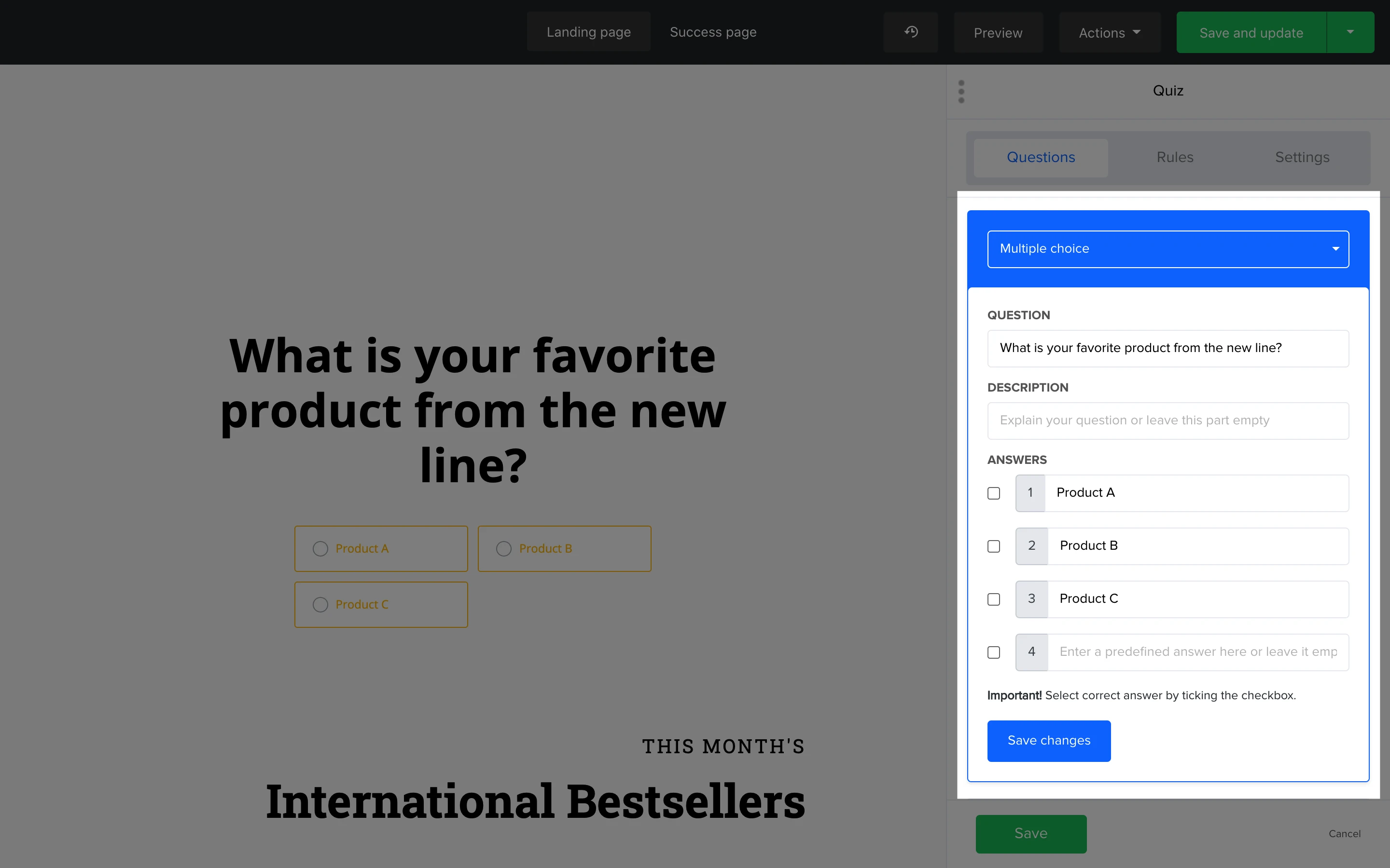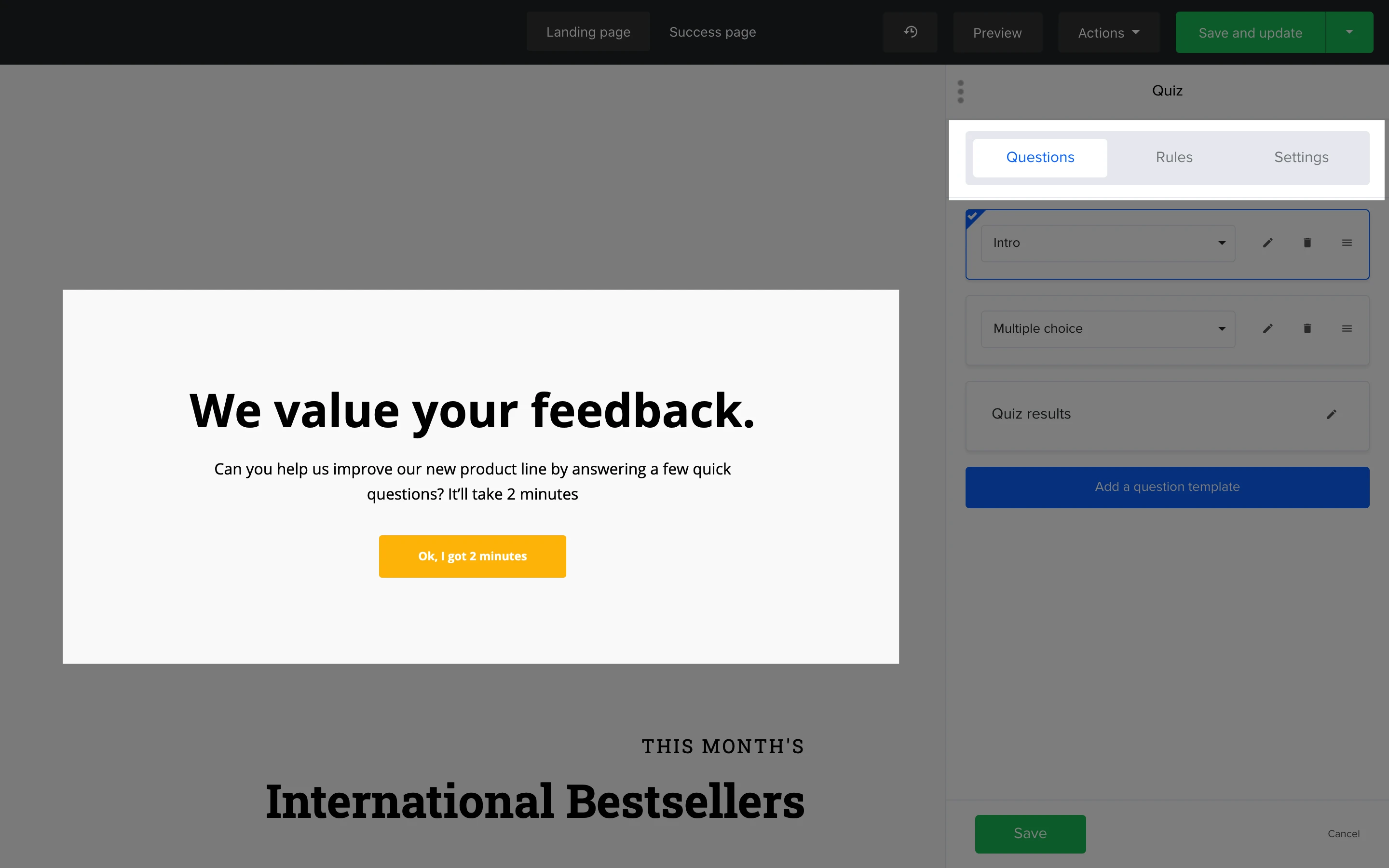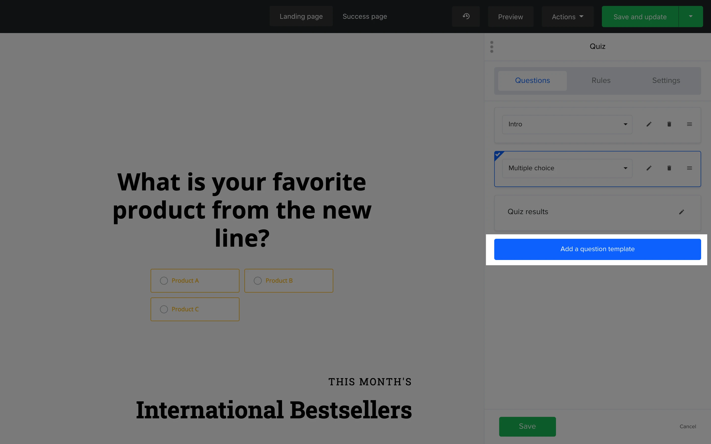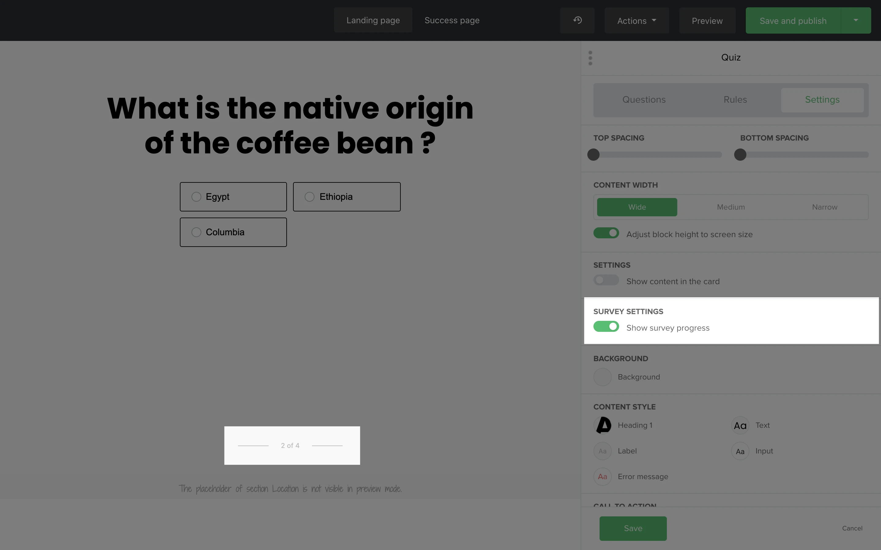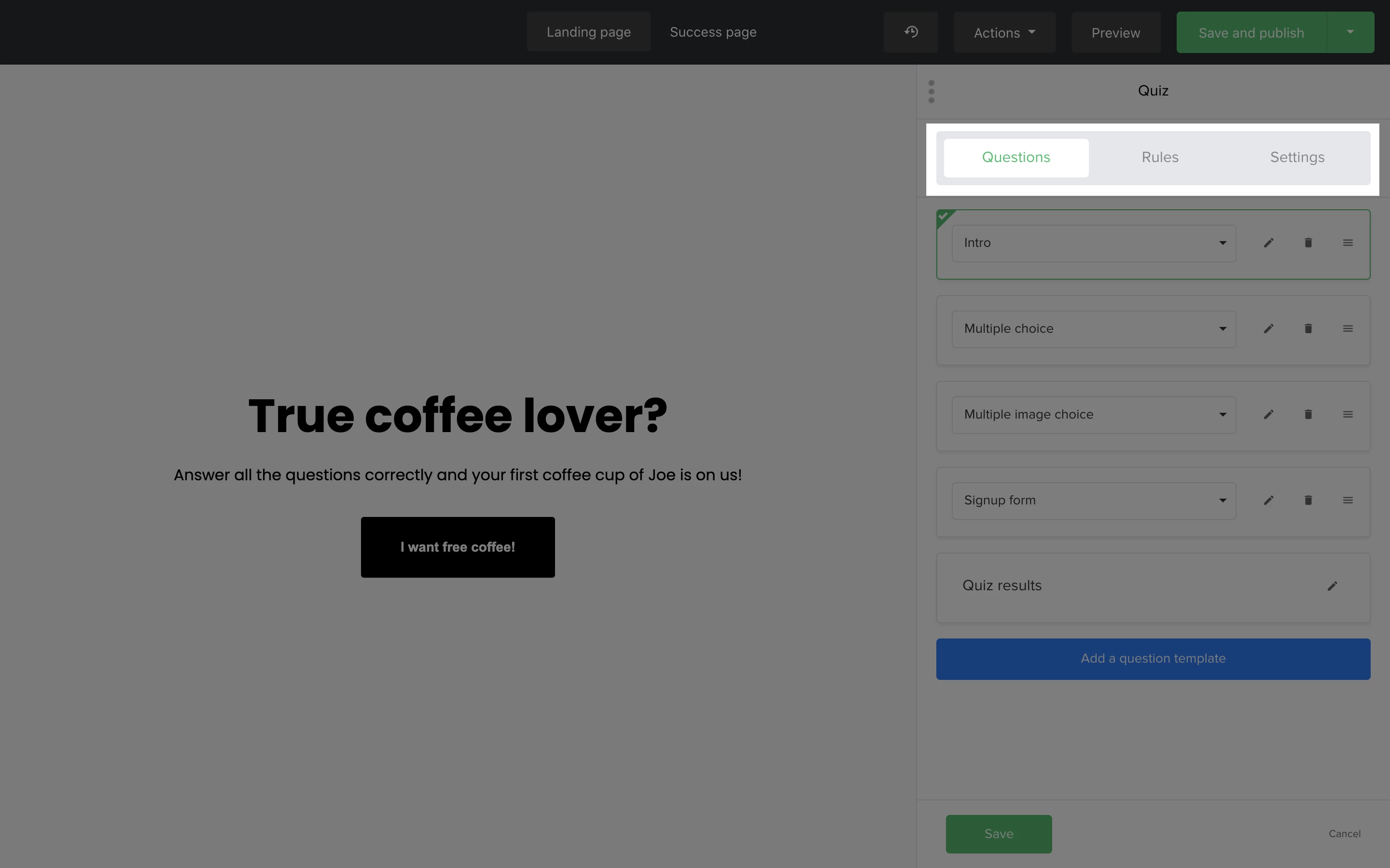 Once you’re satisfied with the design of your landing page and quiz, you can save and publish your landing page by clicking the Save and publish button. Alternatively, you can save your landing page as a draft.