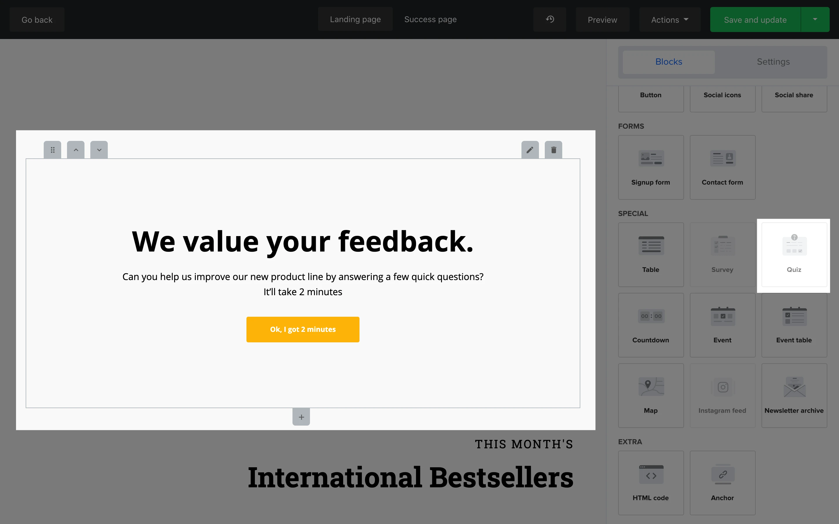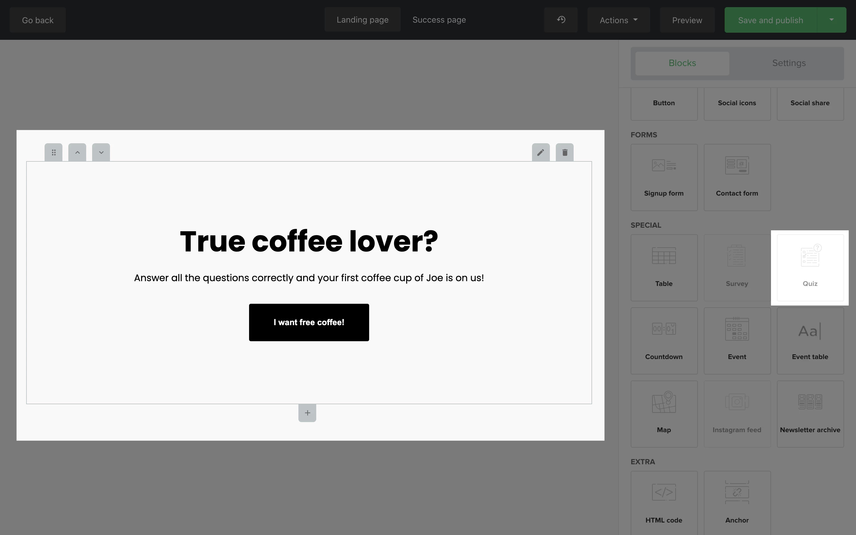Drag the Quiz block from the sidebar and drop it onto your landing page.