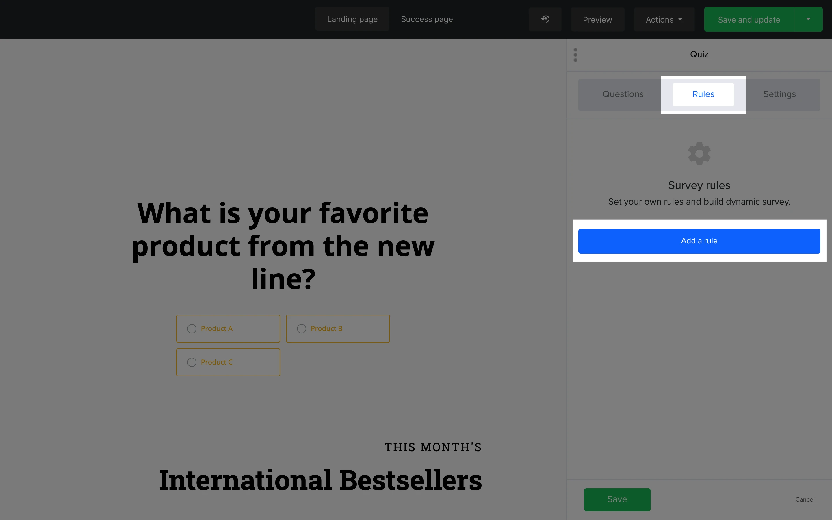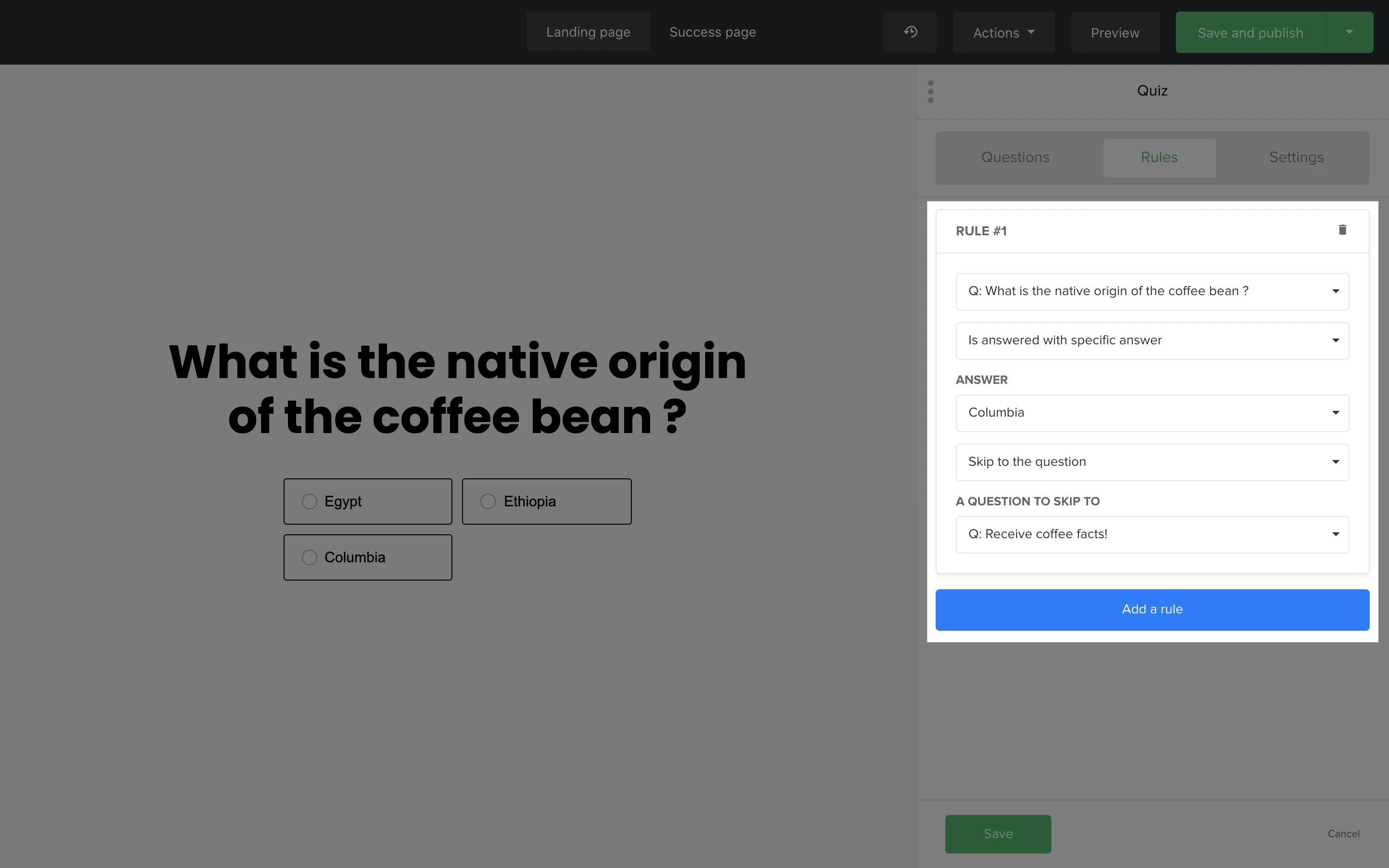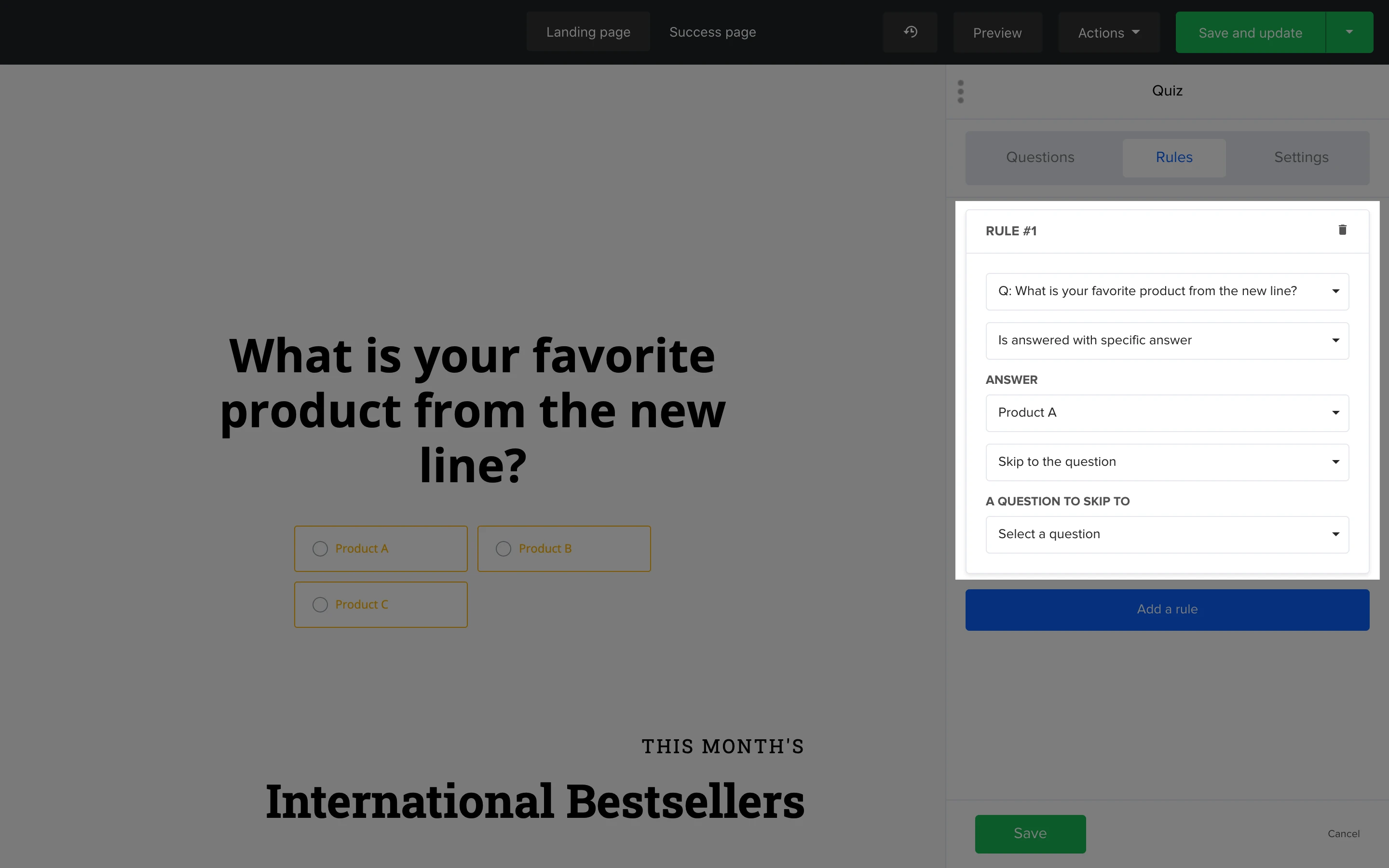 Make your quiz dynamic by adding a rule. In the Rules tab, you can predefine a rule that skips questions based on how a participant responds to another question.