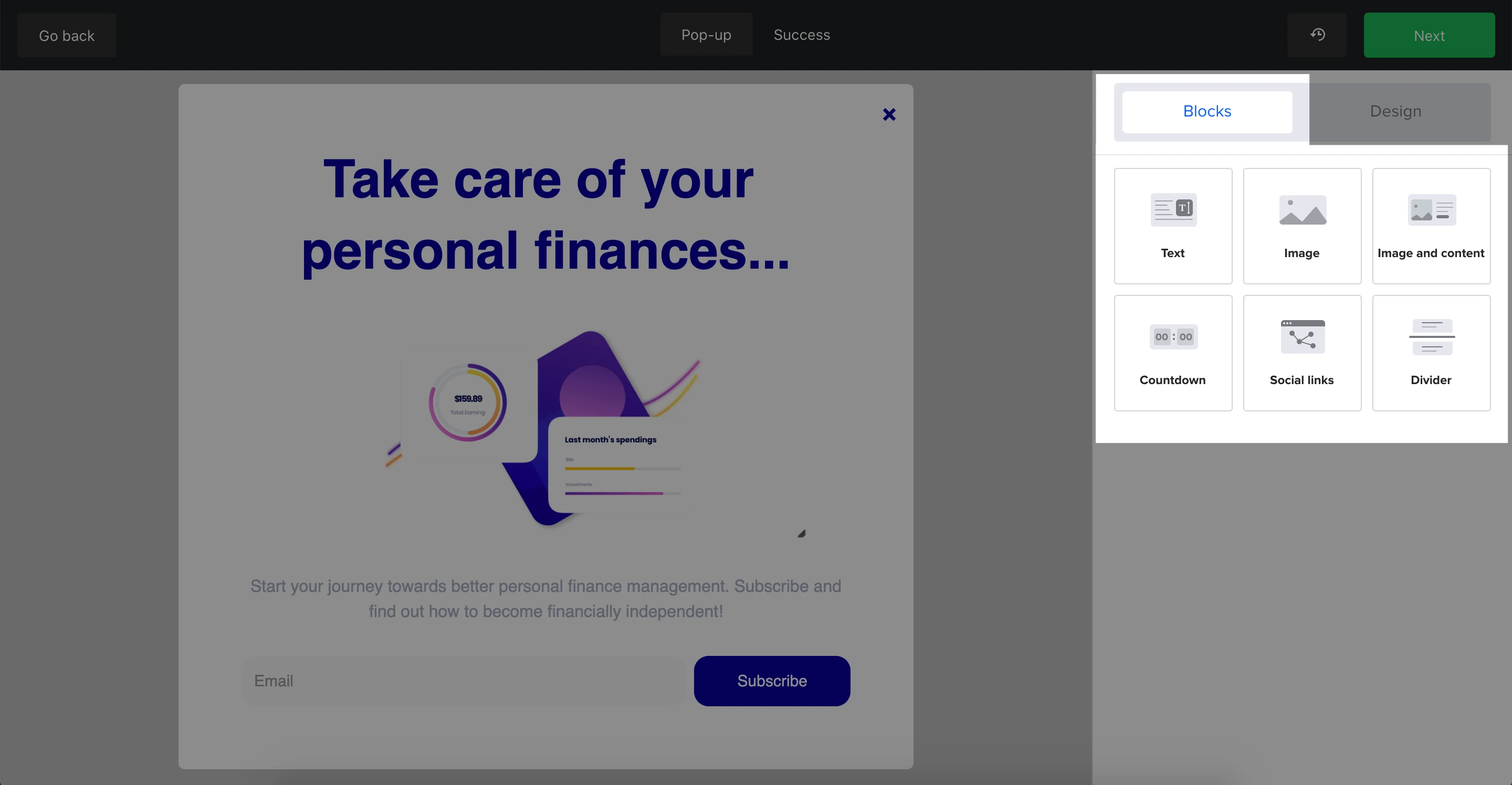 Countdown - Use this block to create urgency by adding a countdown timer to your pop-up form