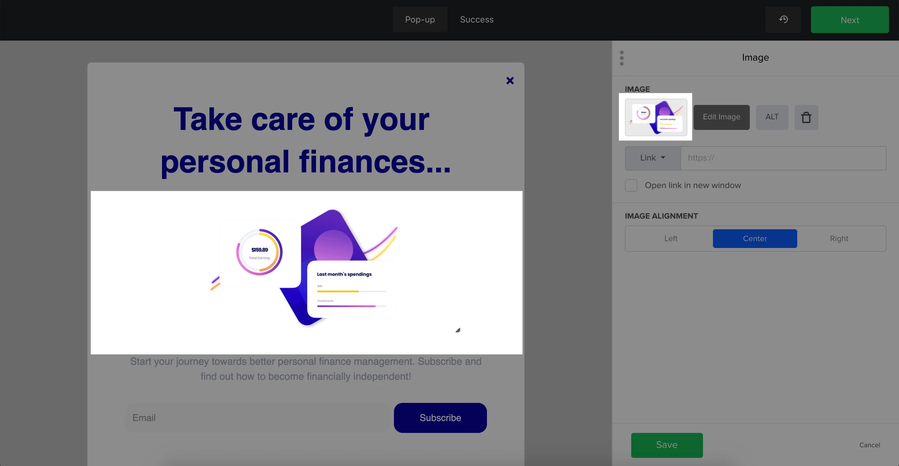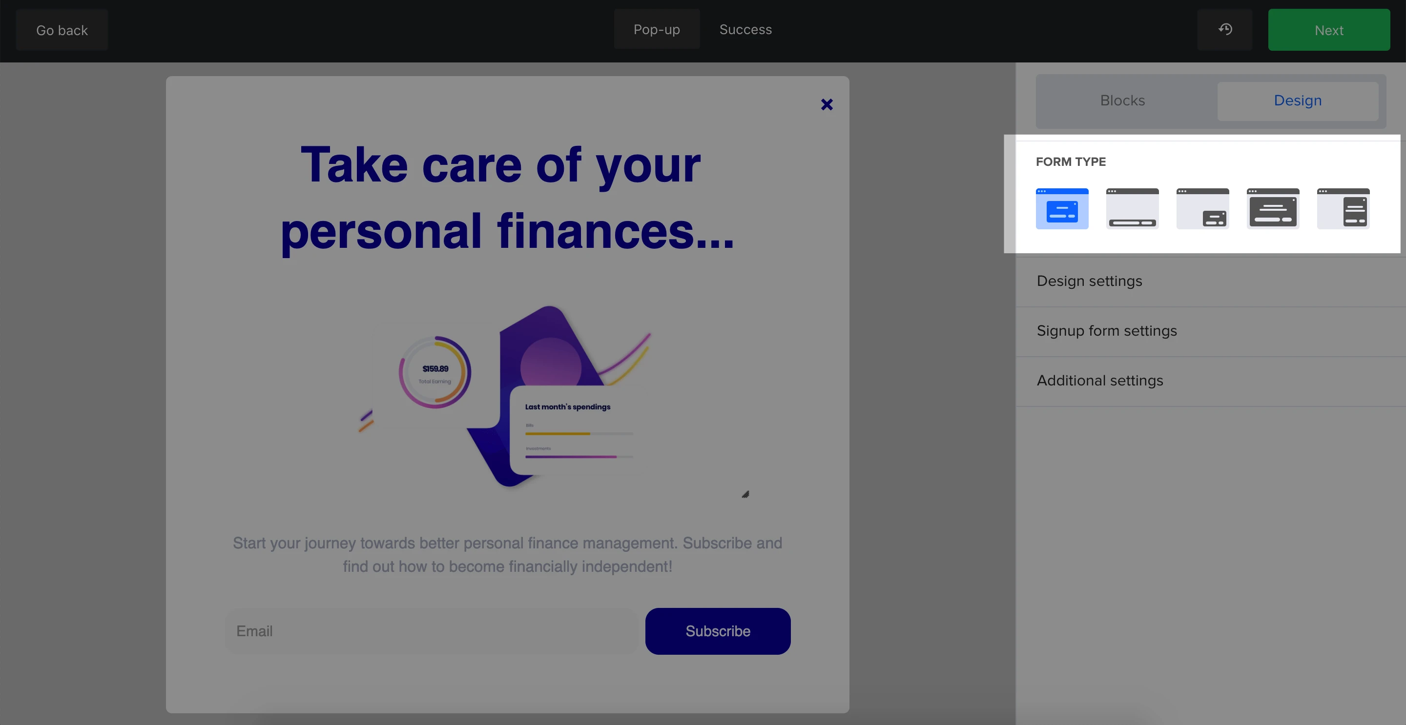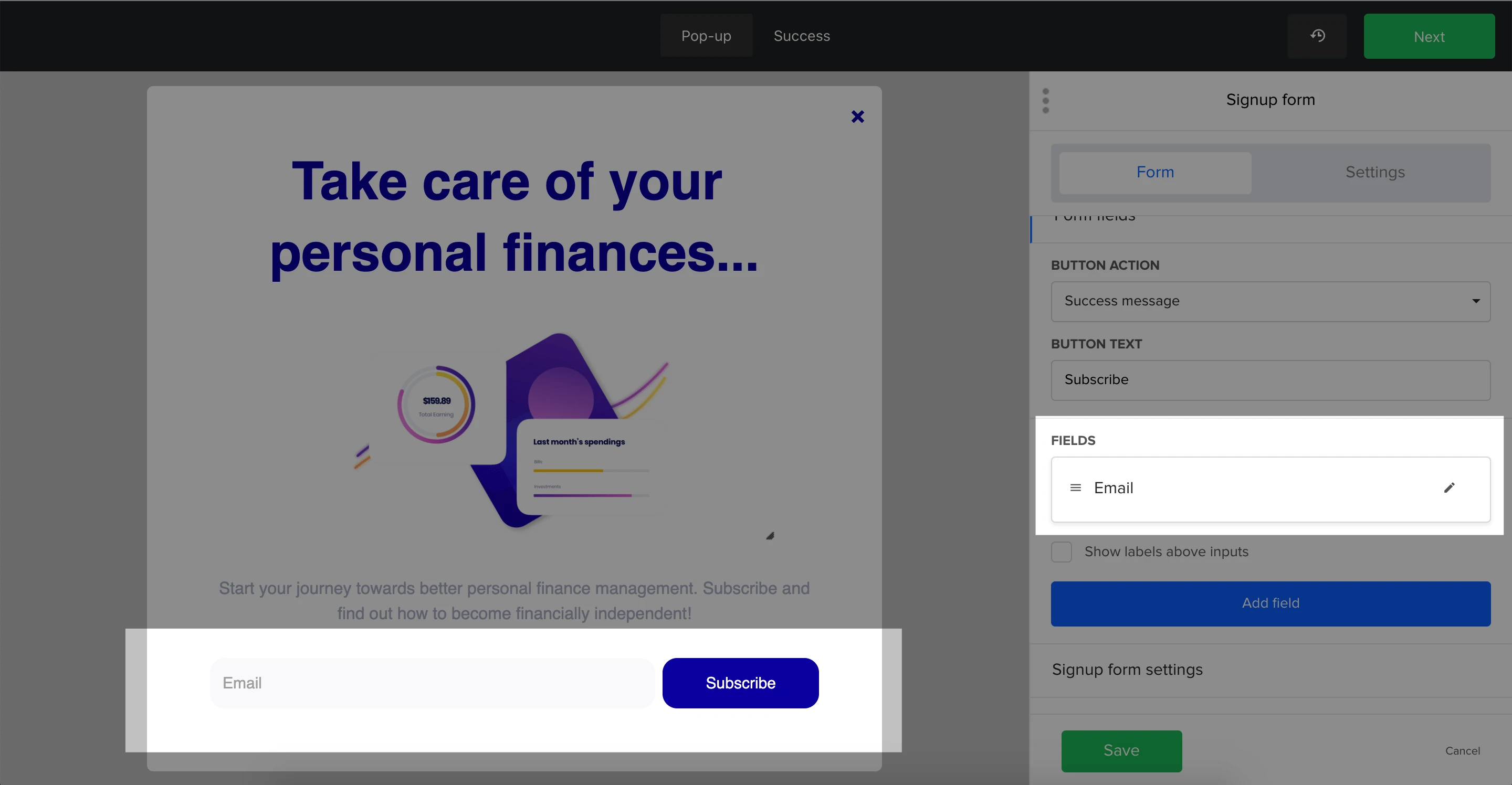 12. Edit your pop-up form’s success page by clicking the Success button along the top navigation bar.