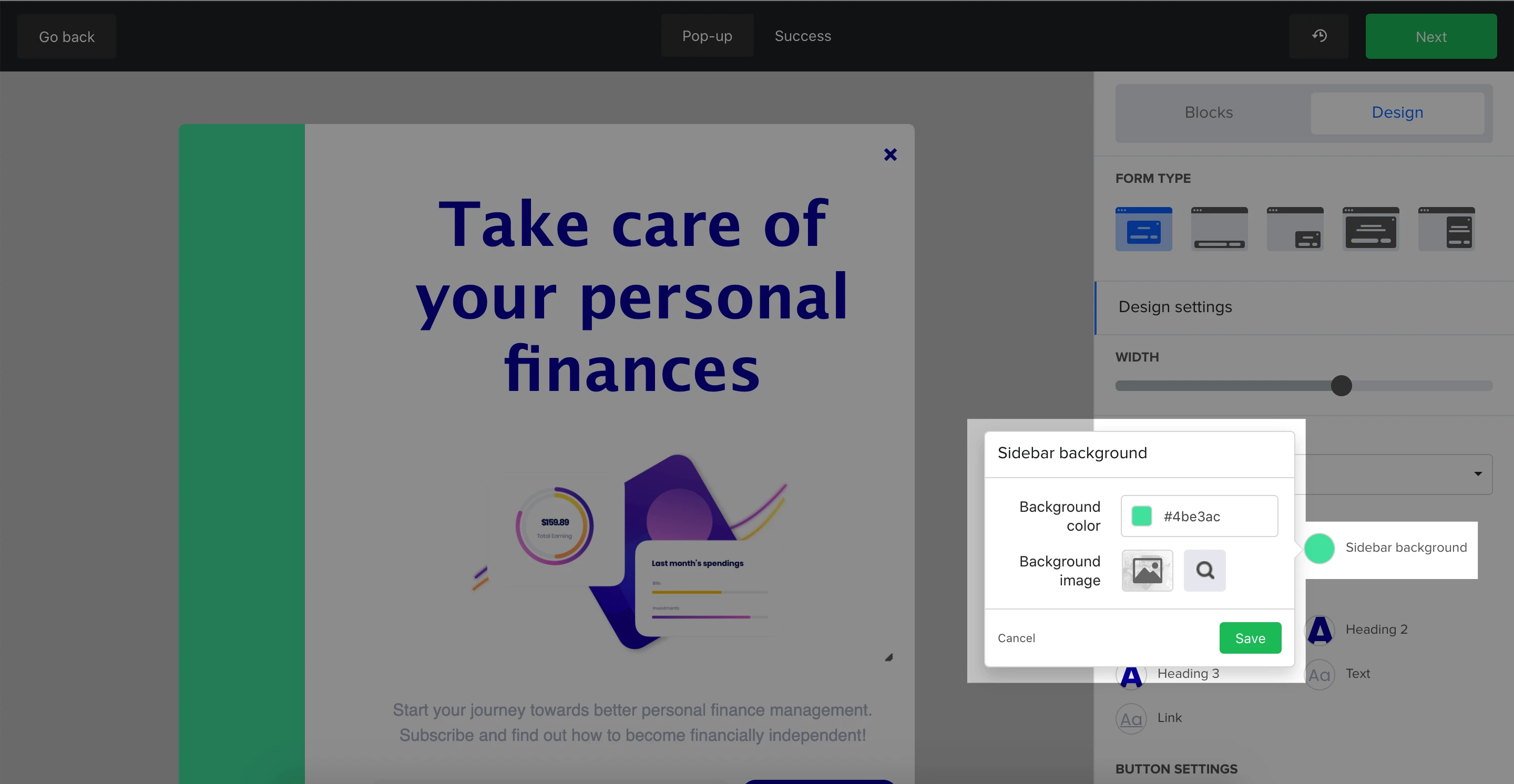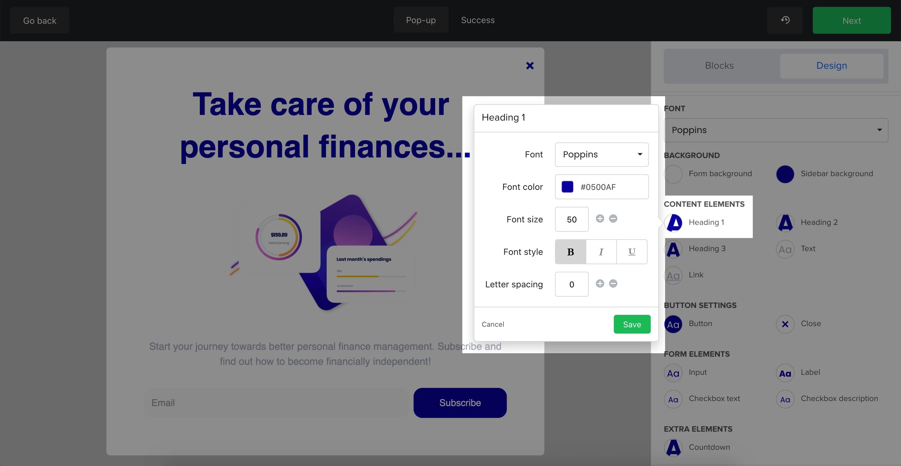 Consistent branding helps your popup blend seamlessly with the rest of your website and marketing materials. Instead of manually adjusting each design element, you can make changes here and have them apply instantly across your popup.