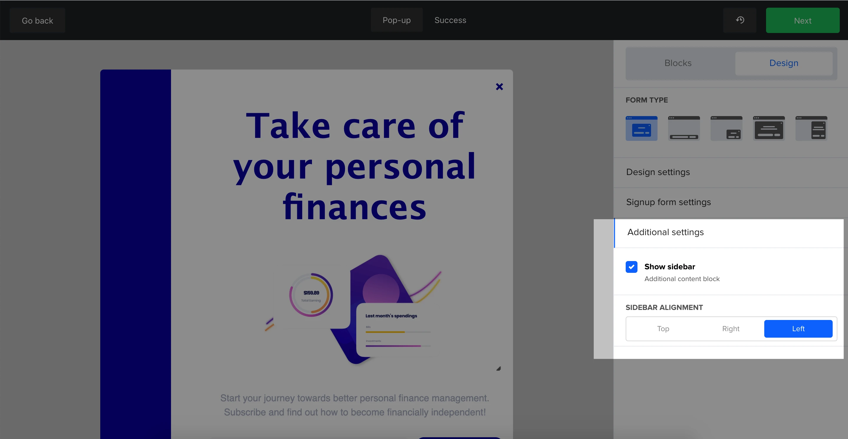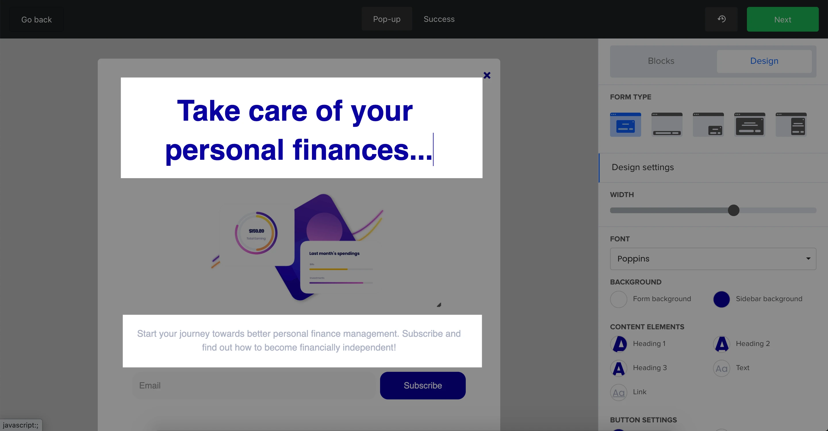 Under the Elements tab, you can drag and drop additional content blocks in your pop-up form.