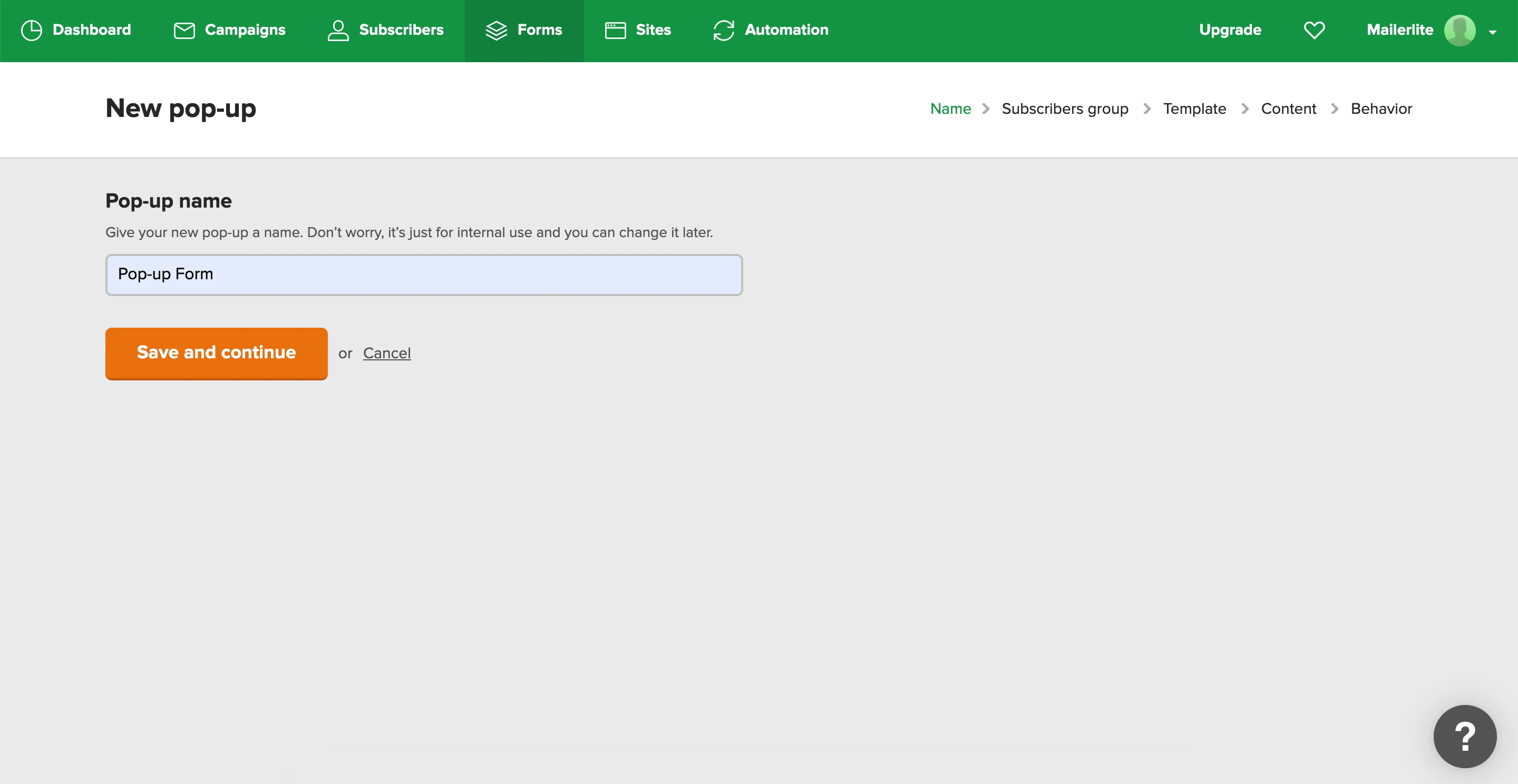 Once you’re satisfied with your pop-up’s behavior settings, click Save and continue to carry on to the next step: installing your pop-up form.
