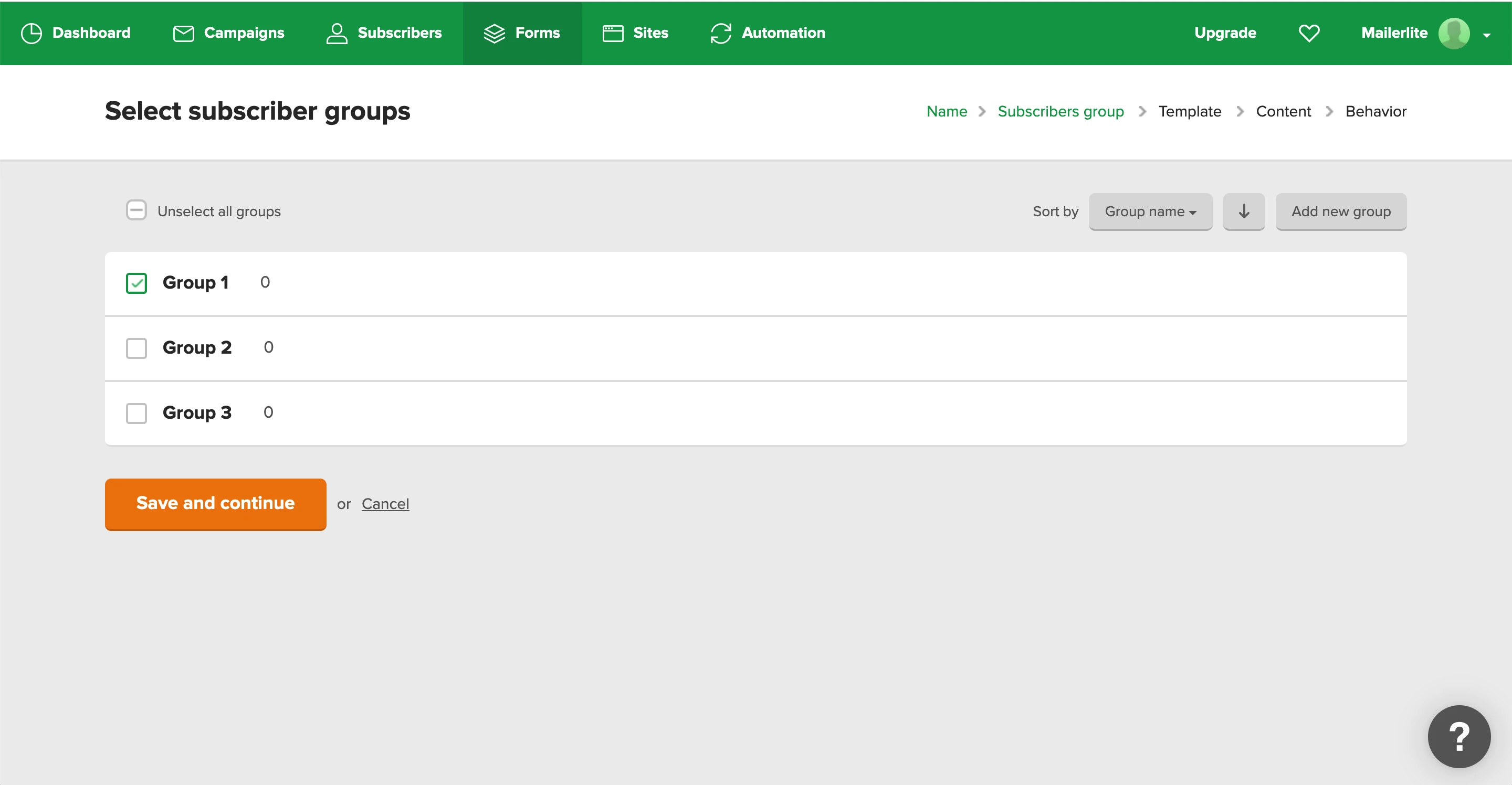 6. Select at least one group for your pop-up form. When subscribers complete your pop-up form they will be added to the group(s) you select here.