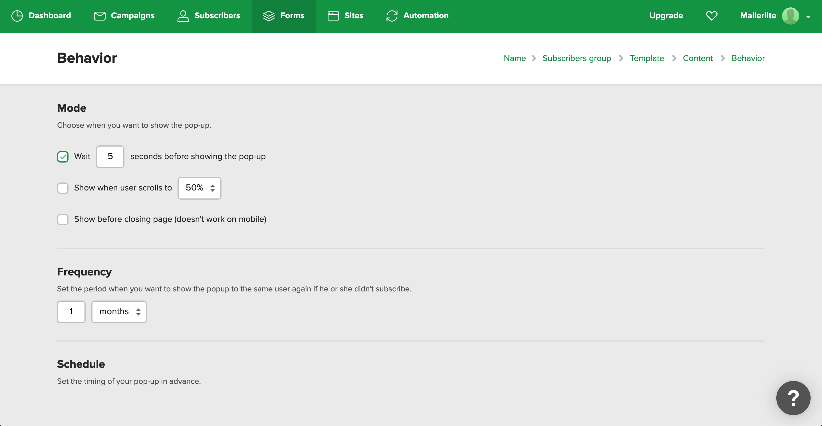 Frequency - Choose how often your pop-up appears for the same visitor if they don’t subscribe the first time they see the pop-up