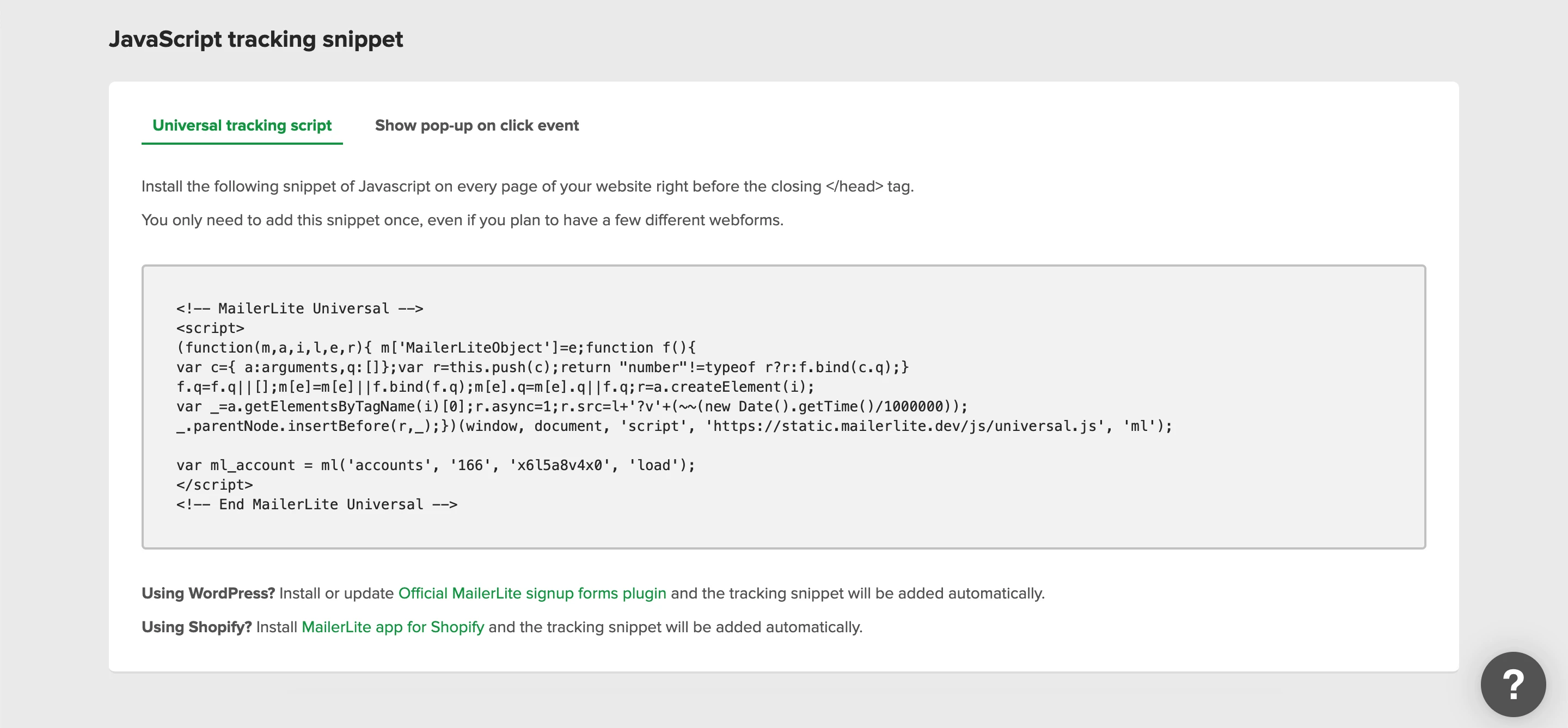 Scroll down to the JavaScript tracking snippet section. Here you will find the scripts you need, which should be inserted on each page of your site that you wish to add the pop-up too. Usually, the CMS has a special spot to implement this code and showcase it on every page.
