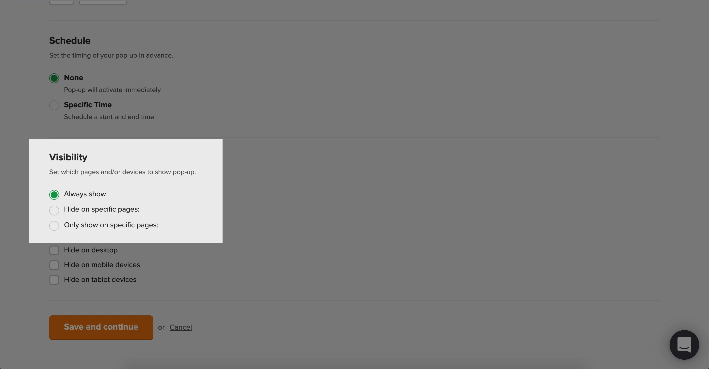Visibility - Choose whether you want to hide your pop-up on specific devices, or hide/show your pop-up on specific webpages