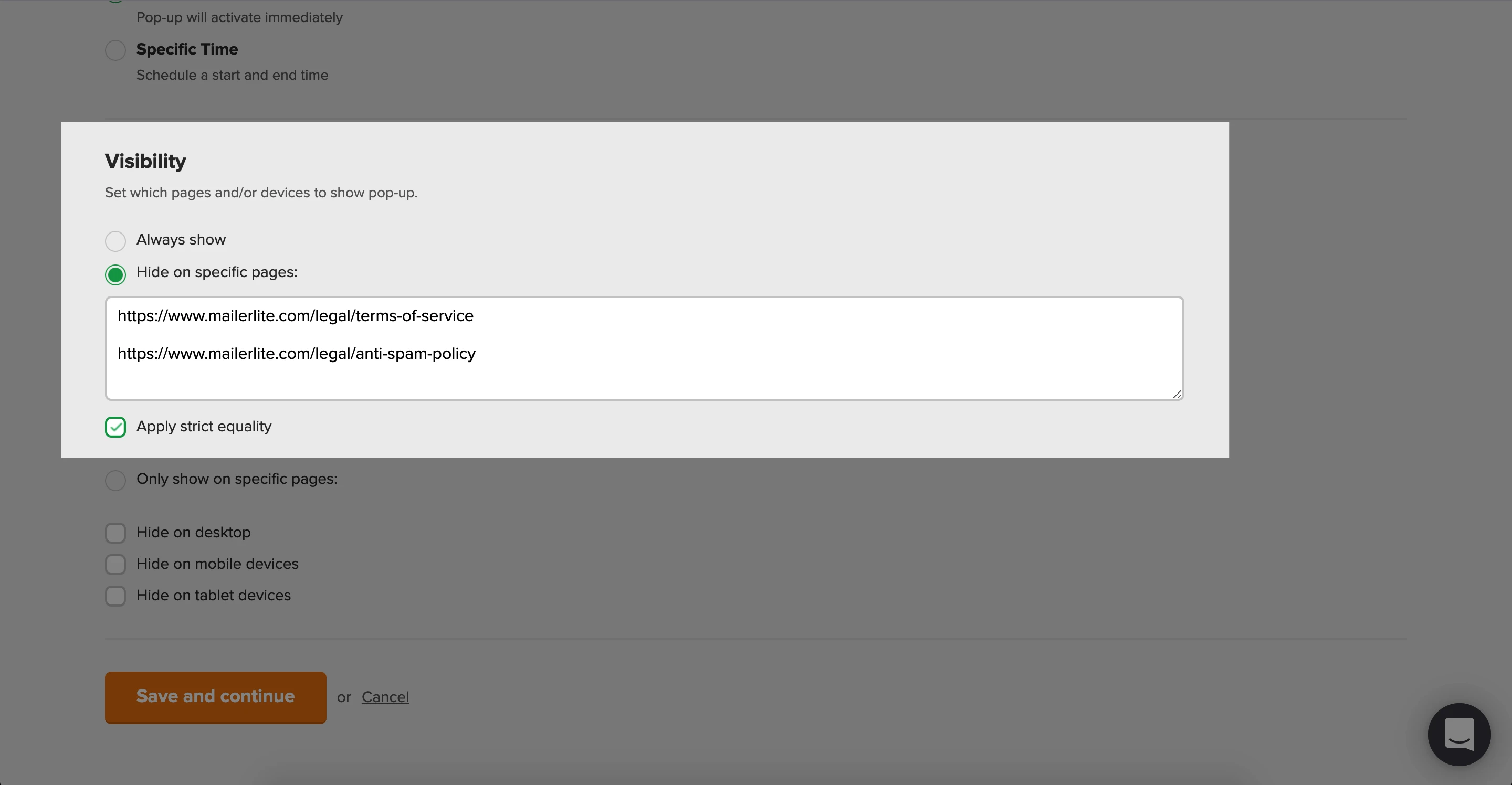 Checkmark the box labeled Apply strict equality to have your pop-up hidden only on pages that match the entered URLs exactly.