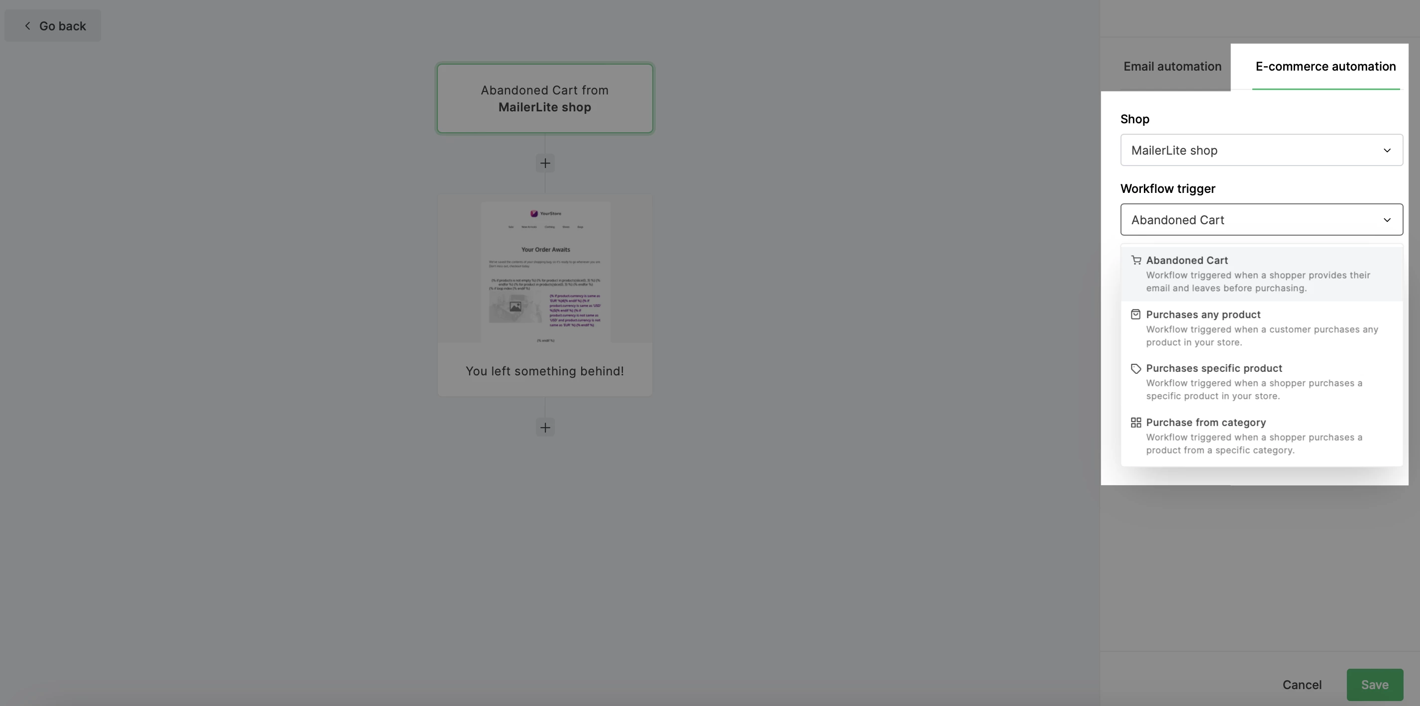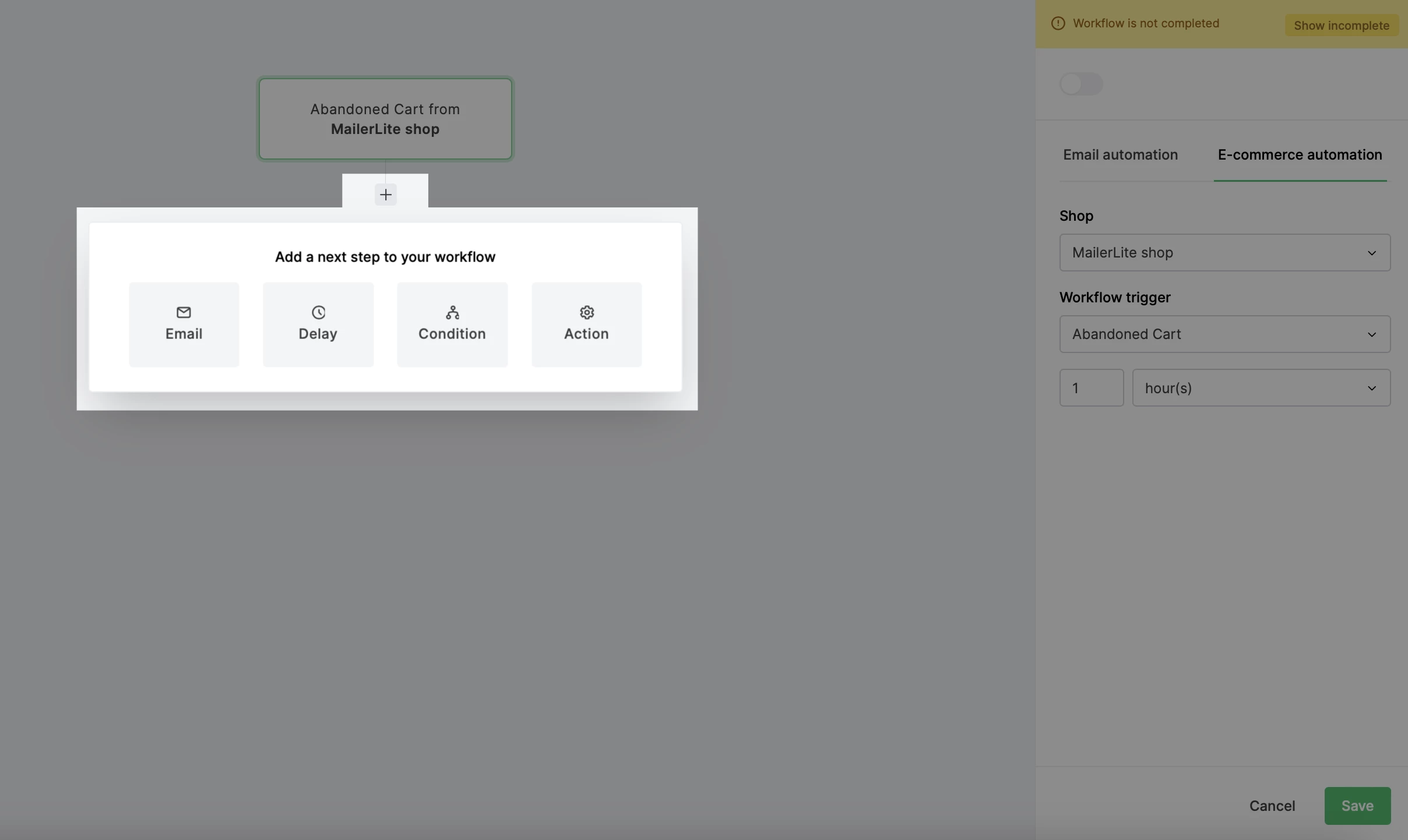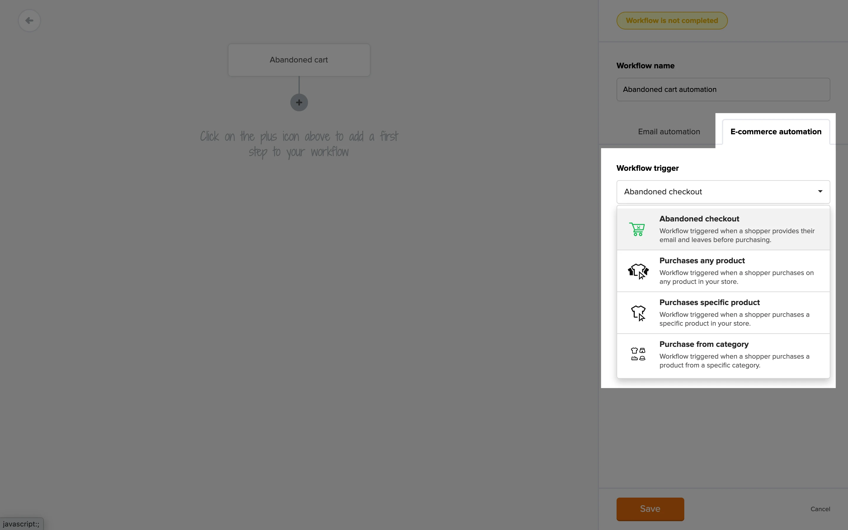 When you integrate your MailerLite account with WooCommerce, Shopify, BigCommerce, or PrestaShop, you will find e-commerce automation triggers available in your workflow editor. One of these triggers is Abandoned cart.
