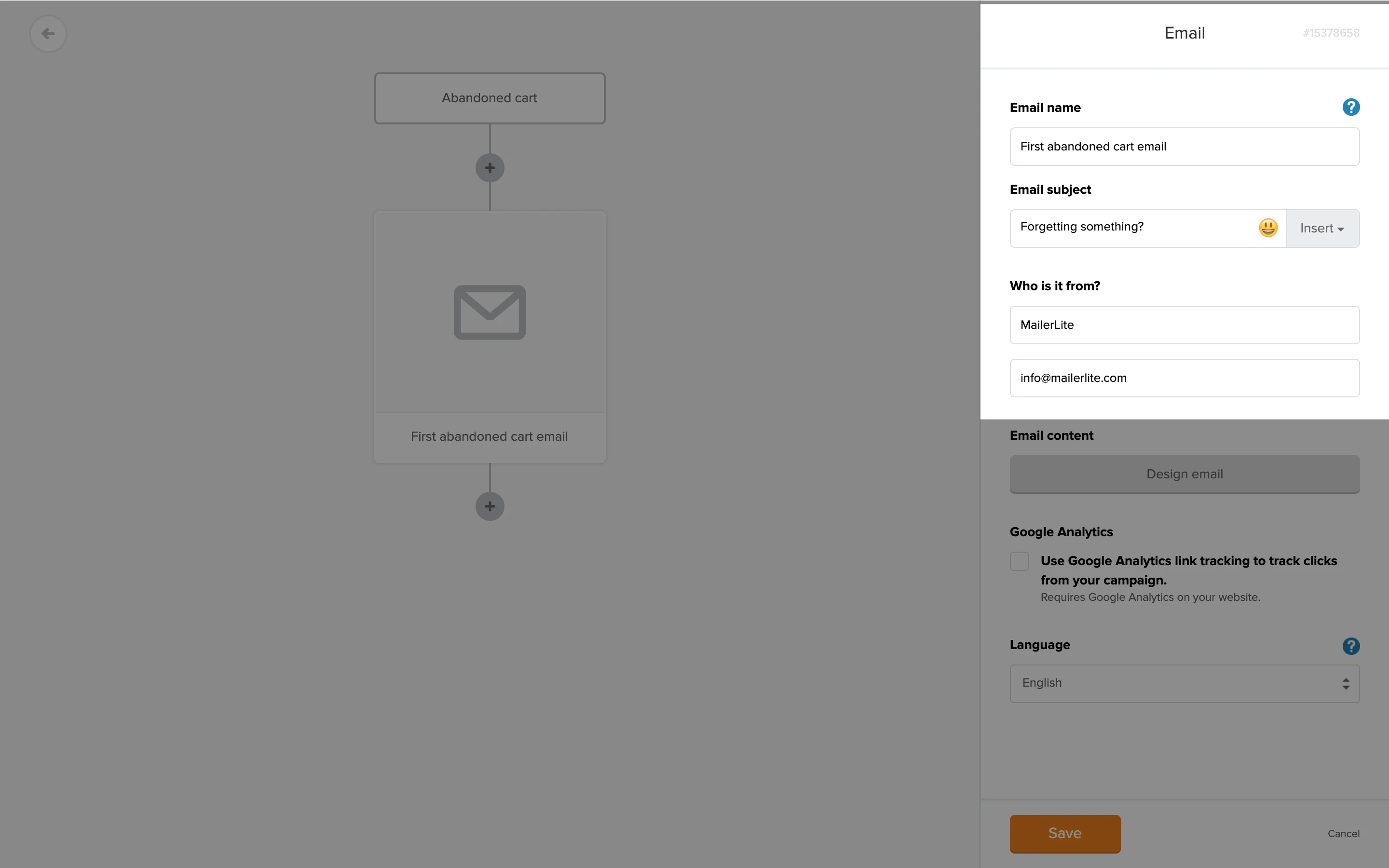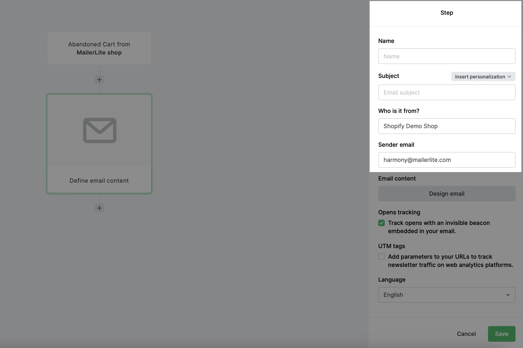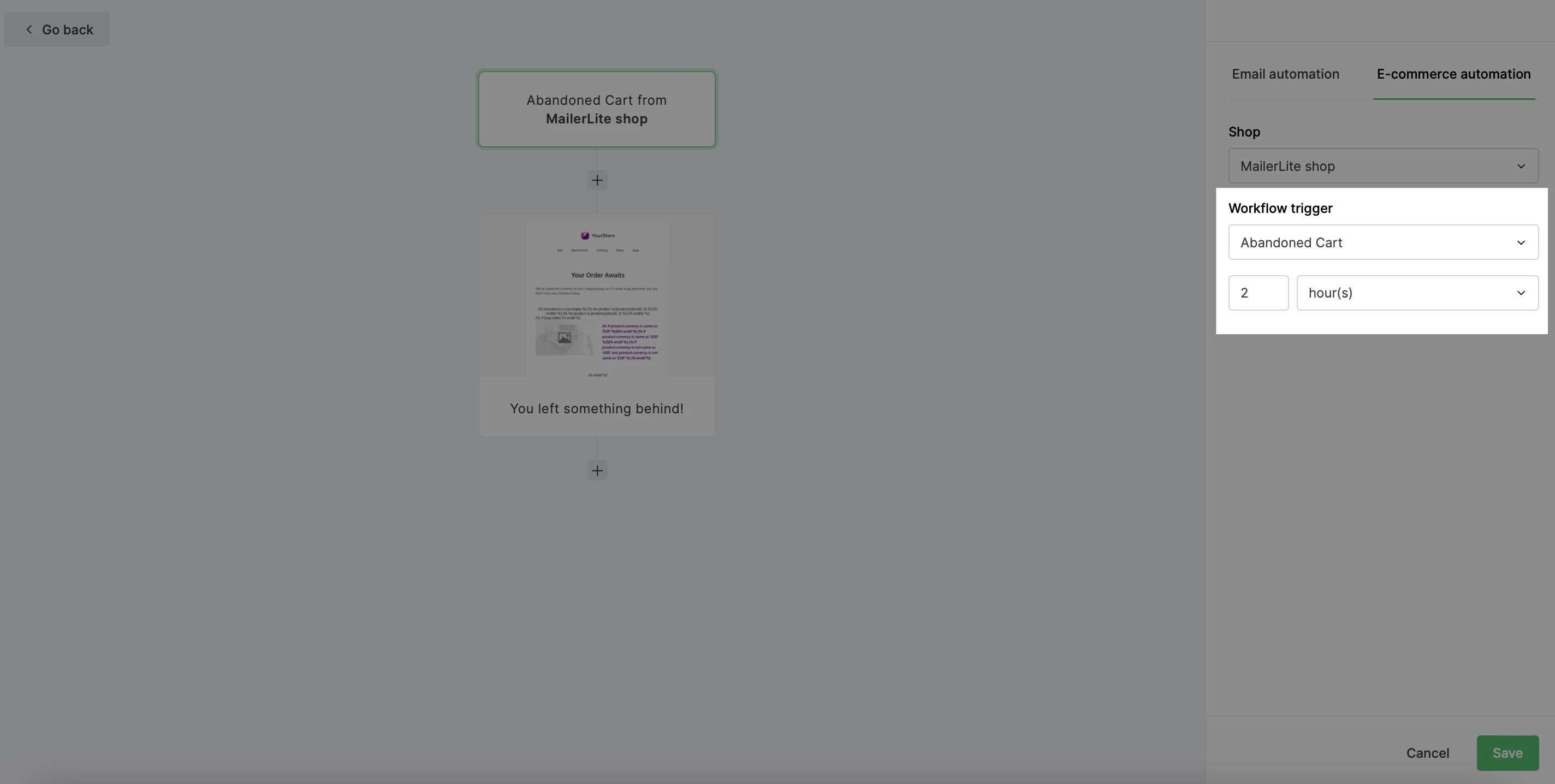When you integrate your MailerLite account with WooCommerce, Shopify, BigCommerce, or PrestaShop, you will find e-commerce automation triggers available in your workflow editor. One of these triggers is Abandoned cart.