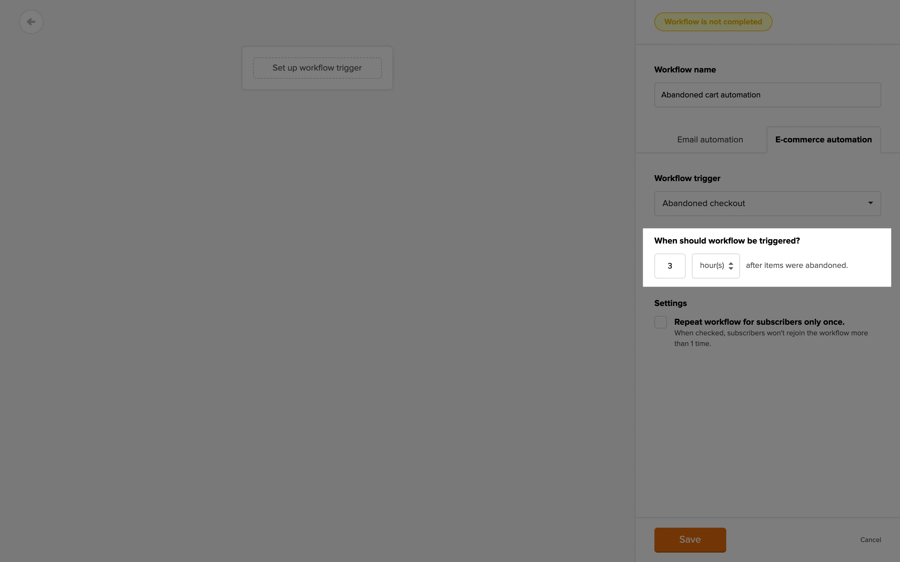 5. Select the amount of time after cart abandonment before you want your workflow to trigger.