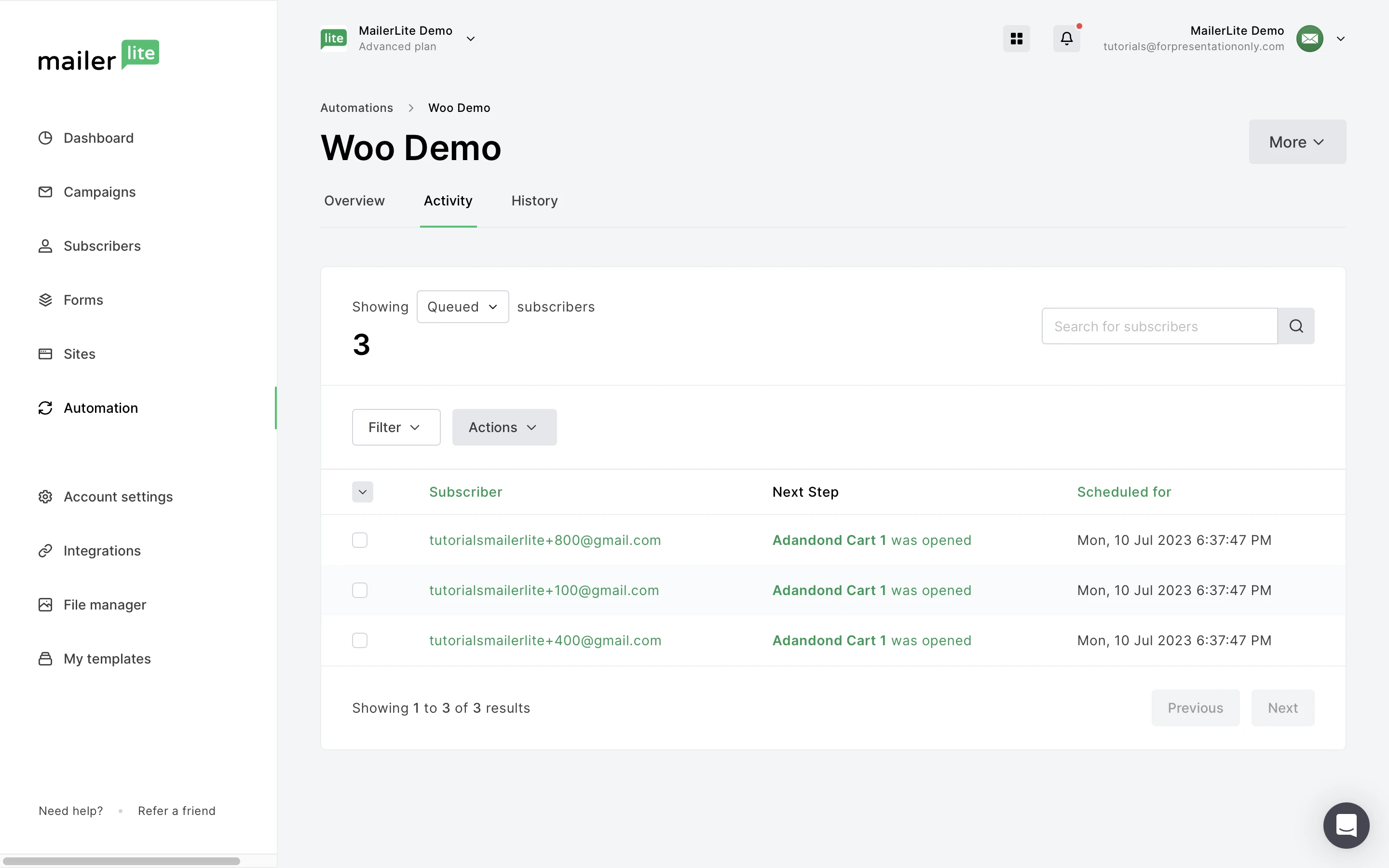 When a shopper triggers an abandoned cart workflow, you can track the status of the cart in our Automation Activity. The shoppers that are still in the abandoned cart sequence fall under the Queued or Completed status.