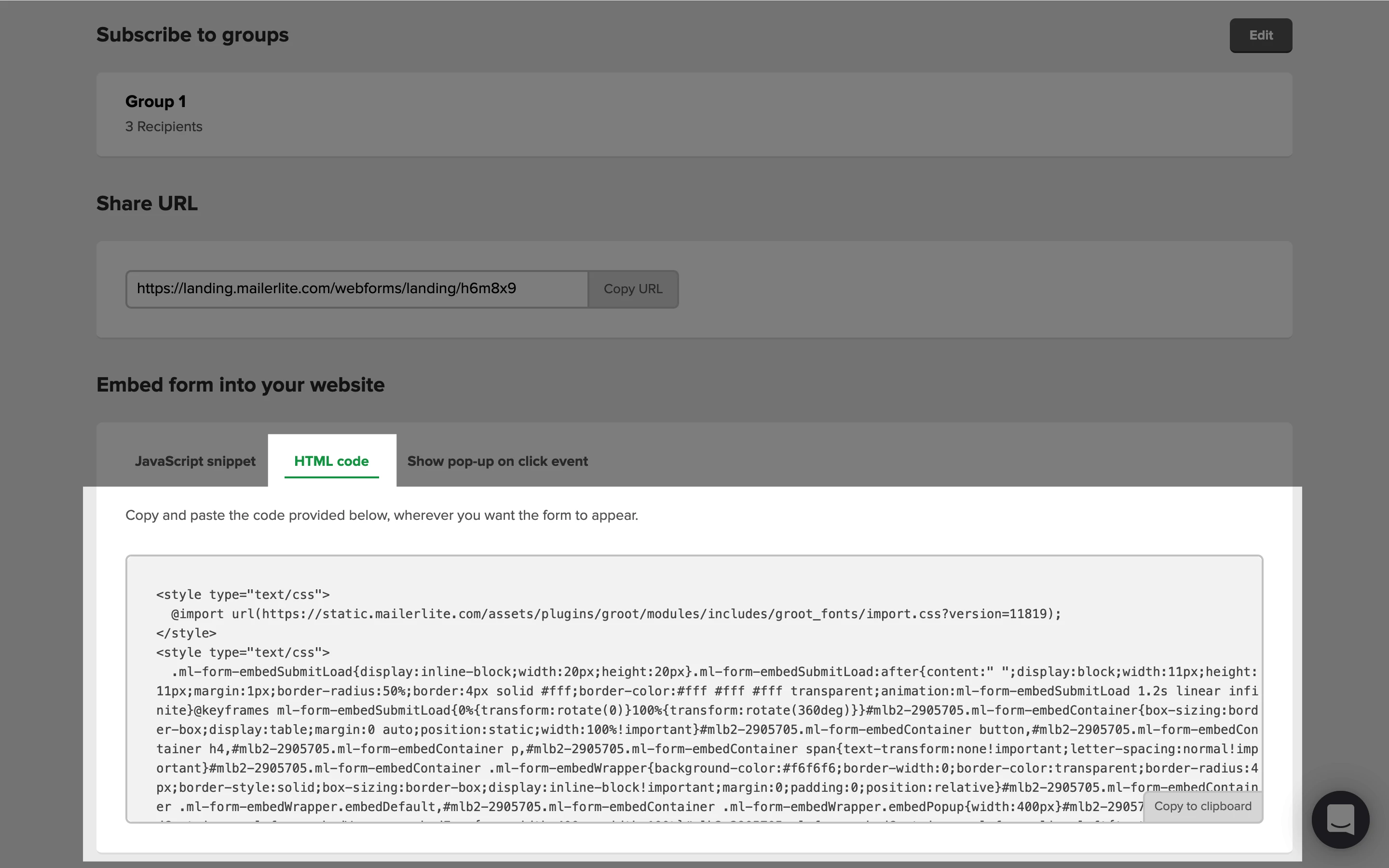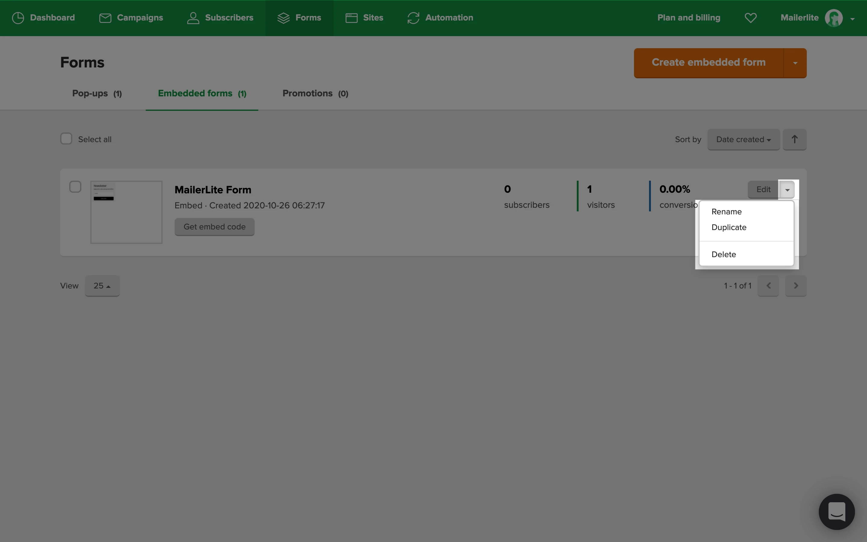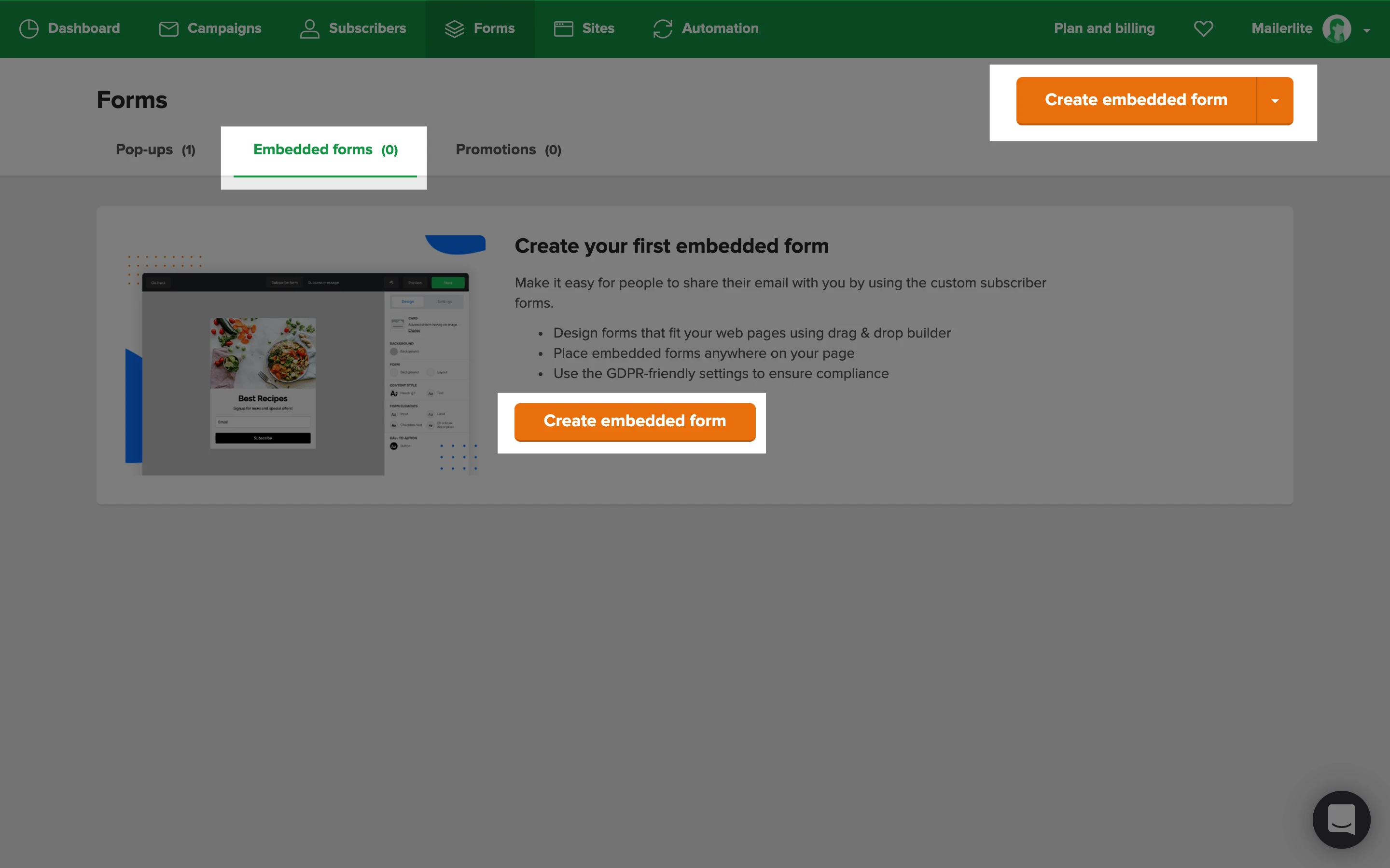 An embedded form is a sign-up form used to collect subscribers and add them straight to MailerLite. You create your embedded form in MailerLite and display it on your own website as part of a webpage.