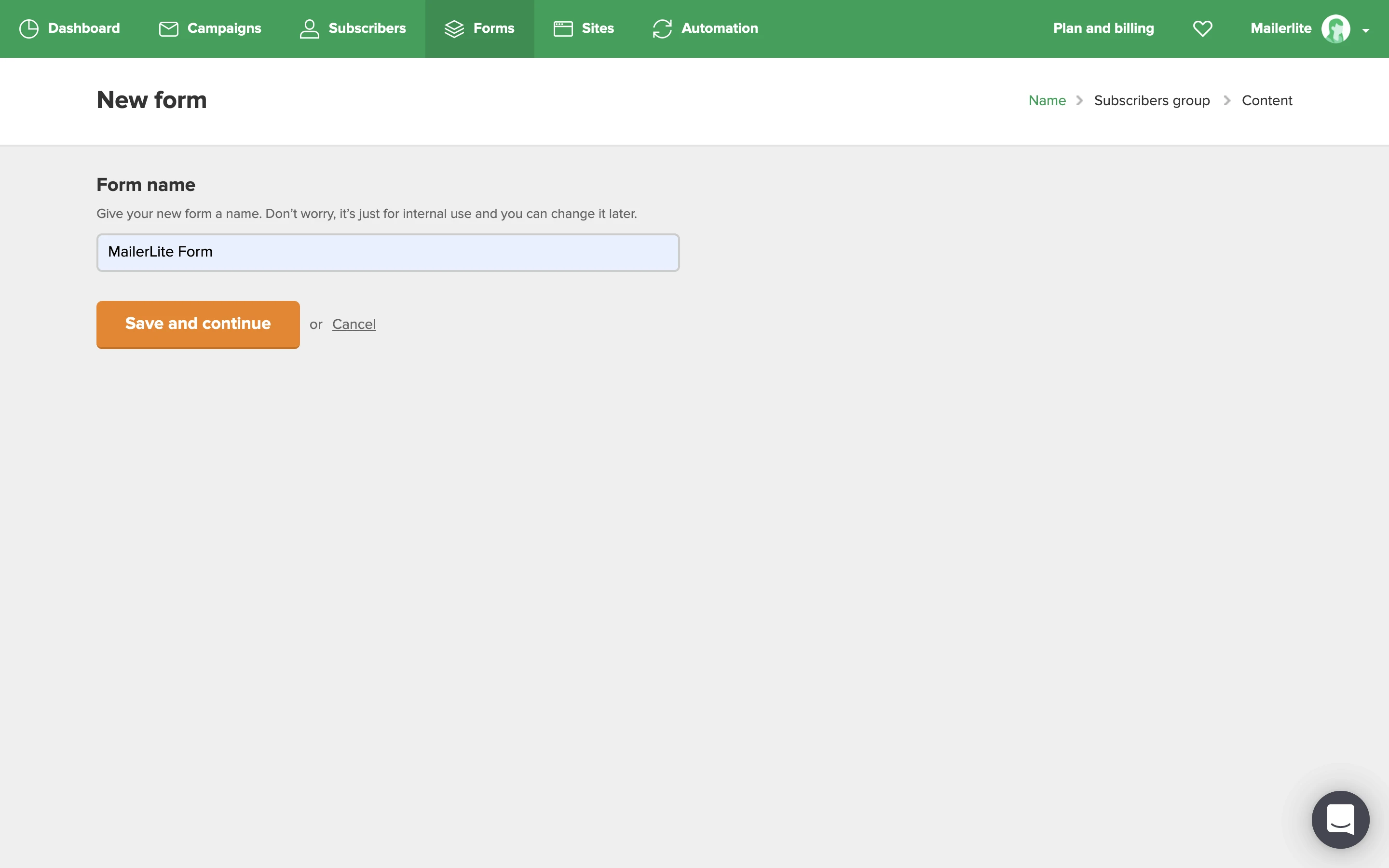 Give your form a name (this is for internal purposes only and you can change it later) and select the form type Embedded form.