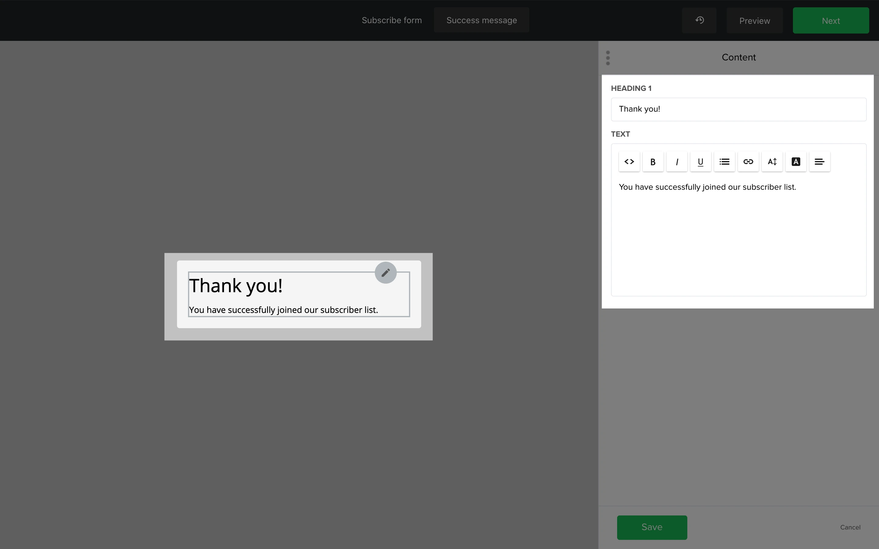 The success message is what your subscribers see after they successfully complete your form. To edit your success message: