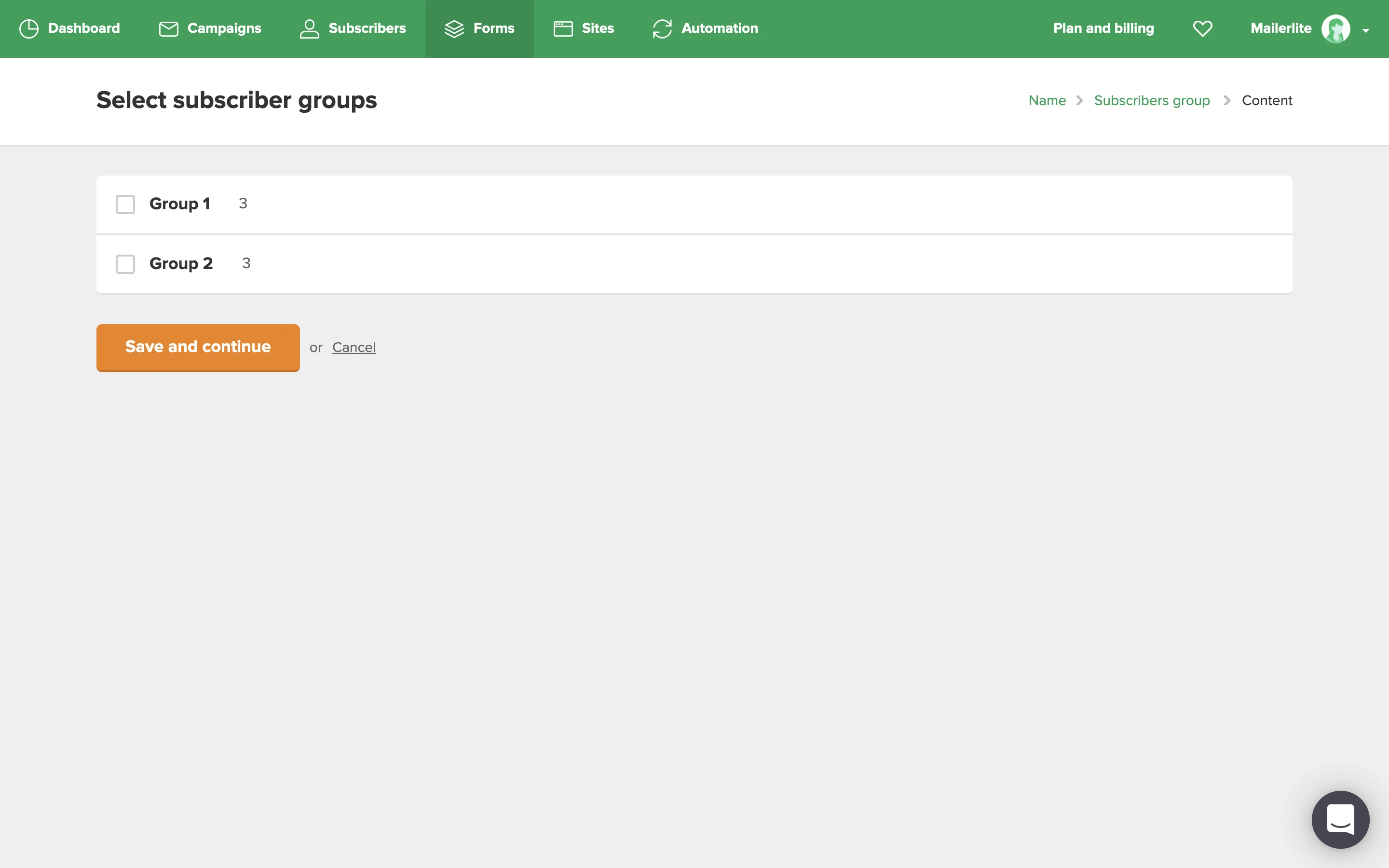 6. Select a subscriber group and click Continue. This important step allows you to select the group(s) into which subscribers of this form will be added.
