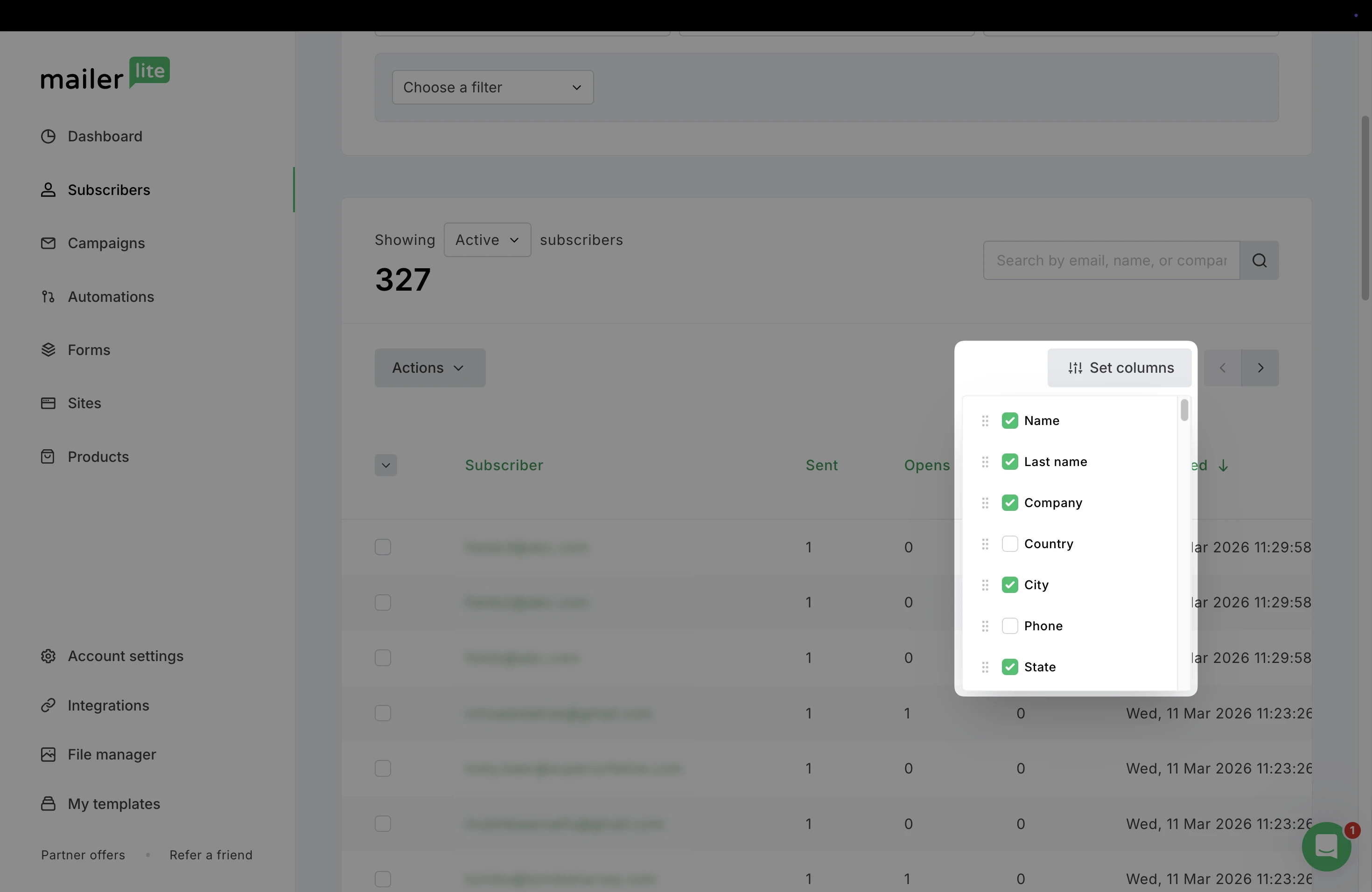 When viewing your mailing list on the Subscribers page, you can see your subscribers’ email address, opens, clicks, the date they subscribed, and their location. If you wish to add data from custom fields to the general overview: