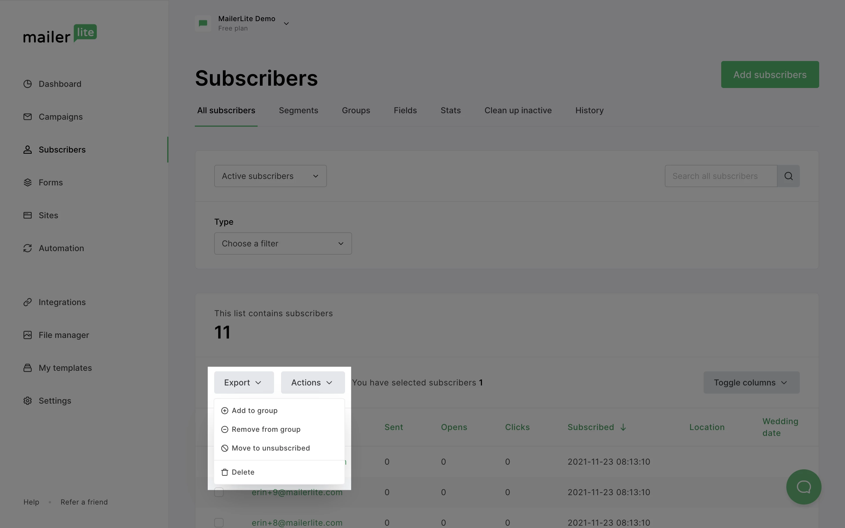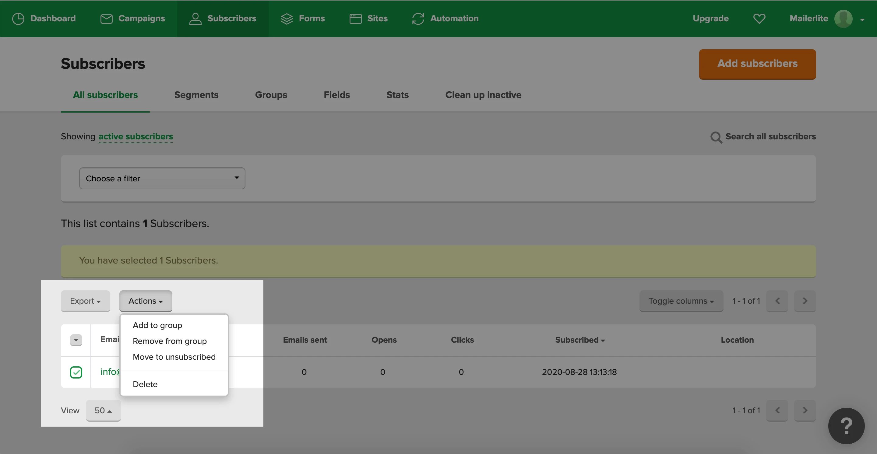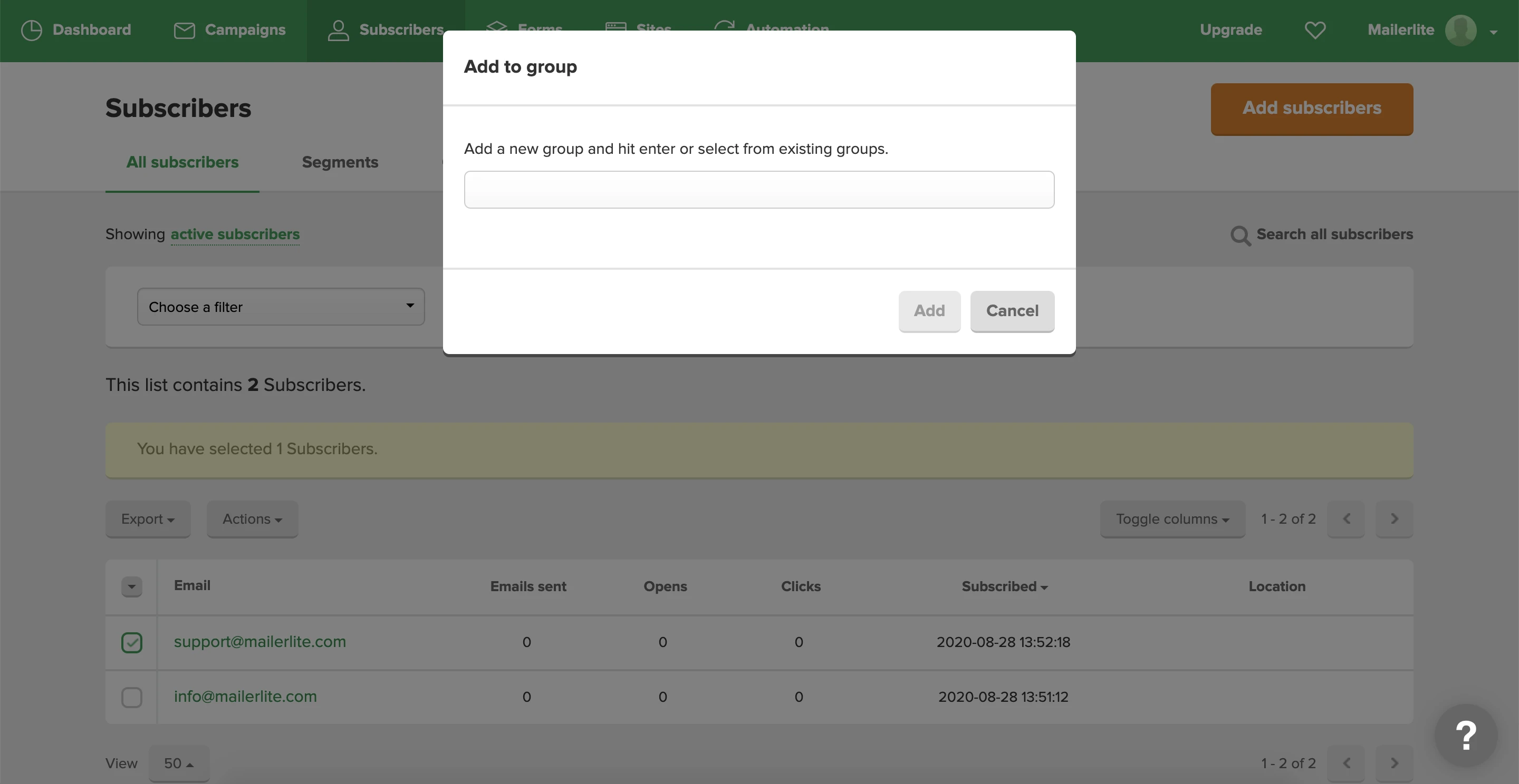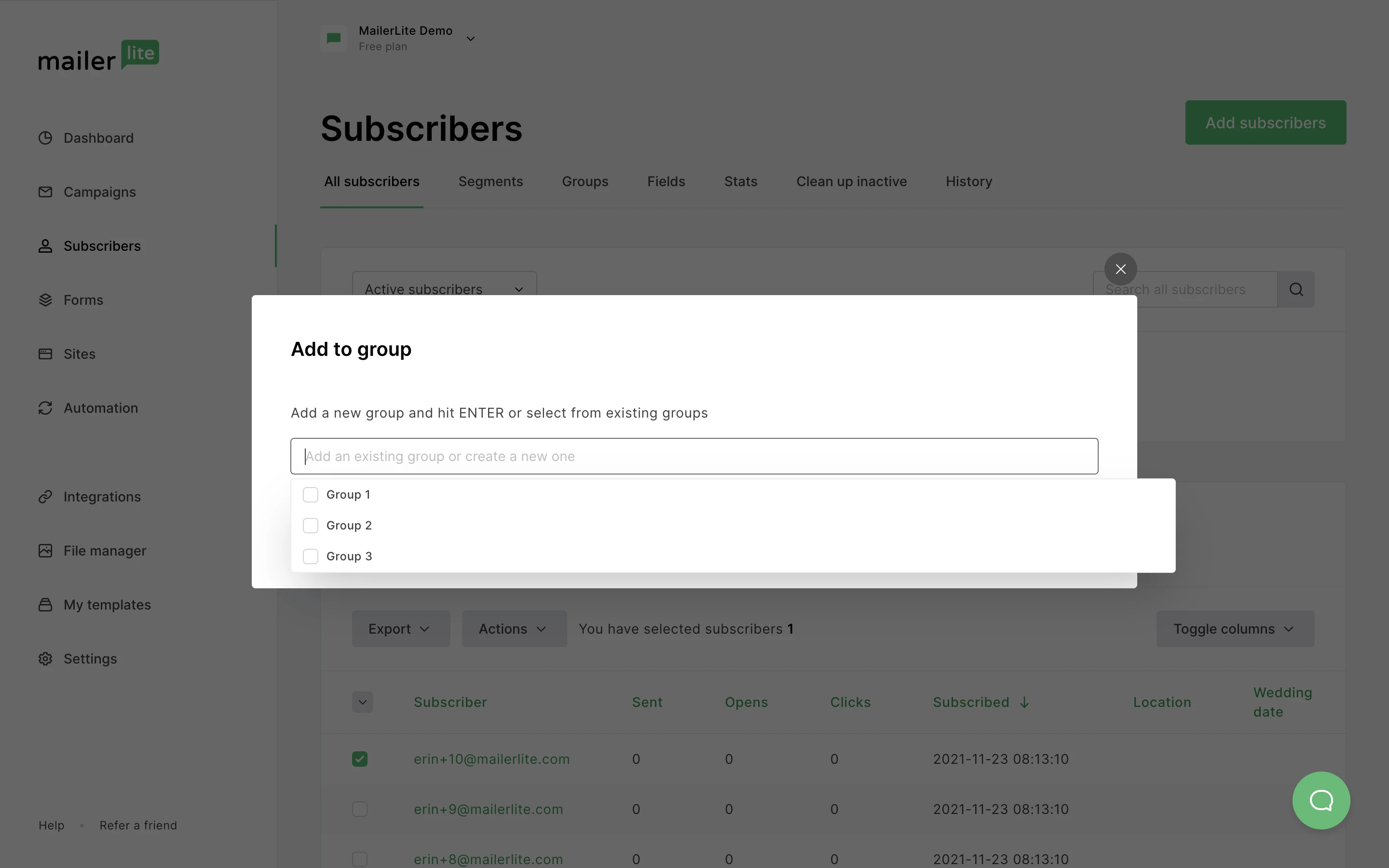 Here you can view all your subscribers. To add subscribers to a group: