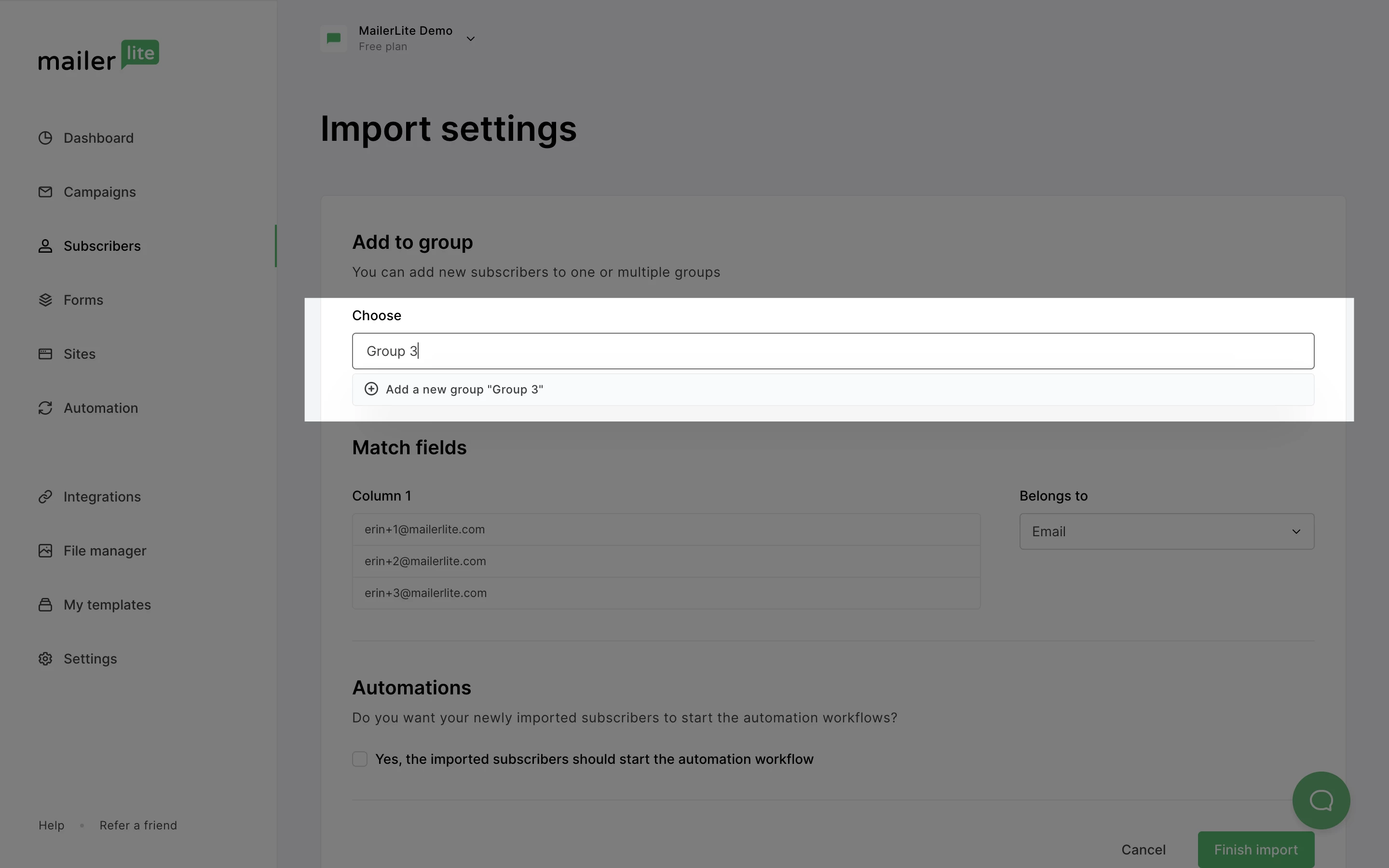 On the import settings page, the first step is to select a group. Type the name of your new group into the input field, and hit the return key to create it.
