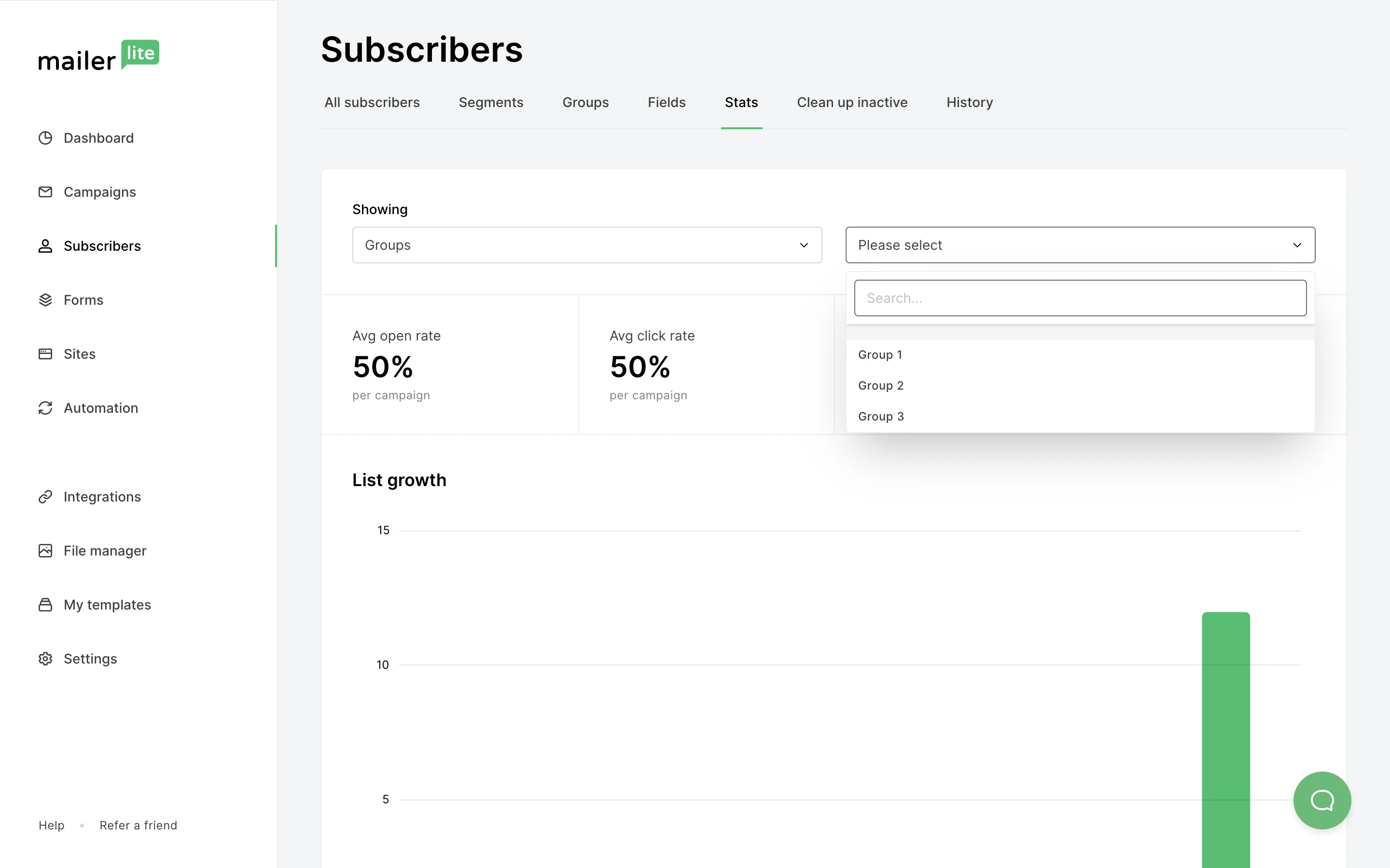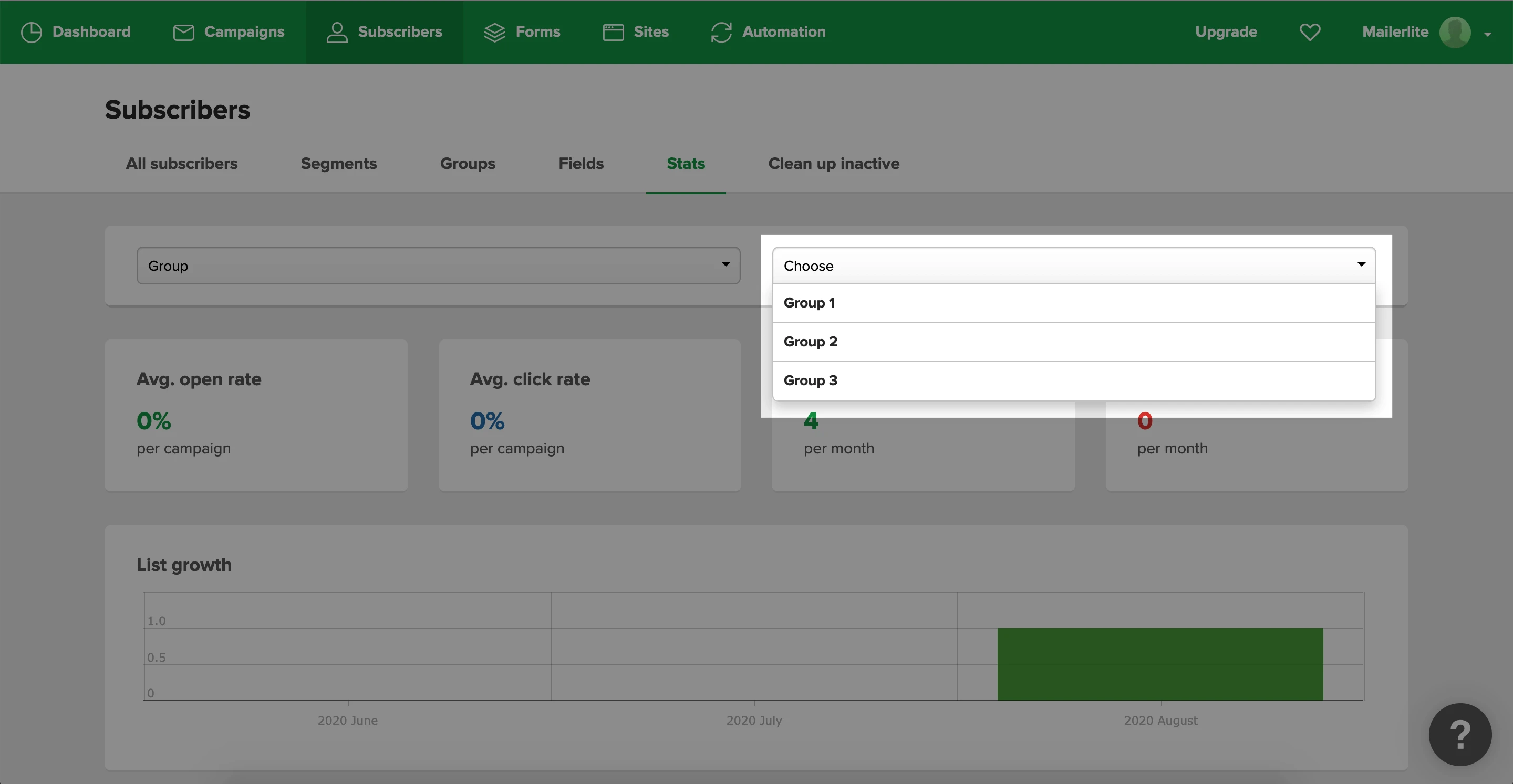 Here you can analyze the group’s open rate, click rate, subscribe rate and unsubscribe rate.
